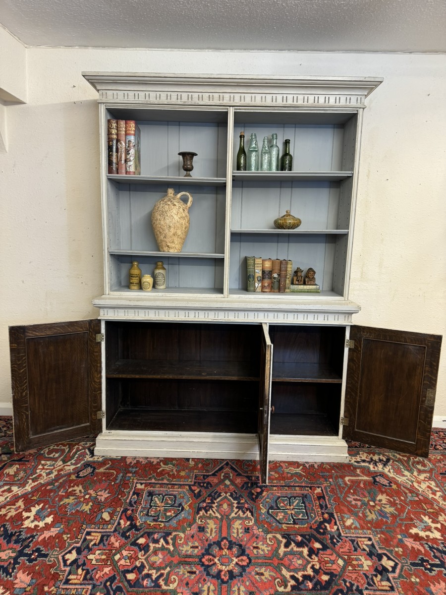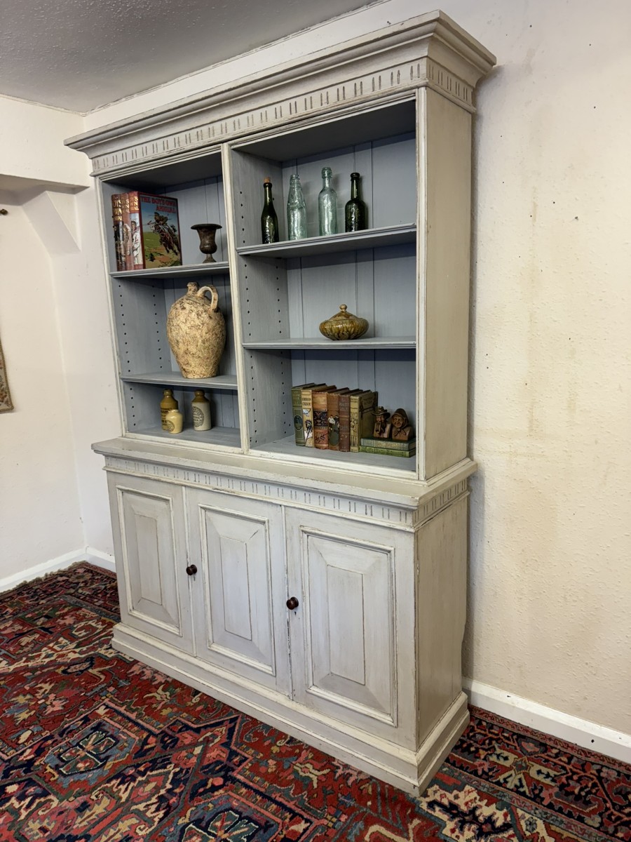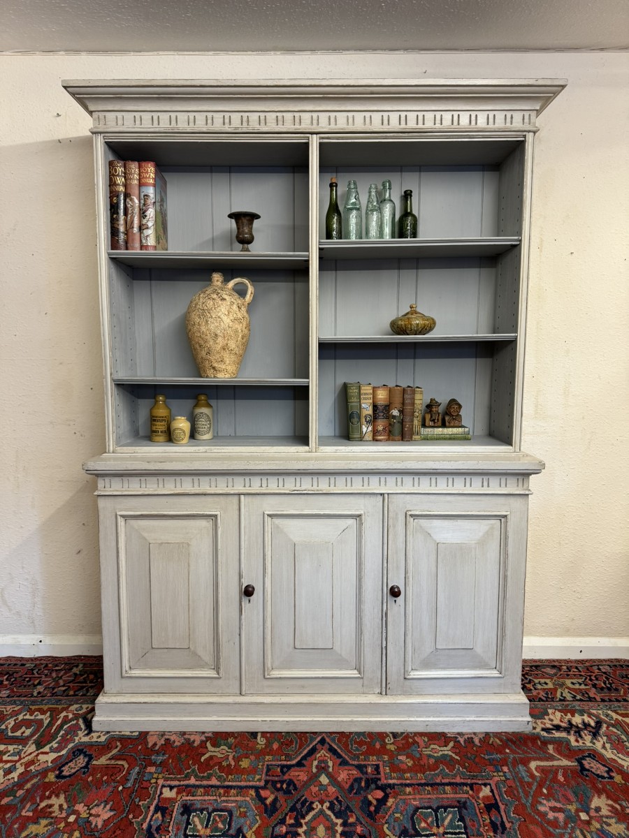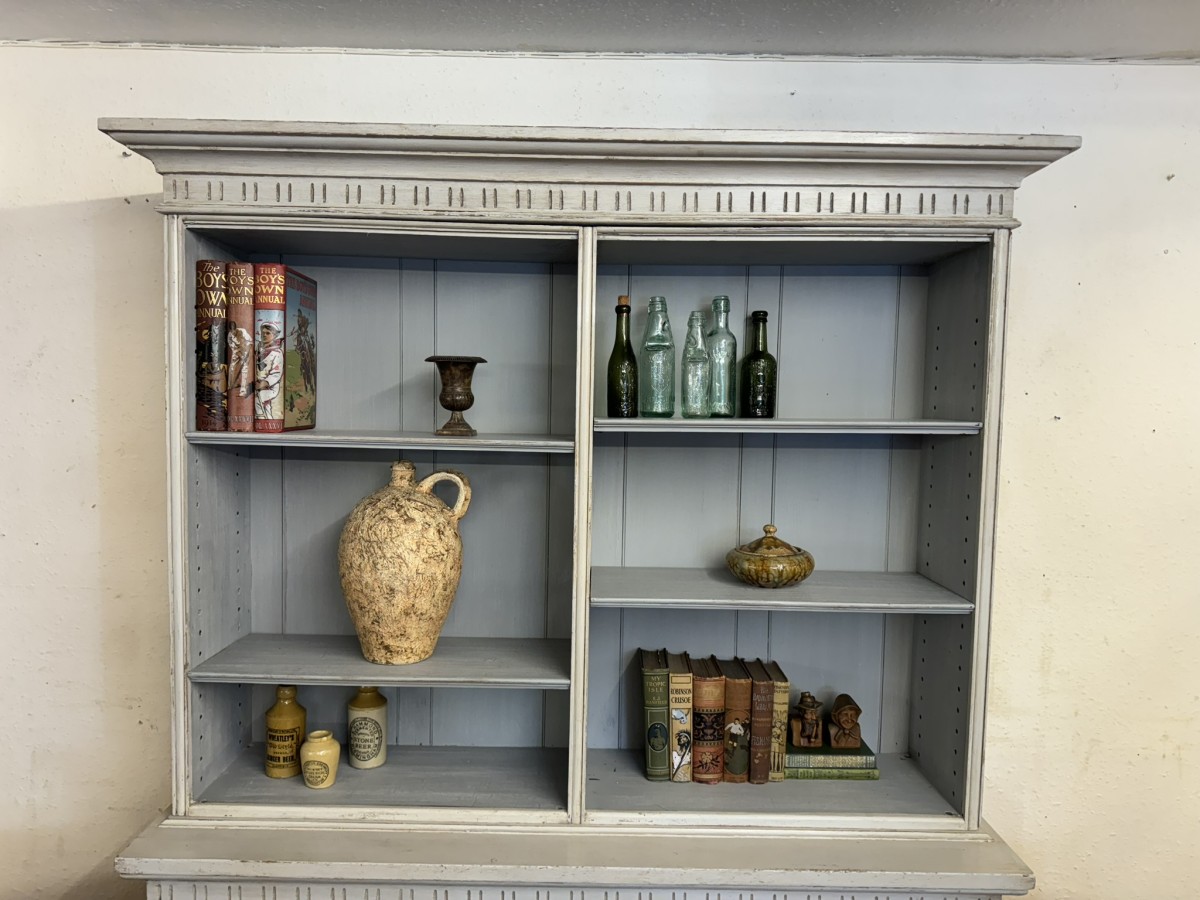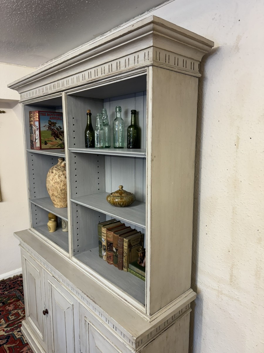 This stylish antique cupboard is in excellent condition. The oversailing carved cornice sits above an open section which consists of four adjustable and removable shelves, below are three fielded panelled cupboard doors, the doors open to reveal an adjustable and removable shelf. This fabulously versatile cupboard sits on a stepped plinth base.