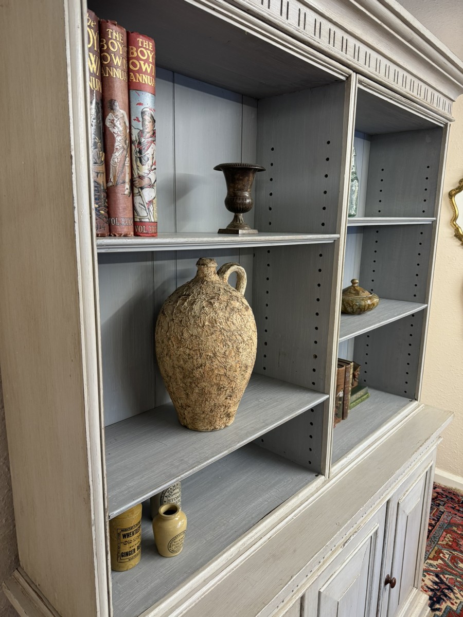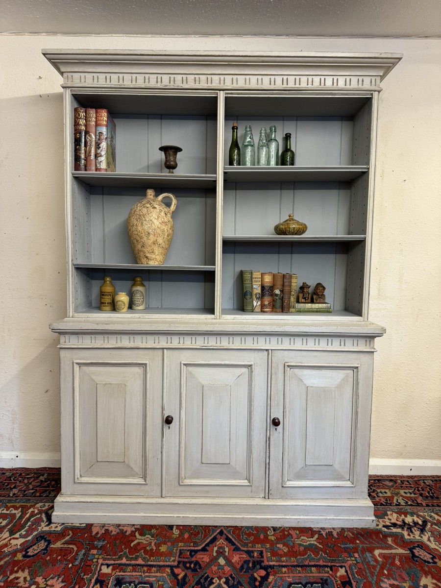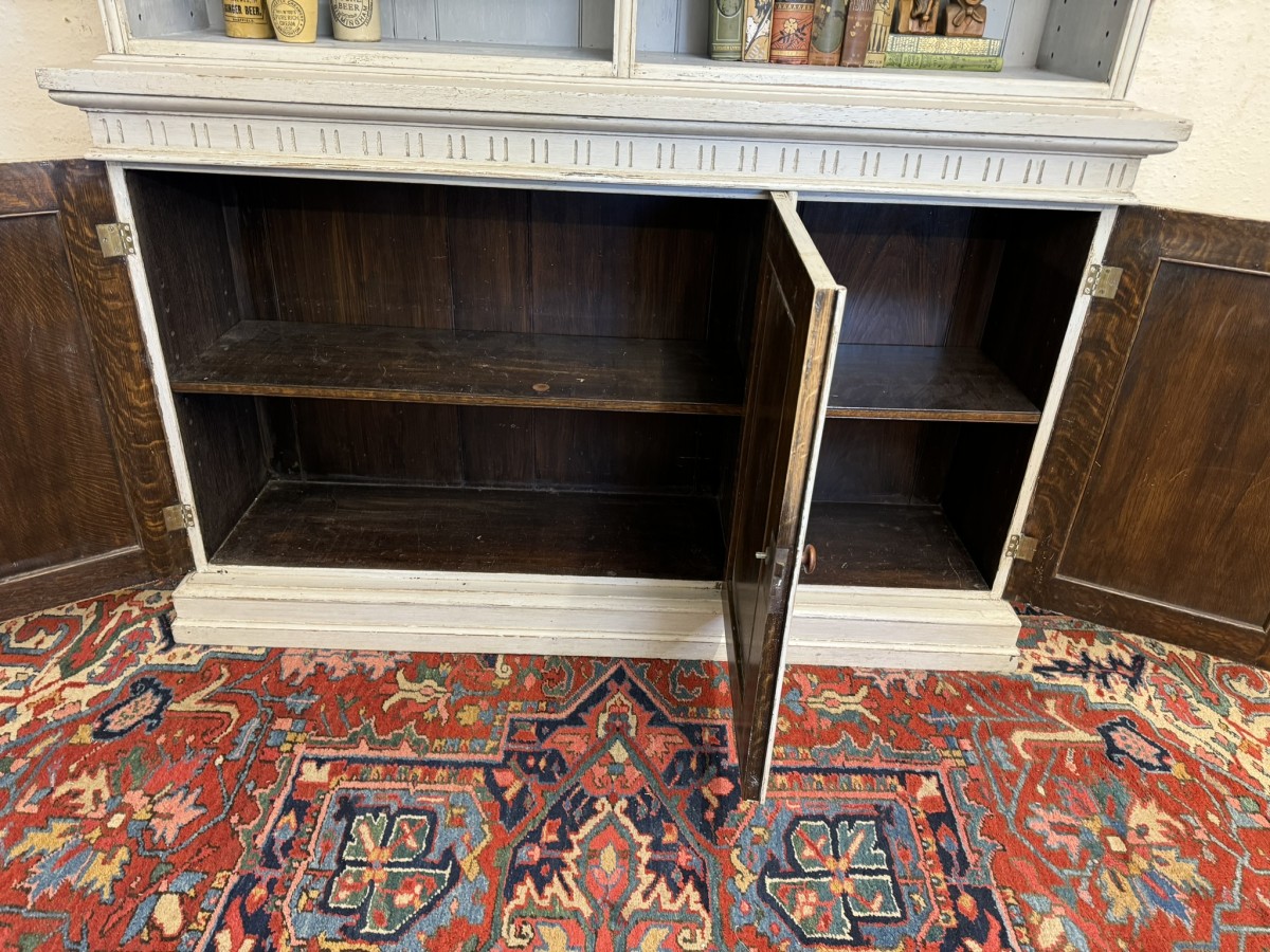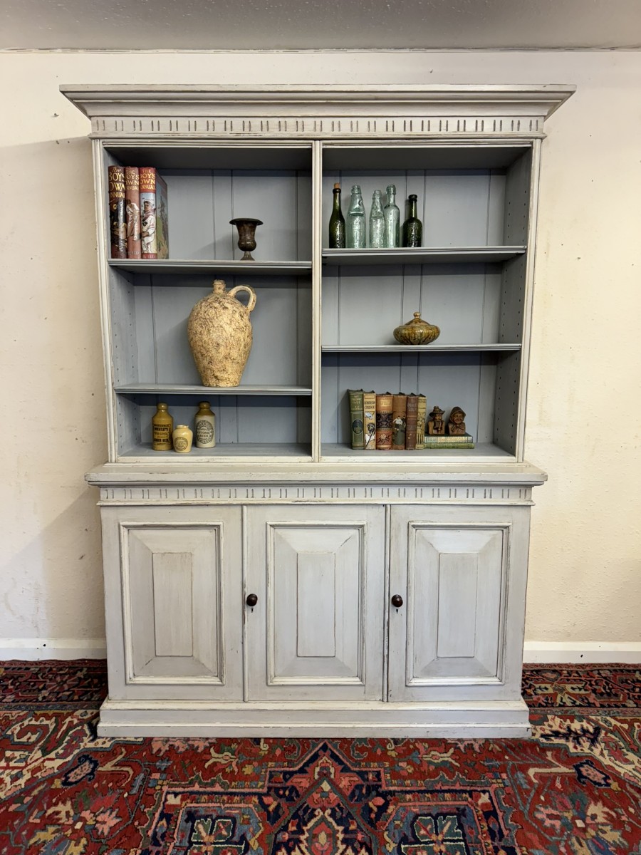 This stylish antique cupboard is in excellent condition. The oversailing carved cornice sits above an open section which consists of four adjustable and removable shelves, below are three fielded panelled cupboard doors, the doors open to reveal an adjustable and removable shelf. This fabulously versatile cupboard sits on a stepped plinth base.