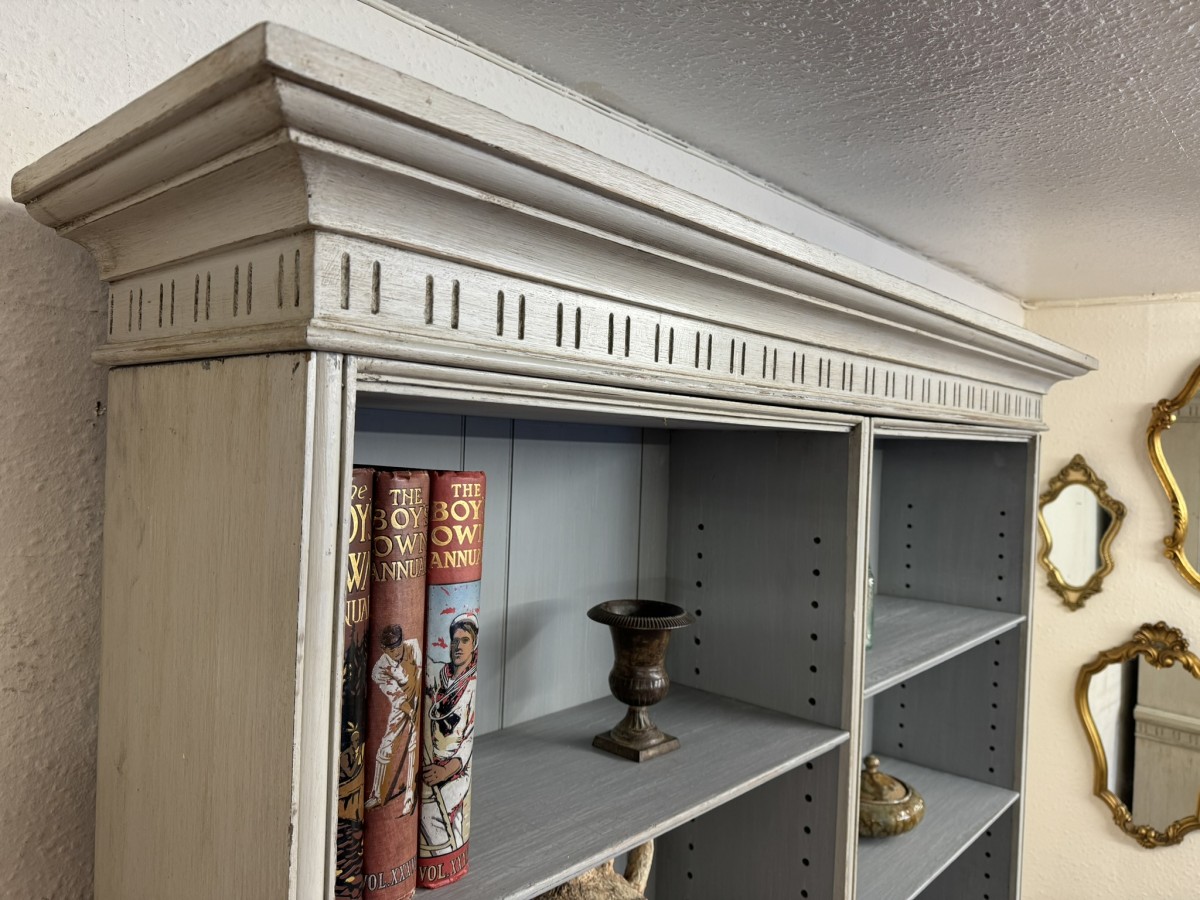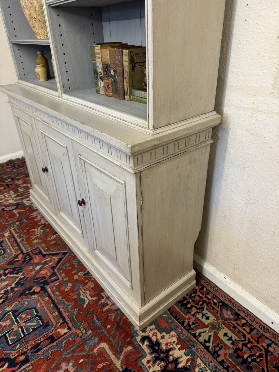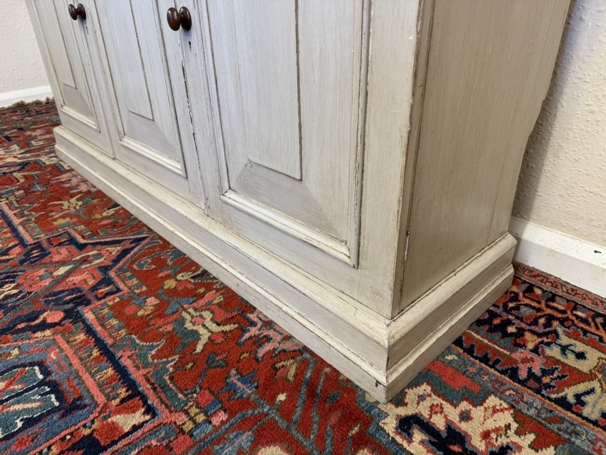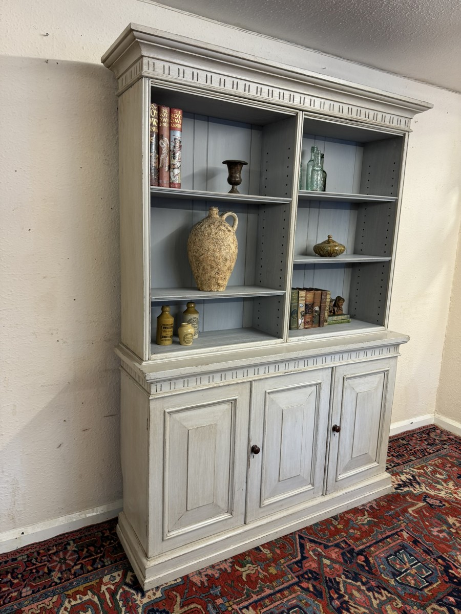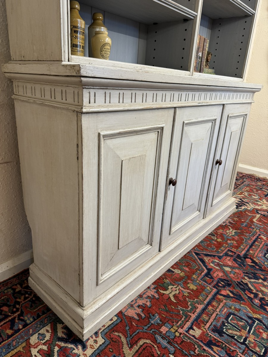 This stylish antique cupboard is in excellent condition. The oversailing carved cornice sits above an open section which consists of four adjustable and removable shelves, below are three fielded panelled cupboard doors, the doors open to reveal an adjustable and removable shelf. This fabulously versatile cupboard sits on a stepped plinth base.