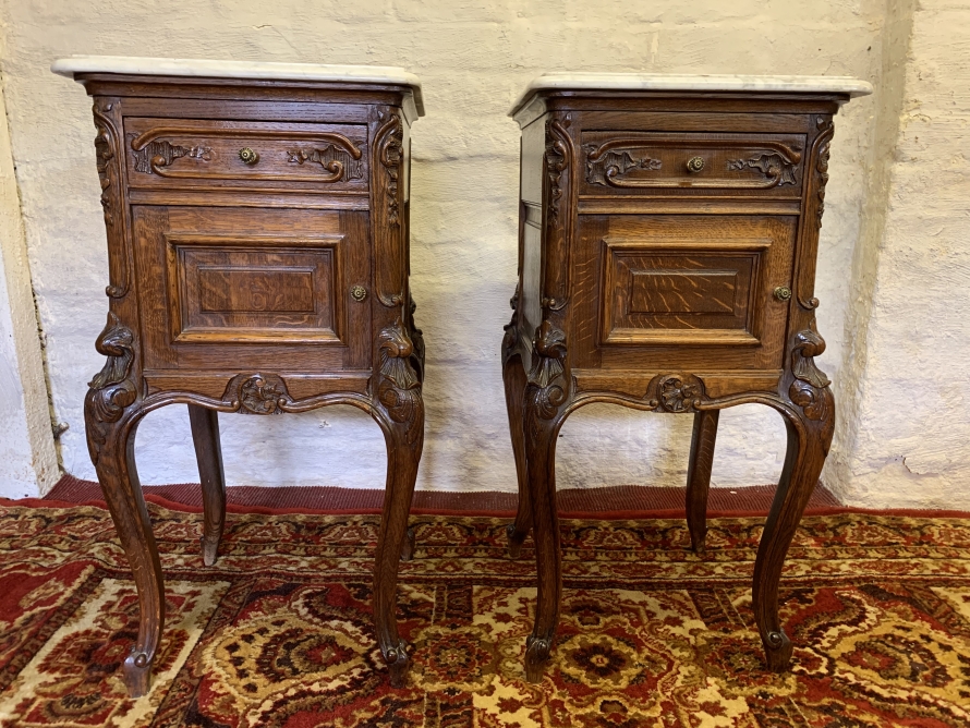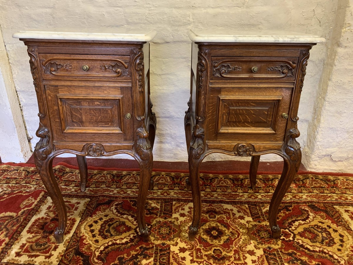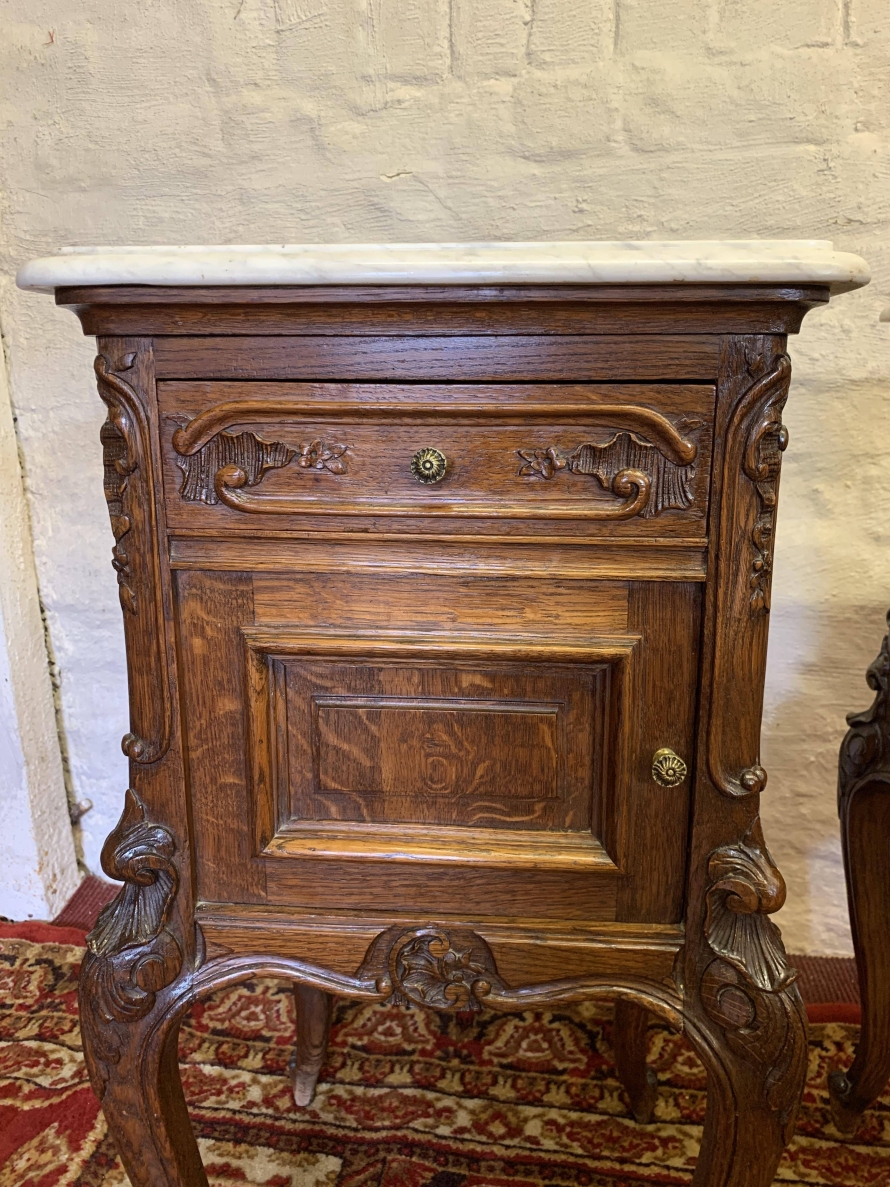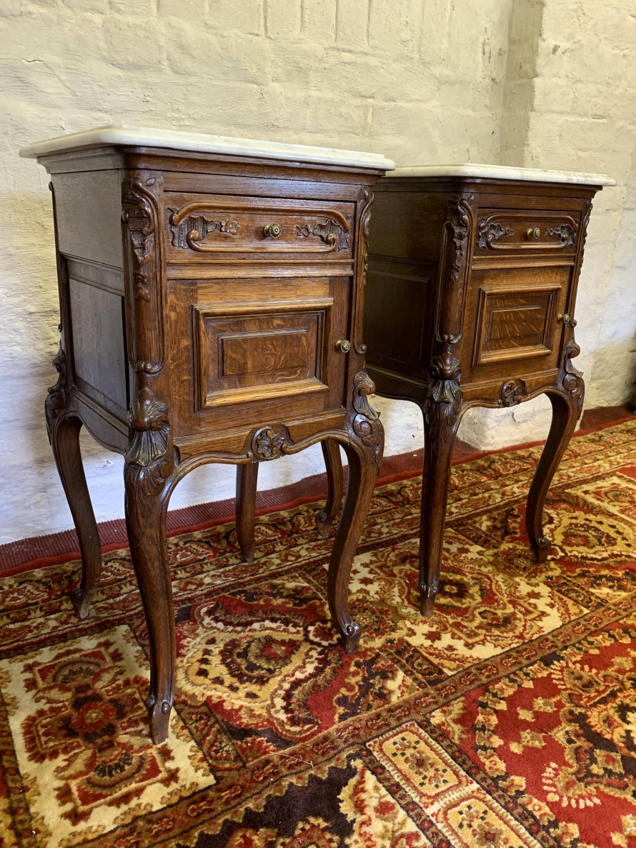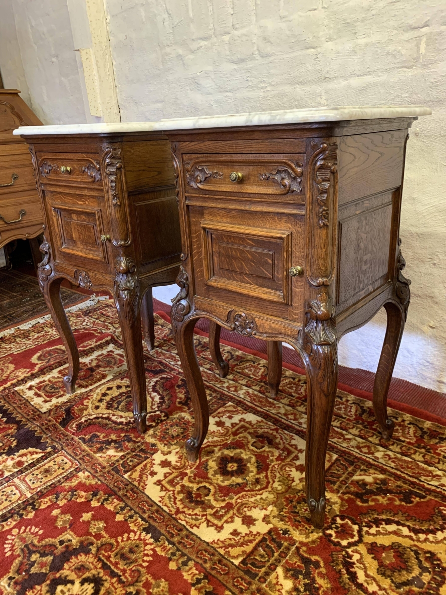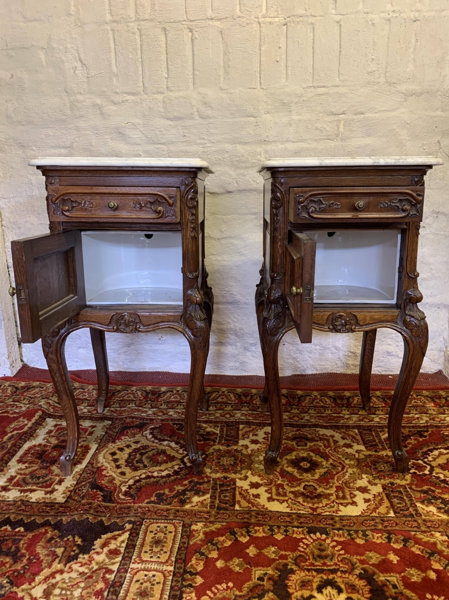 A fabulous pair of antique French carved oak bedside cabinets date circa 1890 and are in excellent condition. Each cabinet having a carrara marble top, carved recessed panelled drawer with decorative brass knob handle and recessed panelled cupboard door below, the door having decorative brass knob handle and opening to reveal a shaped pottery liner. Carvings to the four corners, recessed panelled sides, shaped carved skirt and standing on four elegant carved cabriole shaped legs.