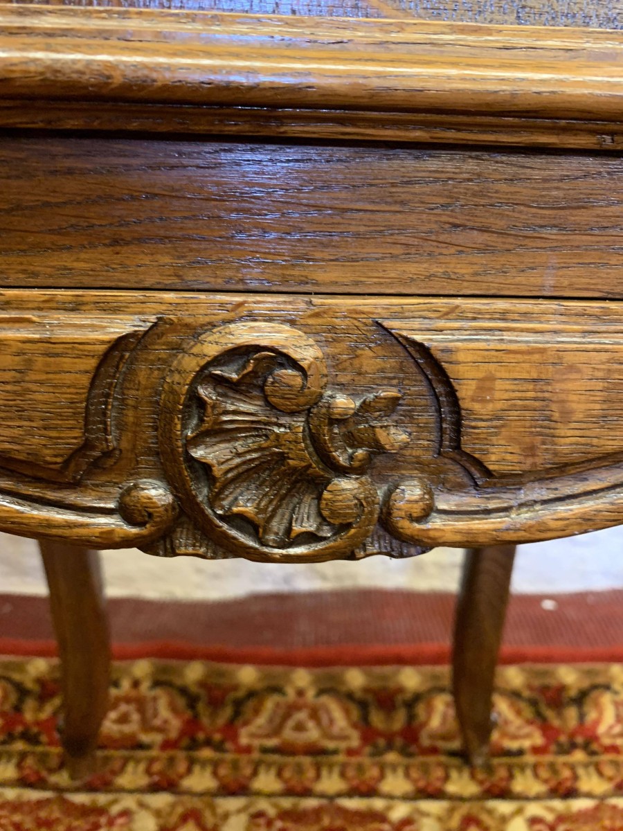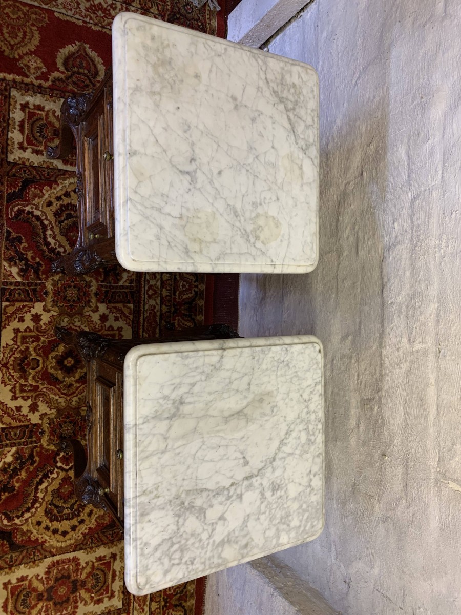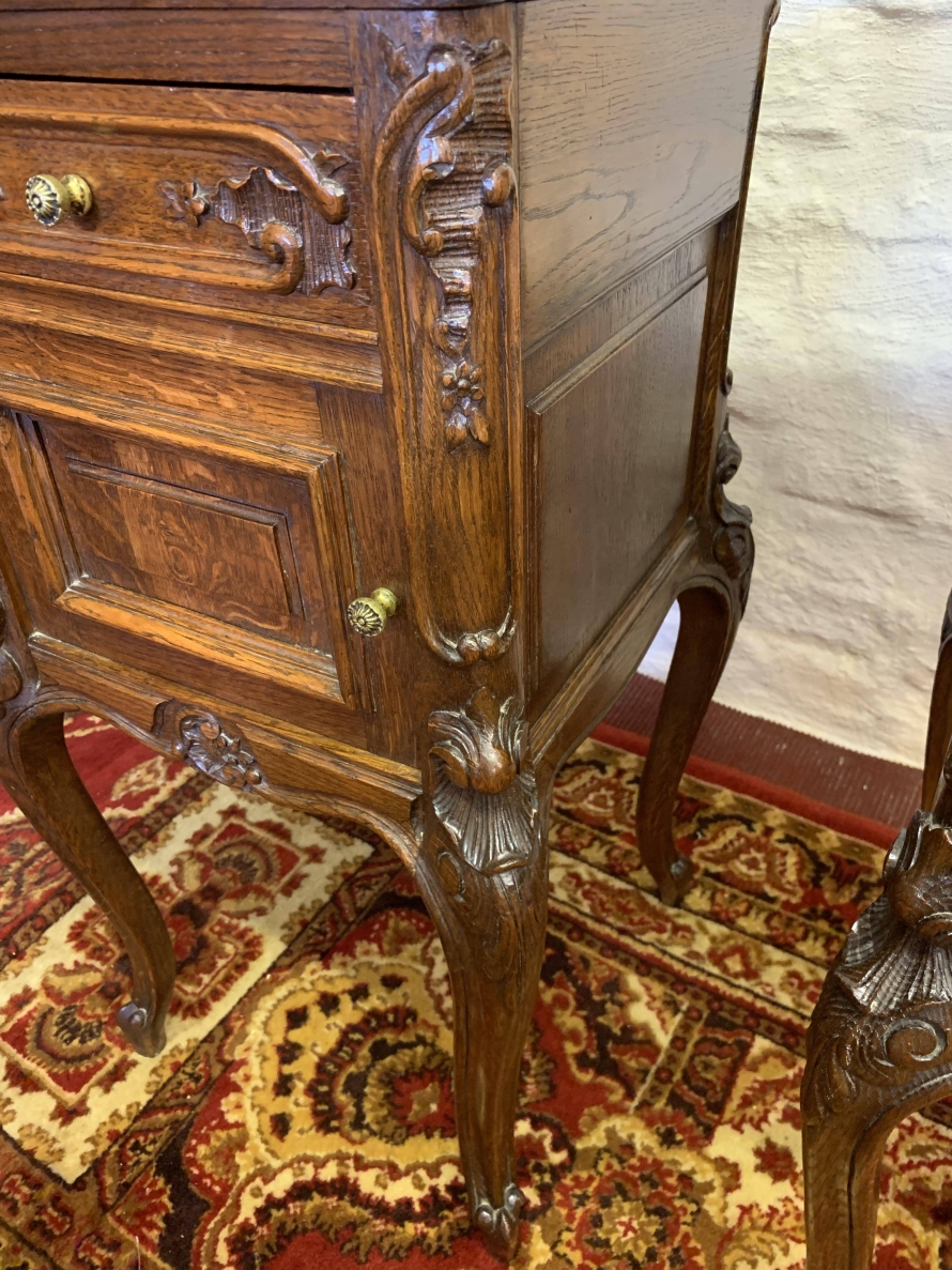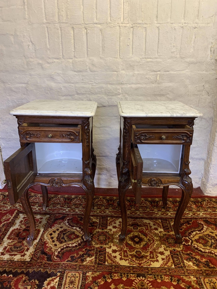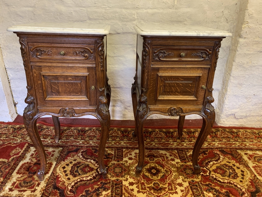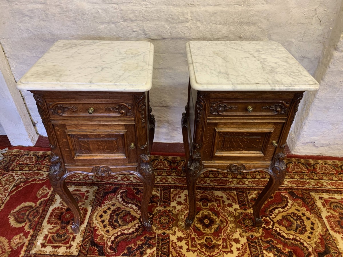 A fabulous pair of antique French carved oak bedside cabinets date circa 1890 and are in excellent condition. Each cabinet having a carrara marble top, carved recessed panelled drawer with decorative brass knob handle and recessed panelled cupboard door below, the door having decorative brass knob handle and opening to reveal a shaped pottery liner. Carvings to the four corners, recessed panelled sides, shaped carved skirt and standing on four elegant carved cabriole shaped legs.