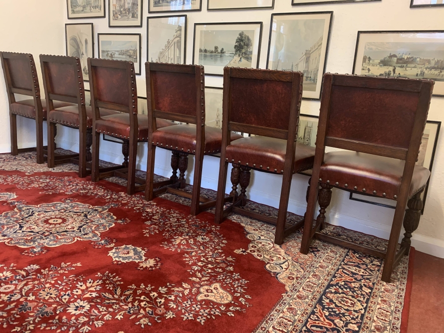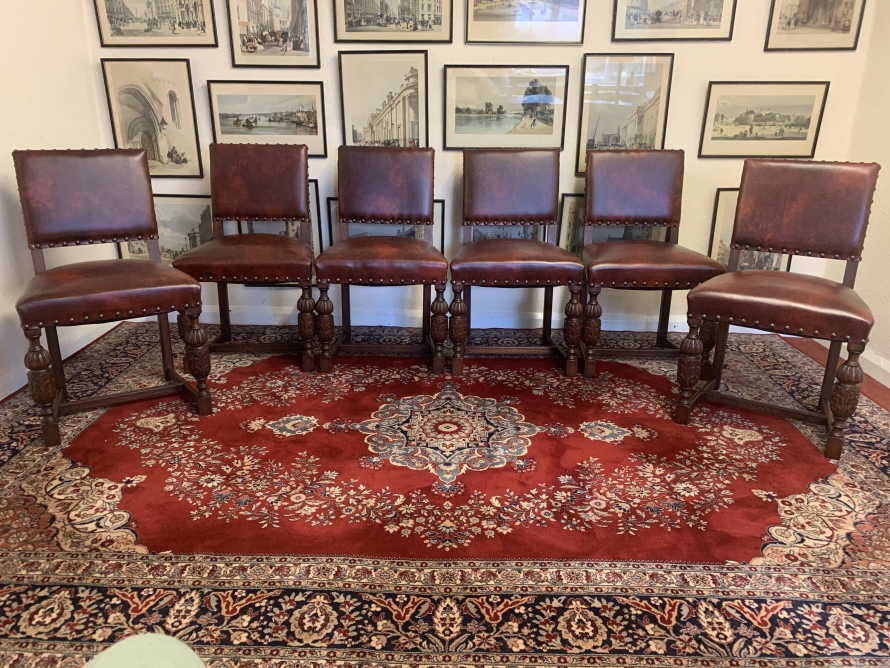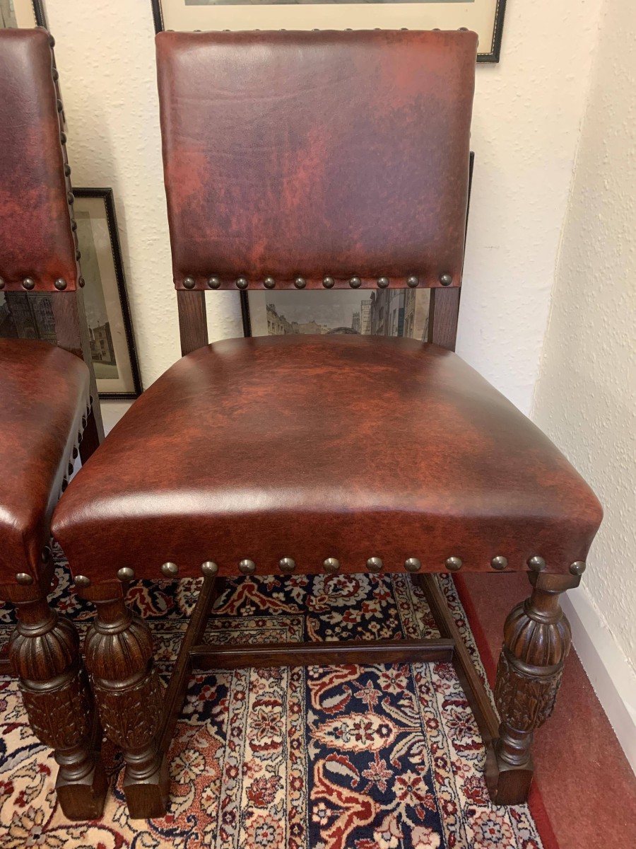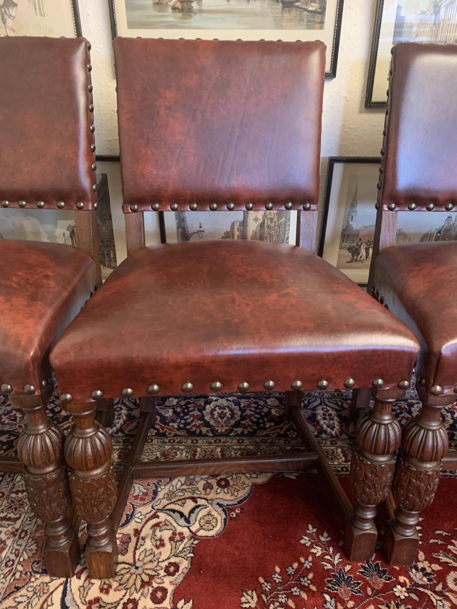 Stunning Antique Set Of Six Carved Oak Leather Upholstered Dining Chairs – Now Sold