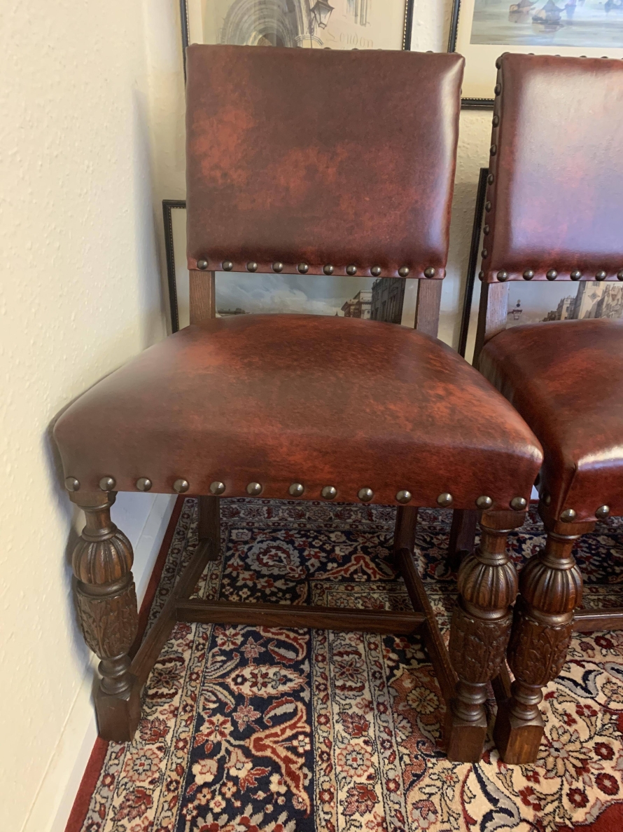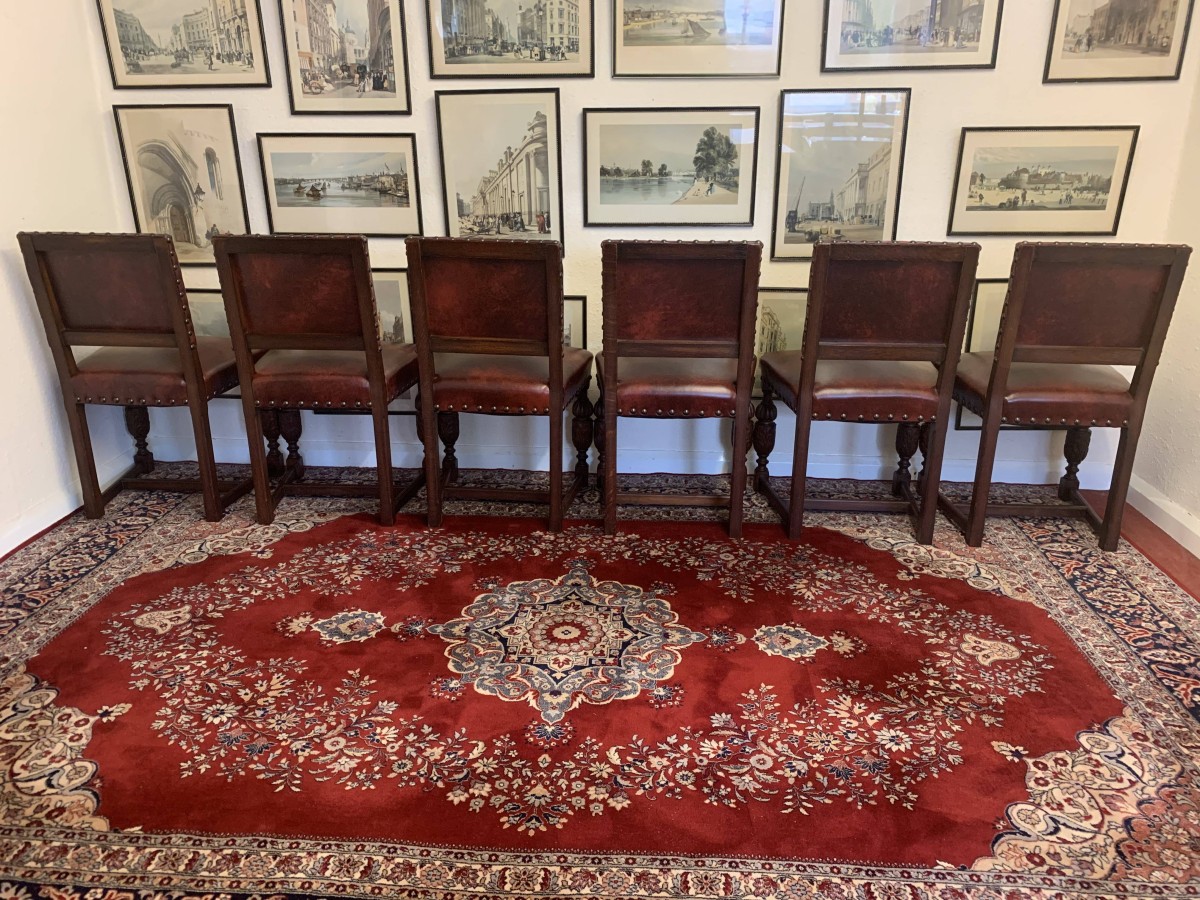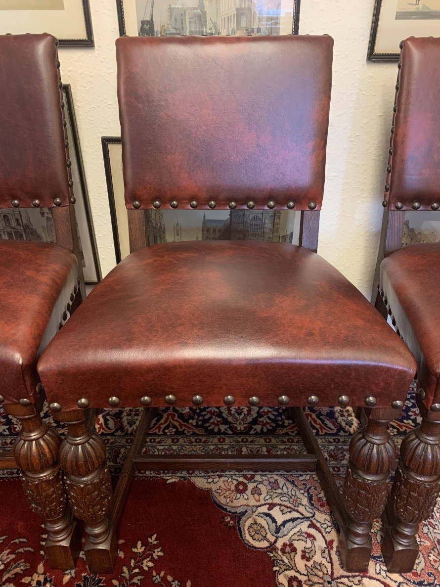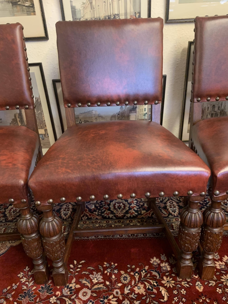 Stunning Antique Set Of Six Carved Oak Leather Upholstered Dining Chairs – Now Sold