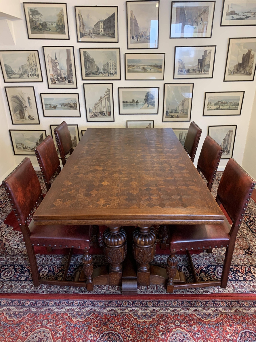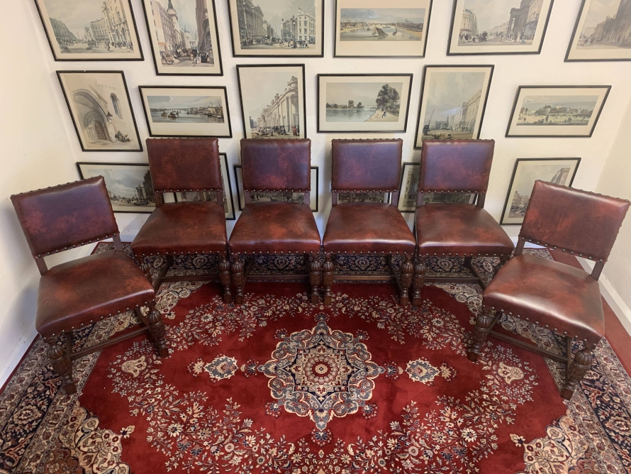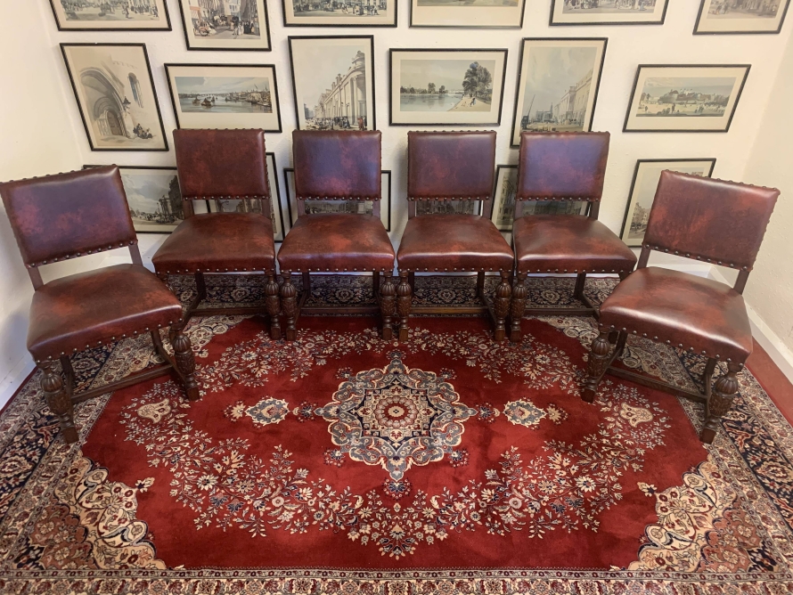 - Stunning Antique Set Of Six Carved Oak Leather Upholstered Dining Chairs – Now Sold