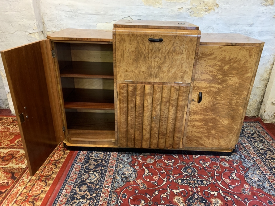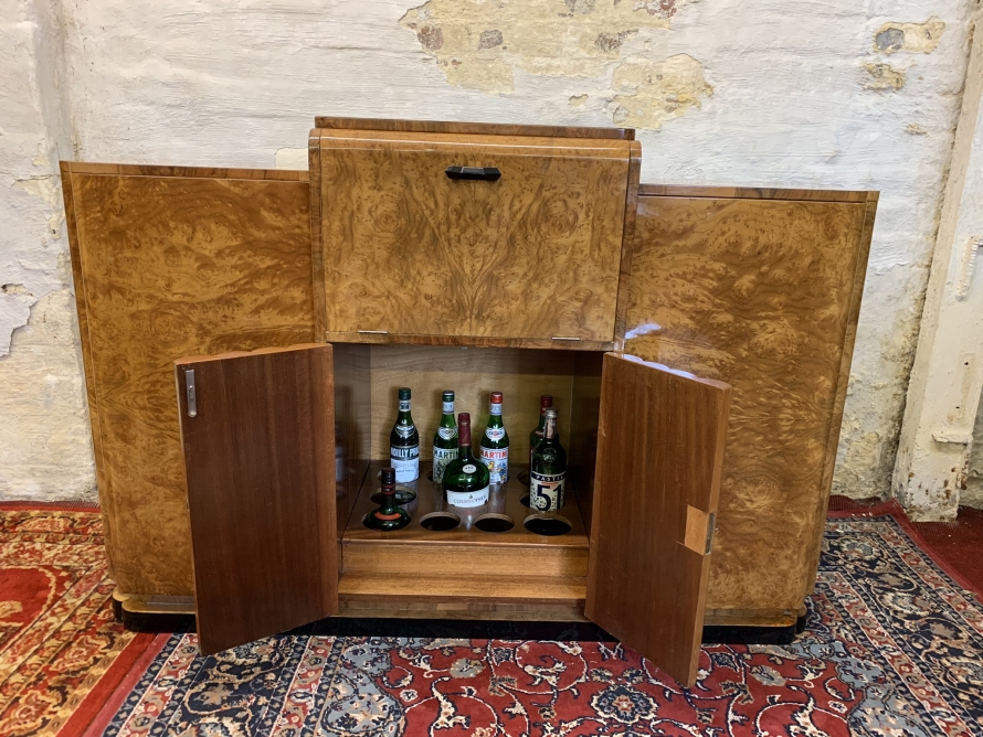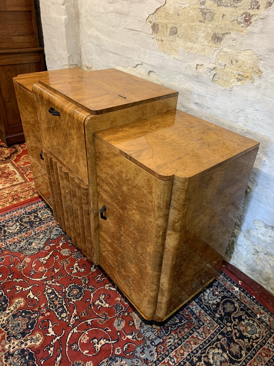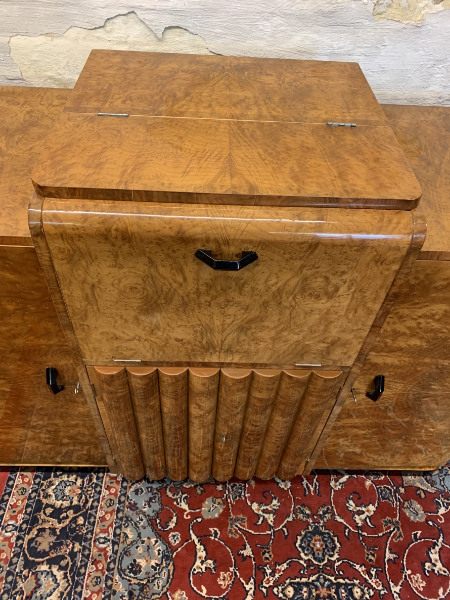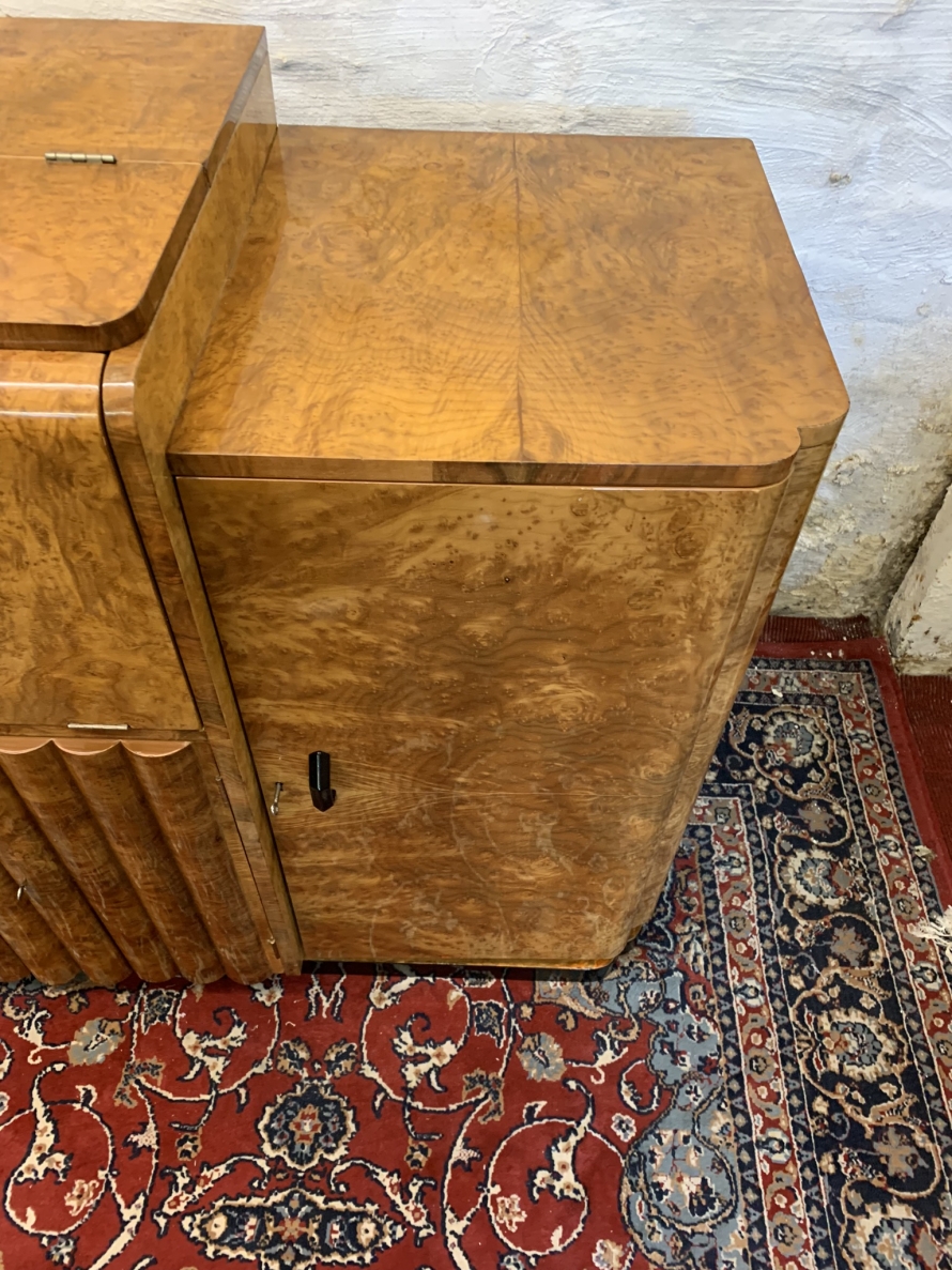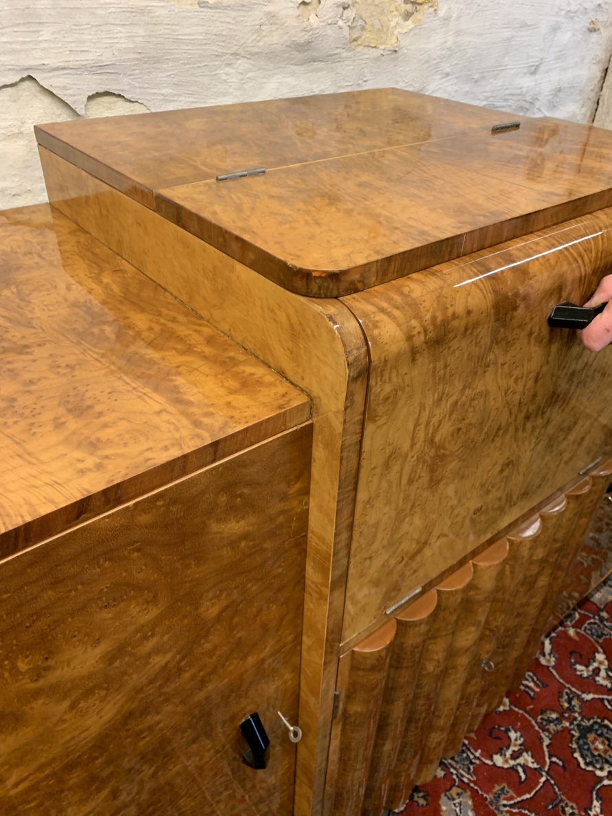 This stunning art deco cocktail cabinet dates circa 1925 and is produced in striking burr walnut. The drop down central section is mirrored throughout. Below is rolled pair of lockable doors, the doors open to reveal a bottle bank. The left-hand door opens to reveal two removable shelves. The right-hand door opens to reveal an open section above two drawers, each drawer having a drop handle. The cocktail cabnet has bakelite handles and sits on an ebony plinth base. A fabulously stylish art deco cocktail cabinet.
