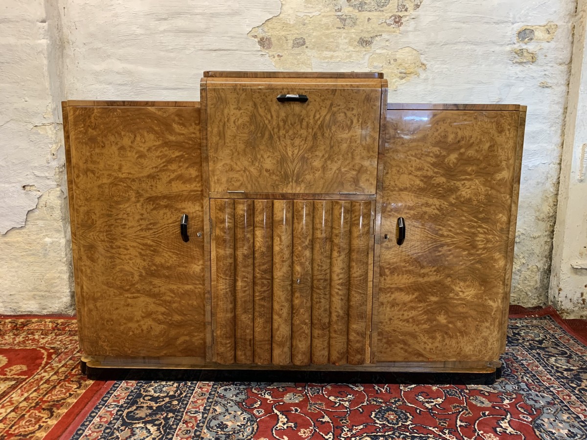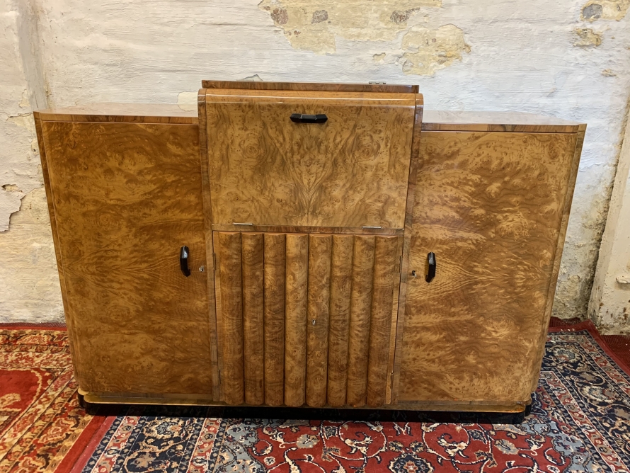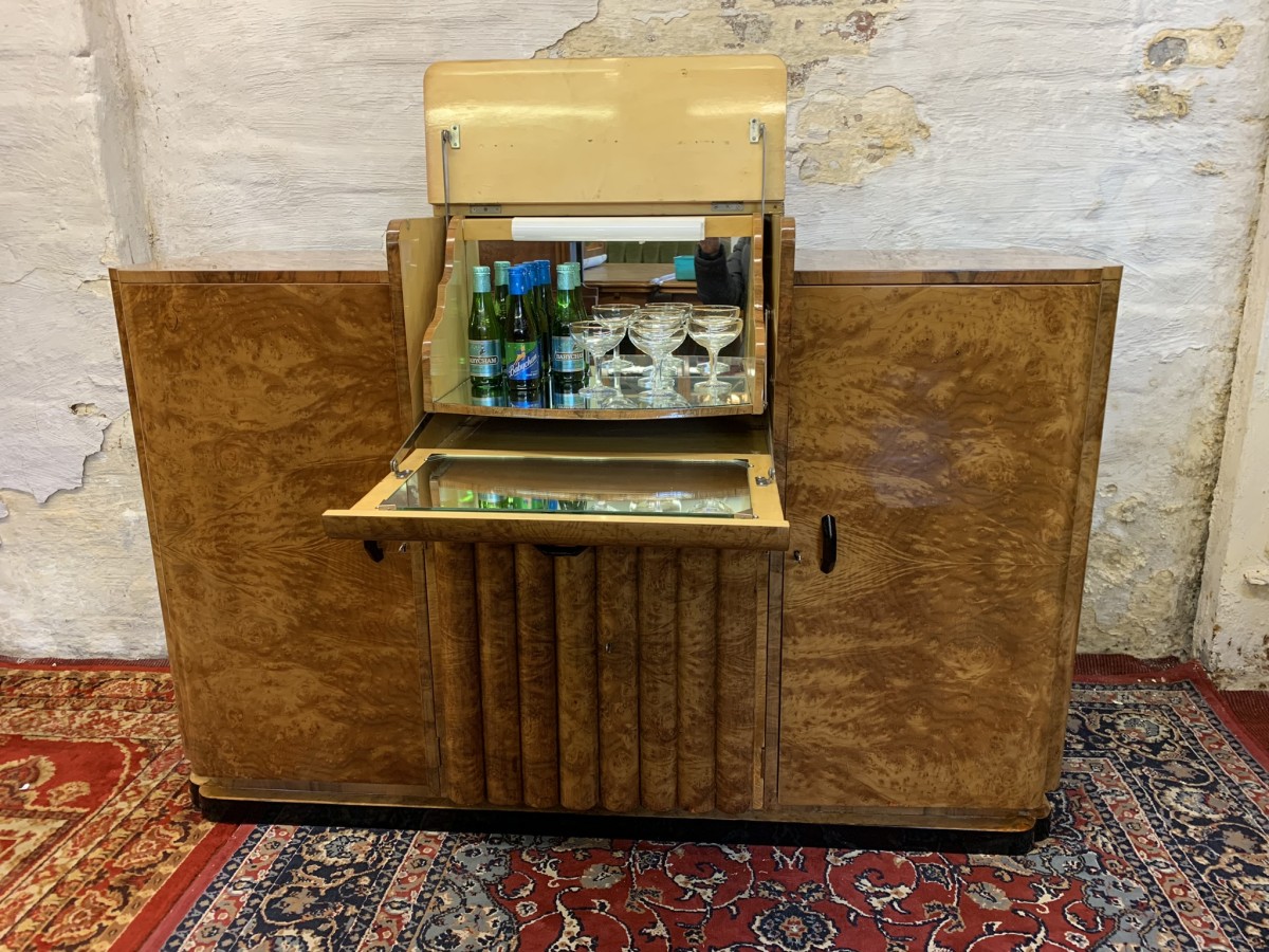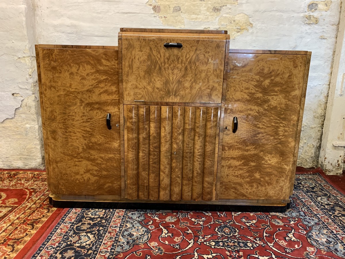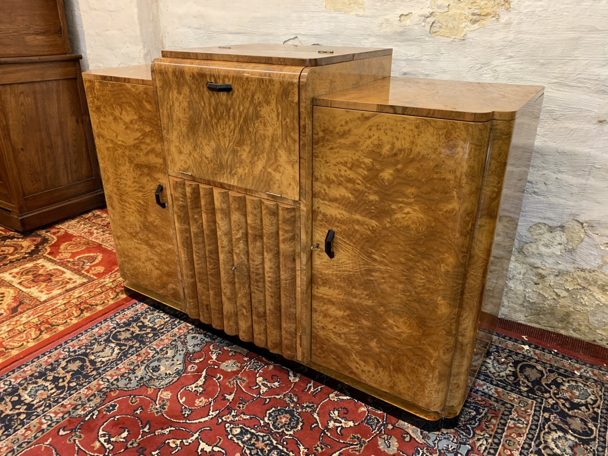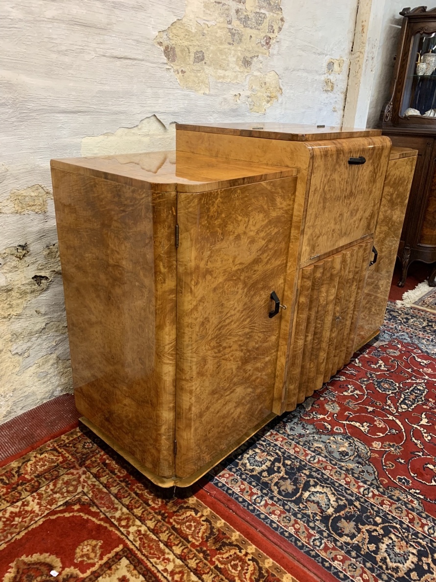 This stunning art deco cocktail cabinet dates circa 1925 and is produced in striking burr walnut. The drop down central section is mirrored throughout. Below is rolled pair of lockable doors, the doors open to reveal a bottle bank. The left-hand door opens to reveal two removable shelves. The right-hand door opens to reveal an open section above two drawers, each drawer having a drop handle. The cocktail cabnet has bakelite handles and sits on an ebony plinth base. A fabulously stylish art deco cocktail cabinet.