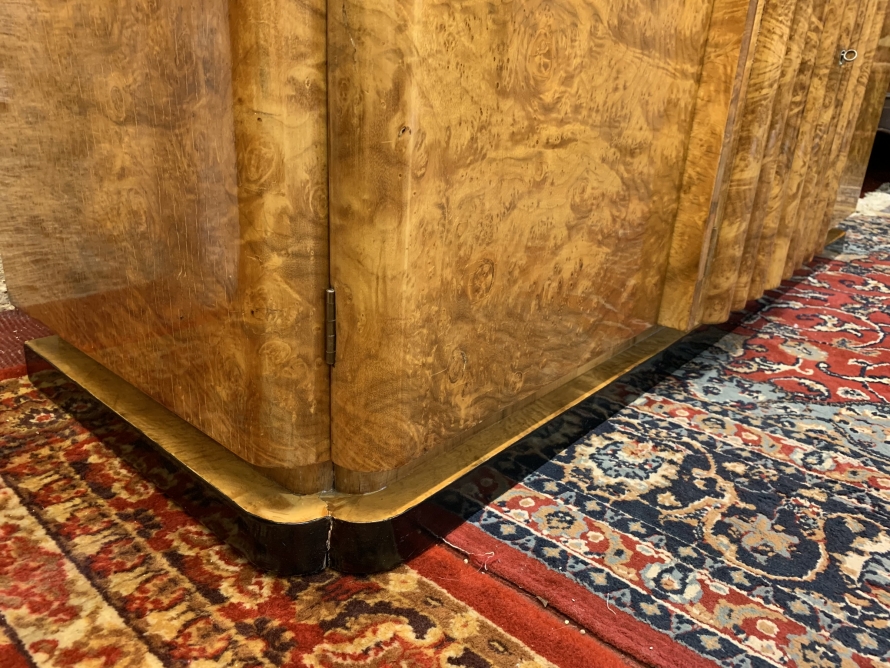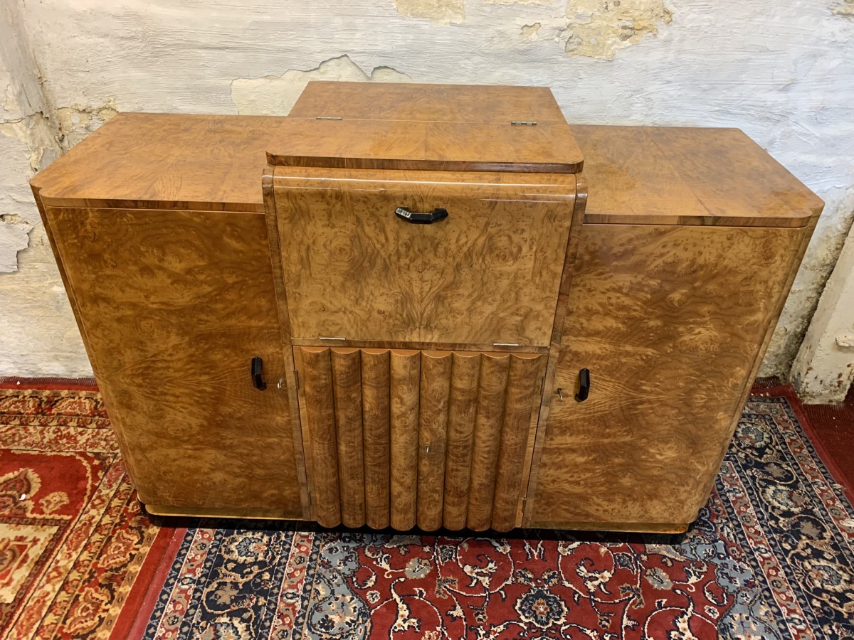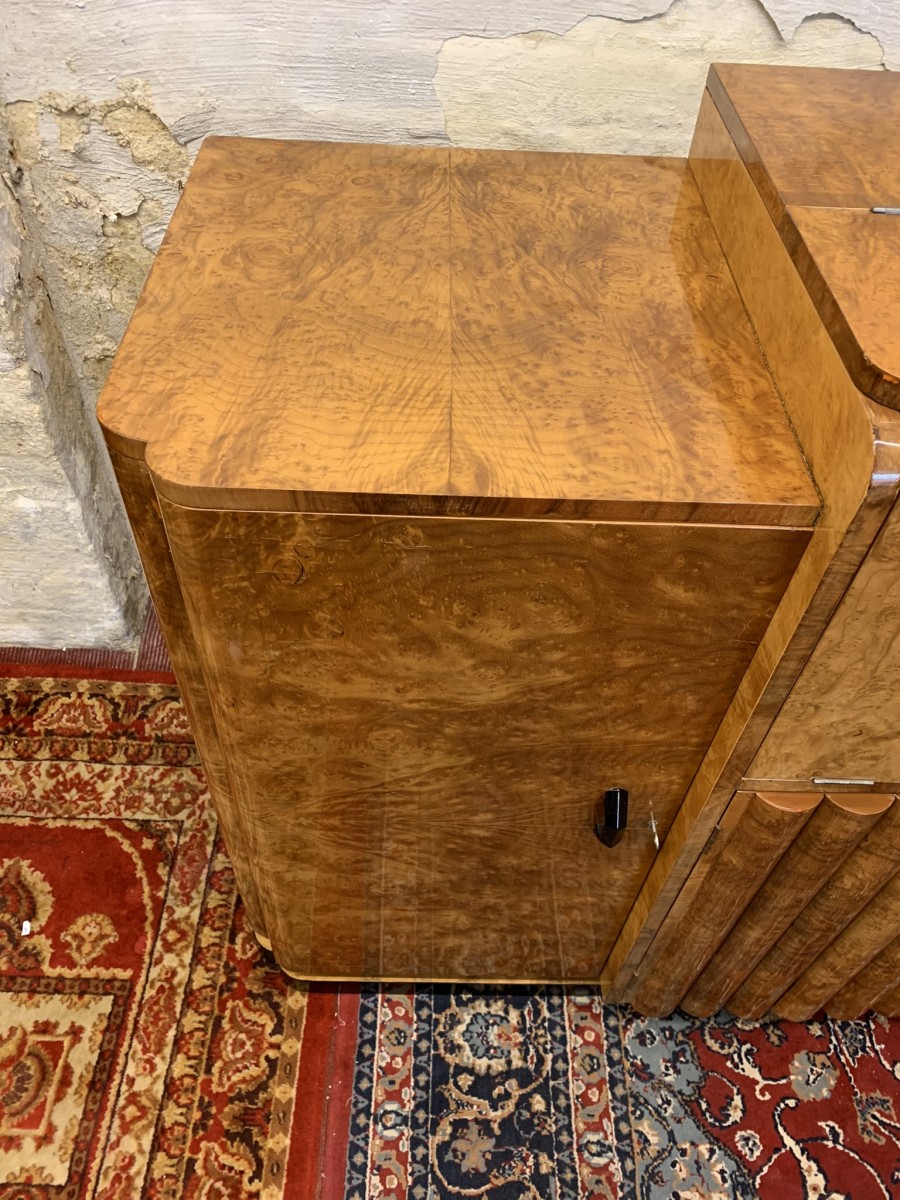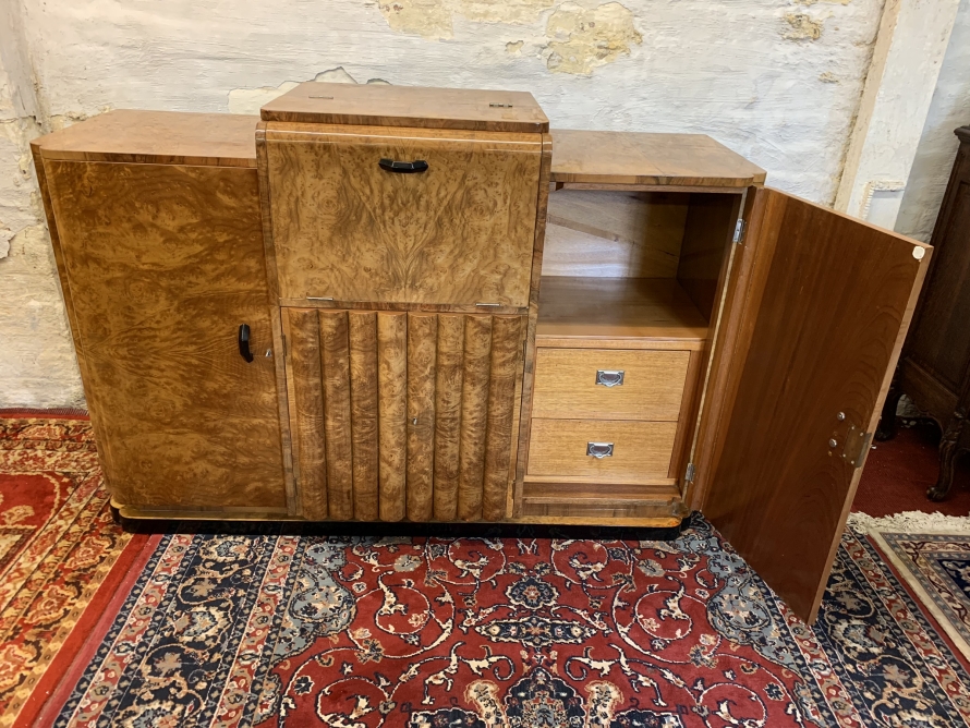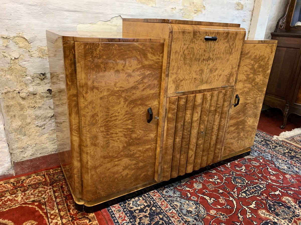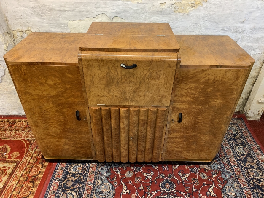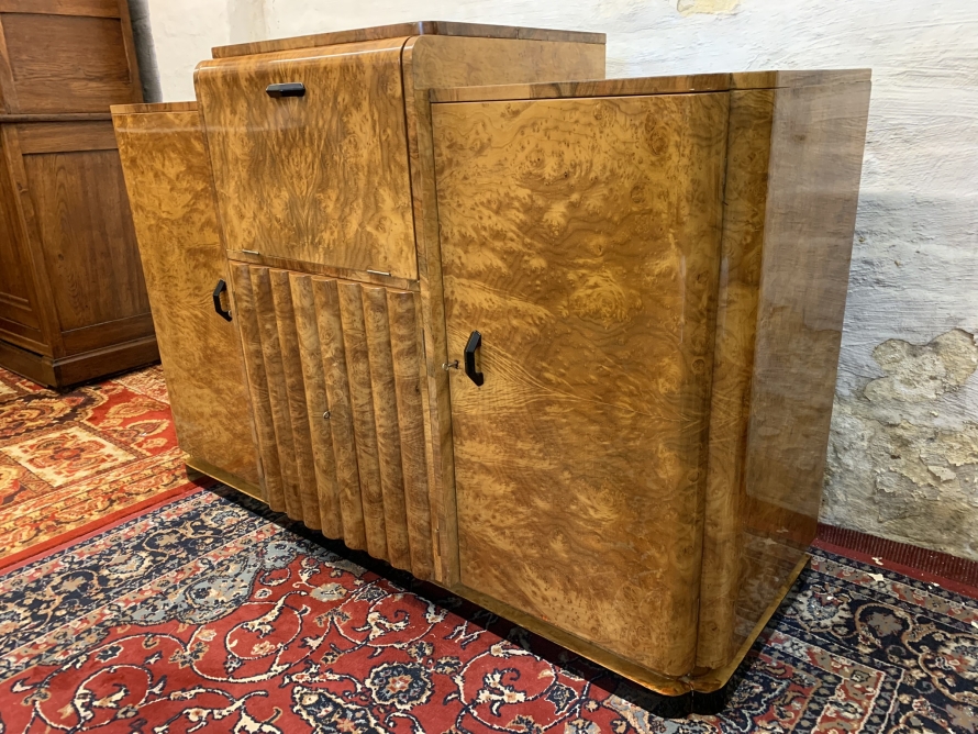 This stunning art deco cocktail cabinet dates circa 1925 and is produced in striking burr walnut. The drop down central section is mirrored throughout. Below is rolled pair of lockable doors, the doors open to reveal a bottle bank. The left-hand door opens to reveal two removable shelves. The right-hand door opens to reveal an open section above two drawers, each drawer having a drop handle. The cocktail cabnet has bakelite handles and sits on an ebony plinth base. A fabulously stylish art deco cocktail cabinet.
