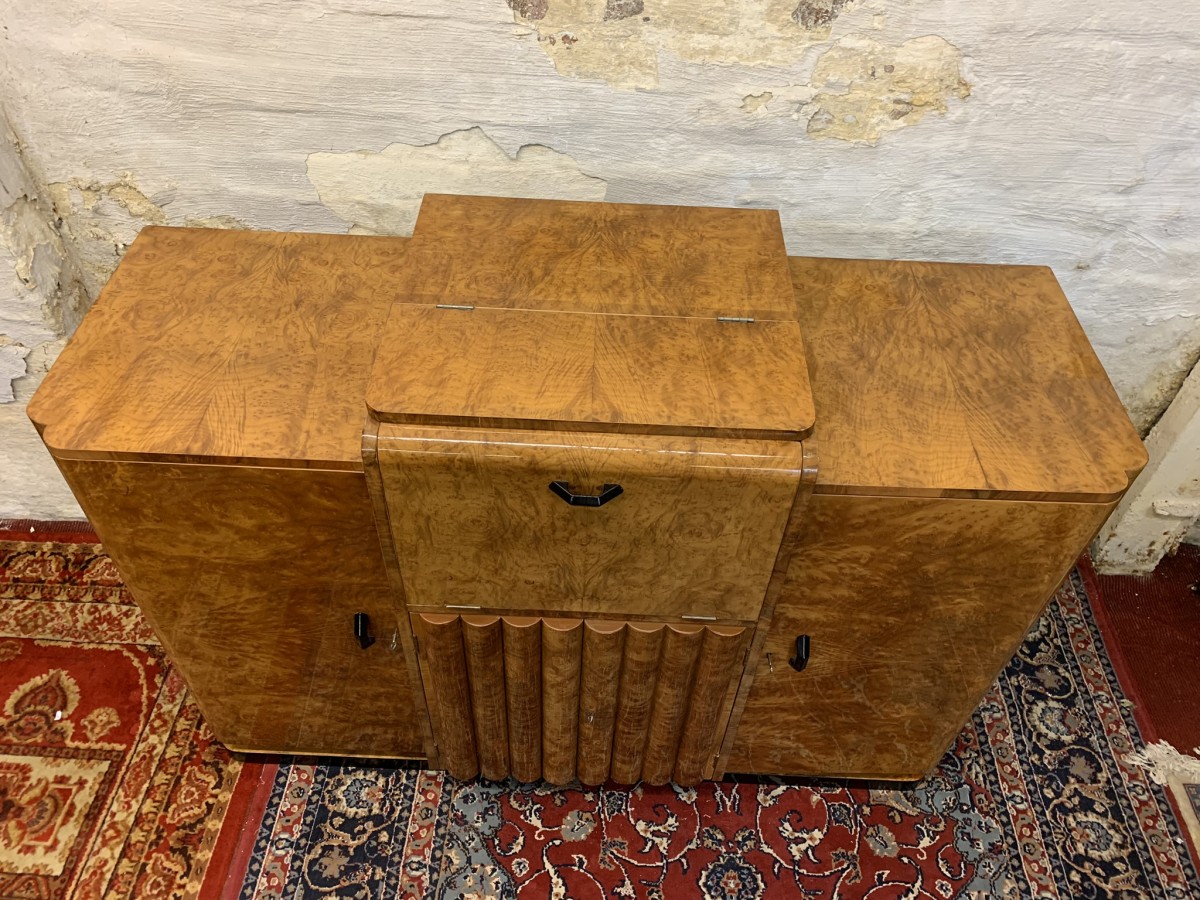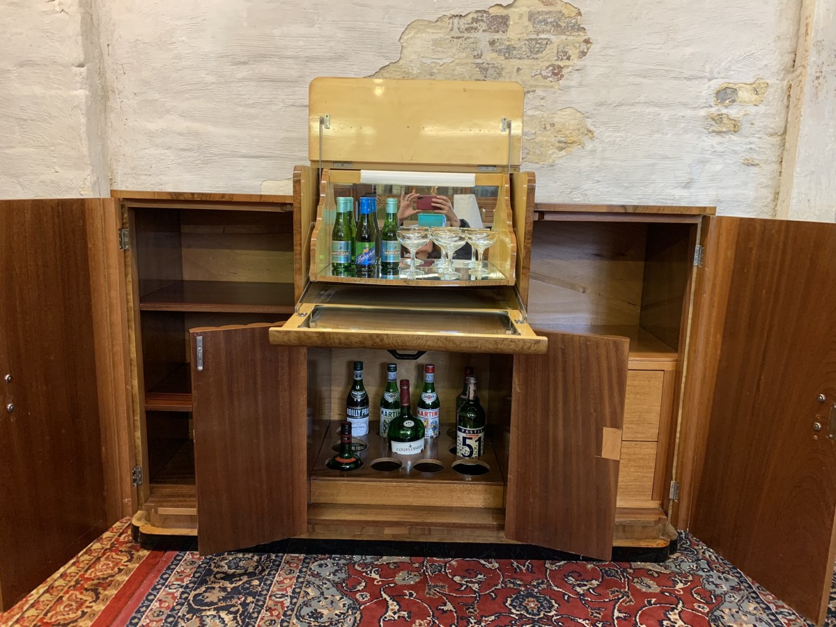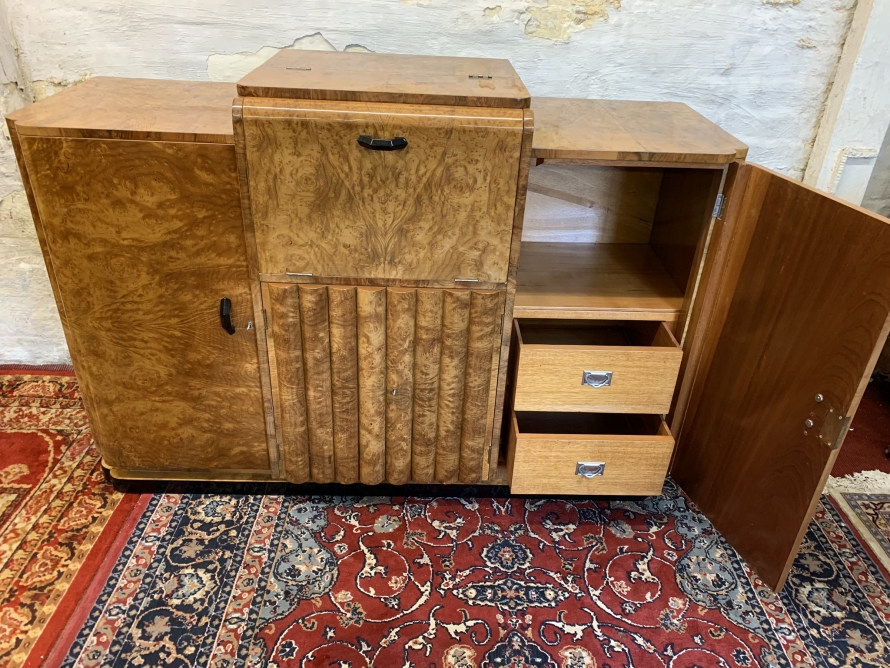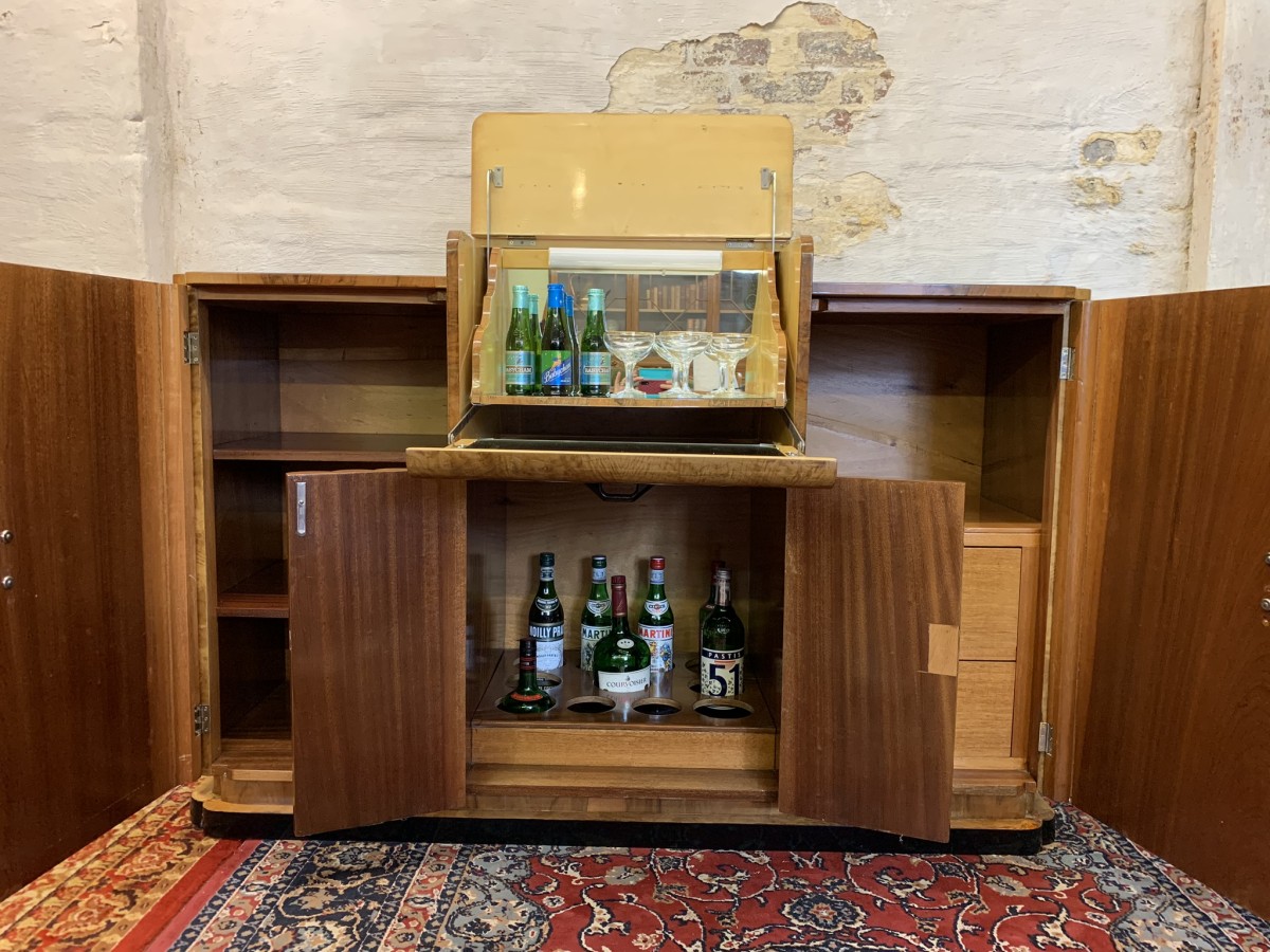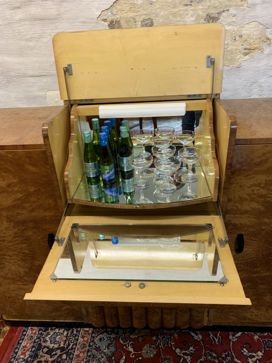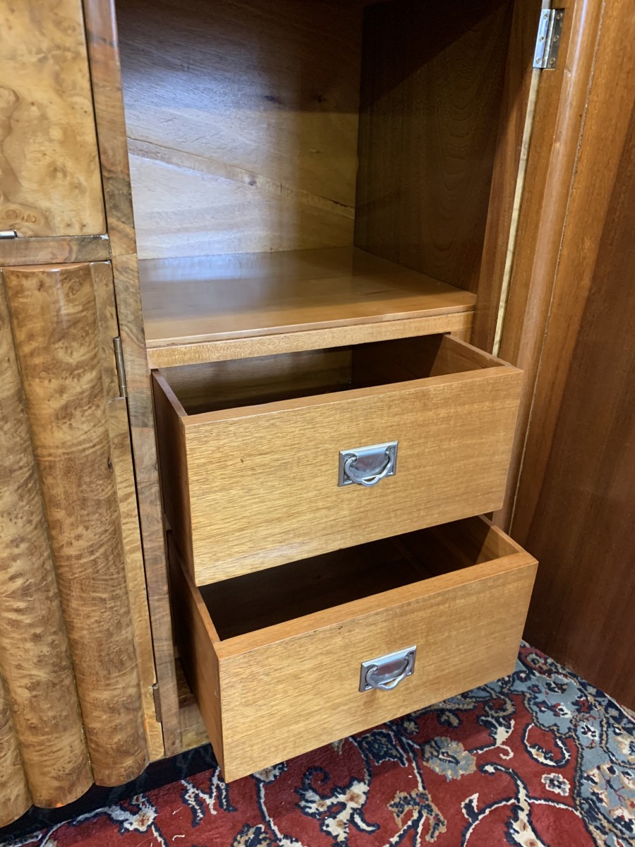 This stunning art deco cocktail cabinet dates circa 1925 and is produced in striking burr walnut. The drop down central section is mirrored throughout. Below is rolled pair of lockable doors, the doors open to reveal a bottle bank. The left-hand door opens to reveal two removable shelves. The right-hand door opens to reveal an open section above two drawers, each drawer having a drop handle. The cocktail cabnet has bakelite handles and sits on an ebony plinth base. A fabulously stylish art deco cocktail cabinet.