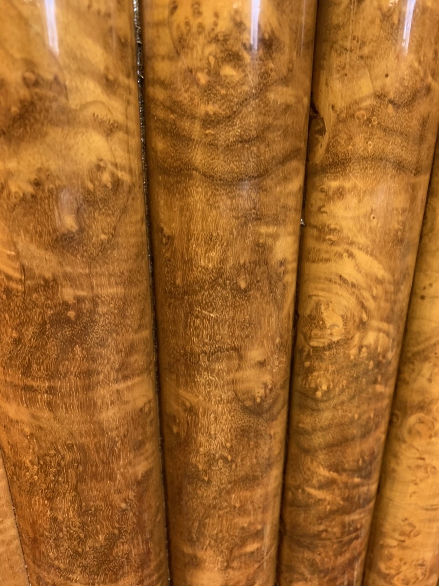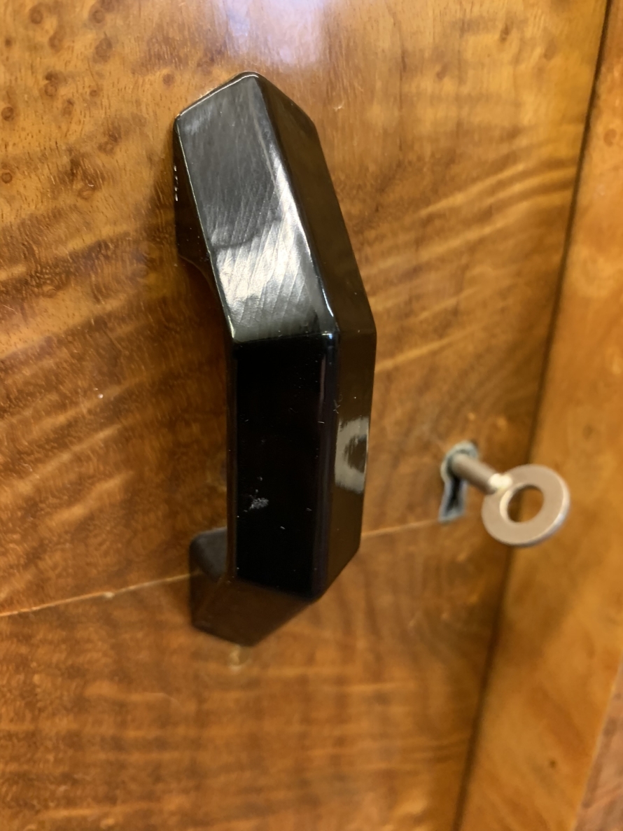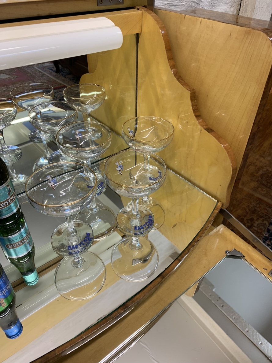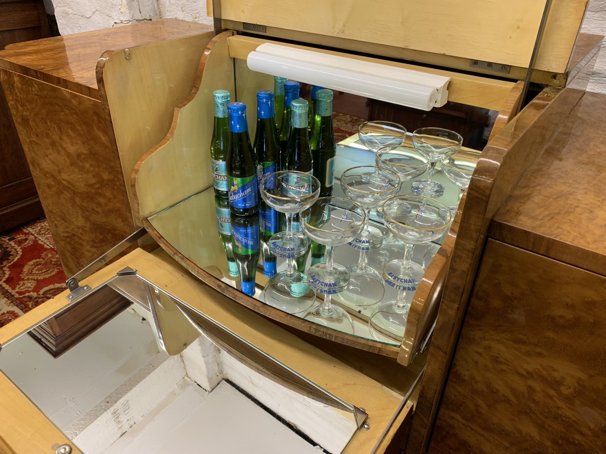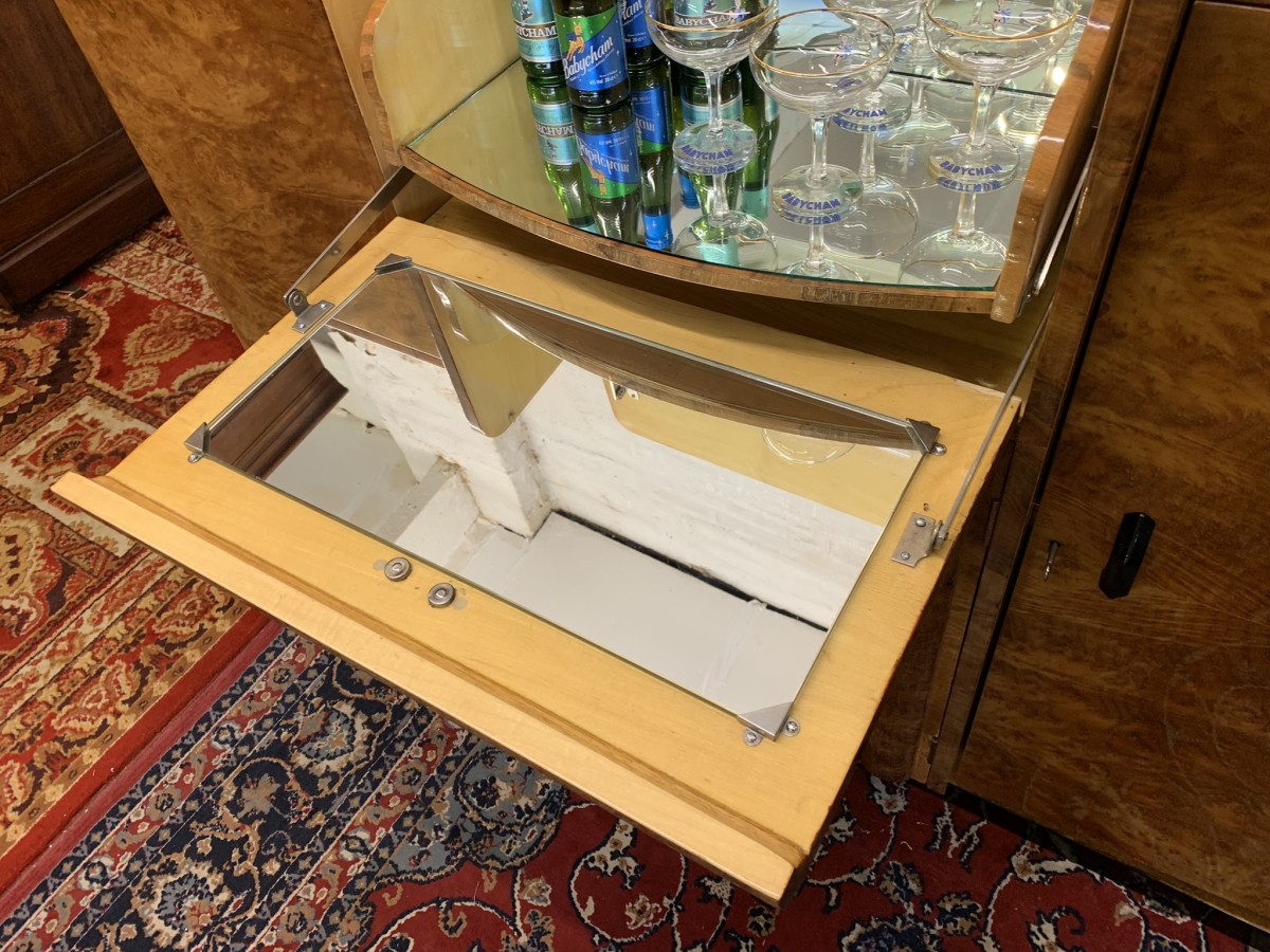 This stunning art deco cocktail cabinet dates circa 1925 and is produced in striking burr walnut. The drop down central section is mirrored throughout. Below is rolled pair of lockable doors, the doors open to reveal a bottle bank. The left-hand door opens to reveal two removable shelves. The right-hand door opens to reveal an open section above two drawers, each drawer having a drop handle. The cocktail cabnet has bakelite handles and sits on an ebony plinth base. A fabulously stylish art deco cocktail cabinet.
