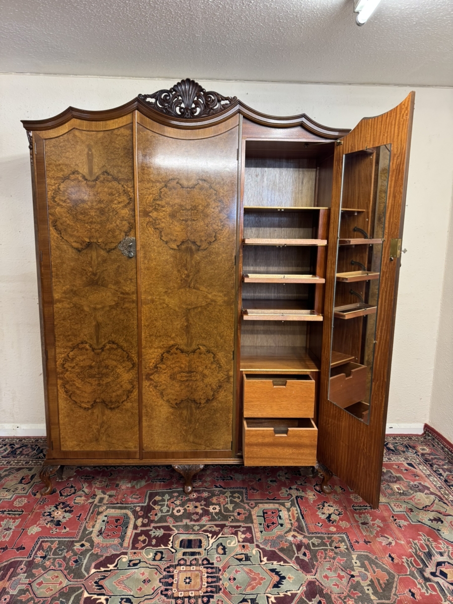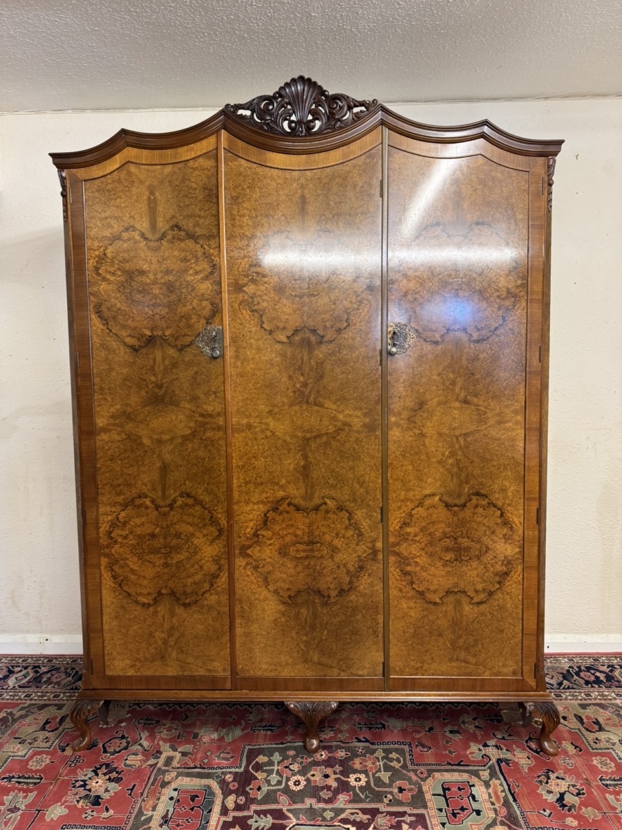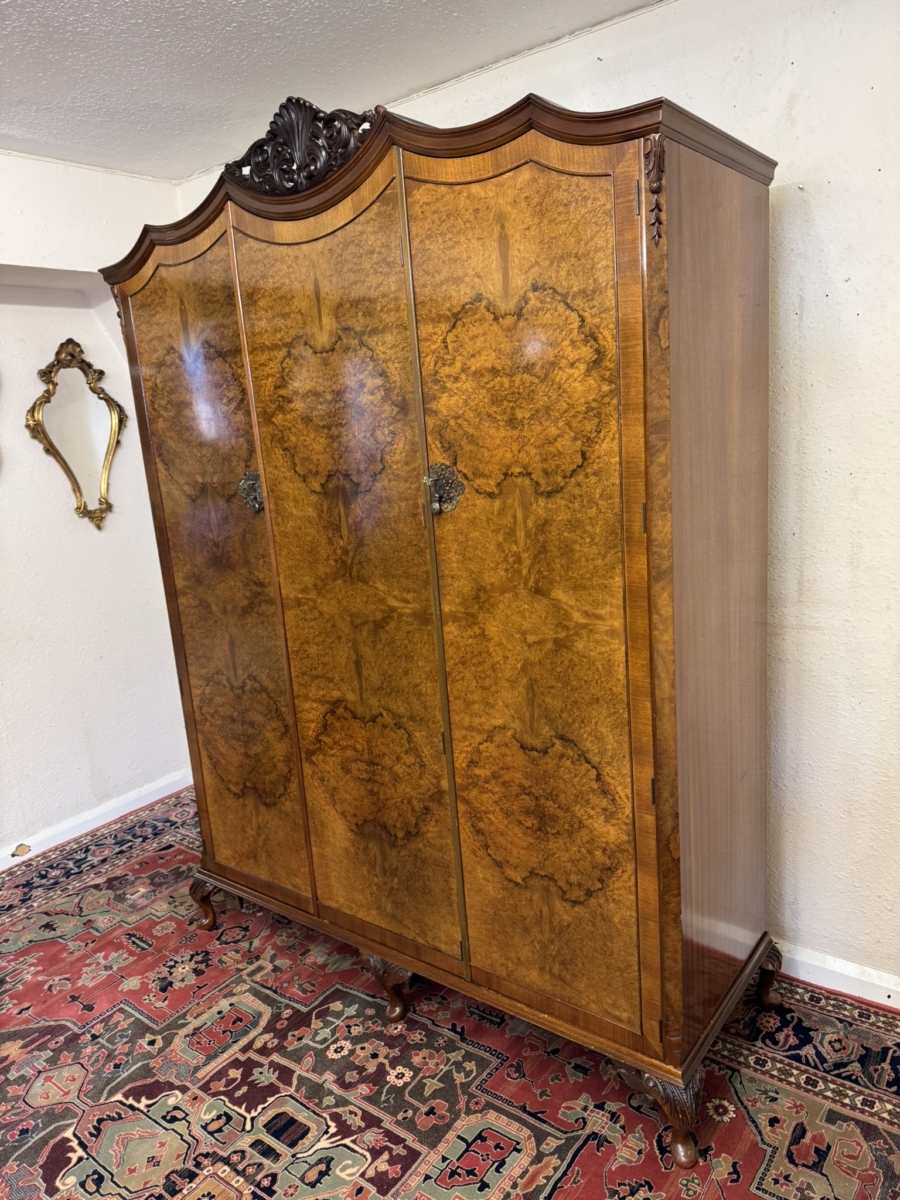 This fabulous wardrobe from the art deco period and is in excellent condition. The curved top has an ornate central carving, below are three lockable doors. Each door showcases a beautiful symmetrical burr walnut woodgrain pattern giving it a mirrored cloudlike appearance. The left-hand door and central door open to reveal a brass hanging rail and two brass shoe rails. The right-hand door opens to reveal a full-length dressing mirror behind the door, three glazed fronted compartments, two open compartments and two sliding drawers. The wardrobe stands on five carved cabriole shaped legs. Please note the wardrobe splits down into sections for delivery.