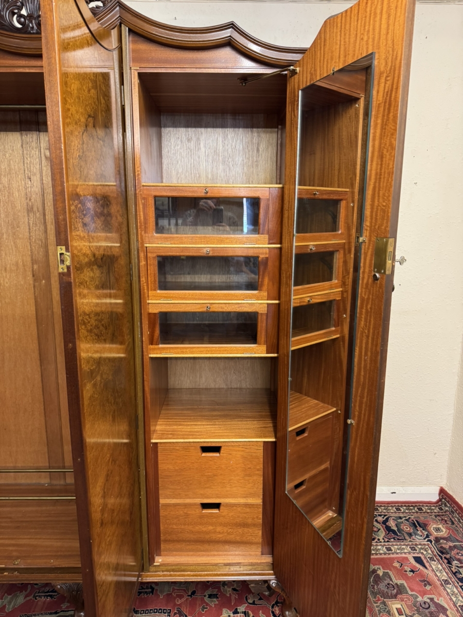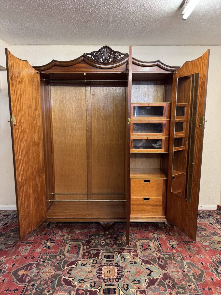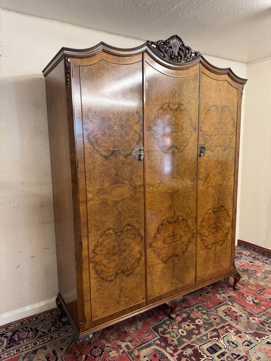 This fabulous wardrobe from the art deco period and is in excellent condition. The curved top has an ornate central carving, below are three lockable doors. Each door showcases a beautiful symmetrical burr walnut woodgrain pattern giving it a mirrored cloudlike appearance. The left-hand door and central door open to reveal a brass hanging rail and two brass shoe rails. The right-hand door opens to reveal a full-length dressing mirror behind the door, three glazed fronted compartments, two open compartments and two sliding drawers. The wardrobe stands on five carved cabriole shaped legs. Please note the wardrobe splits down into sections for delivery.