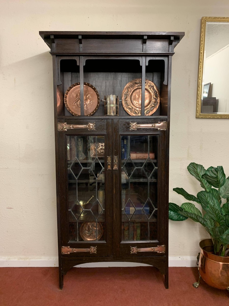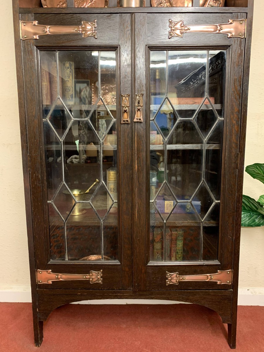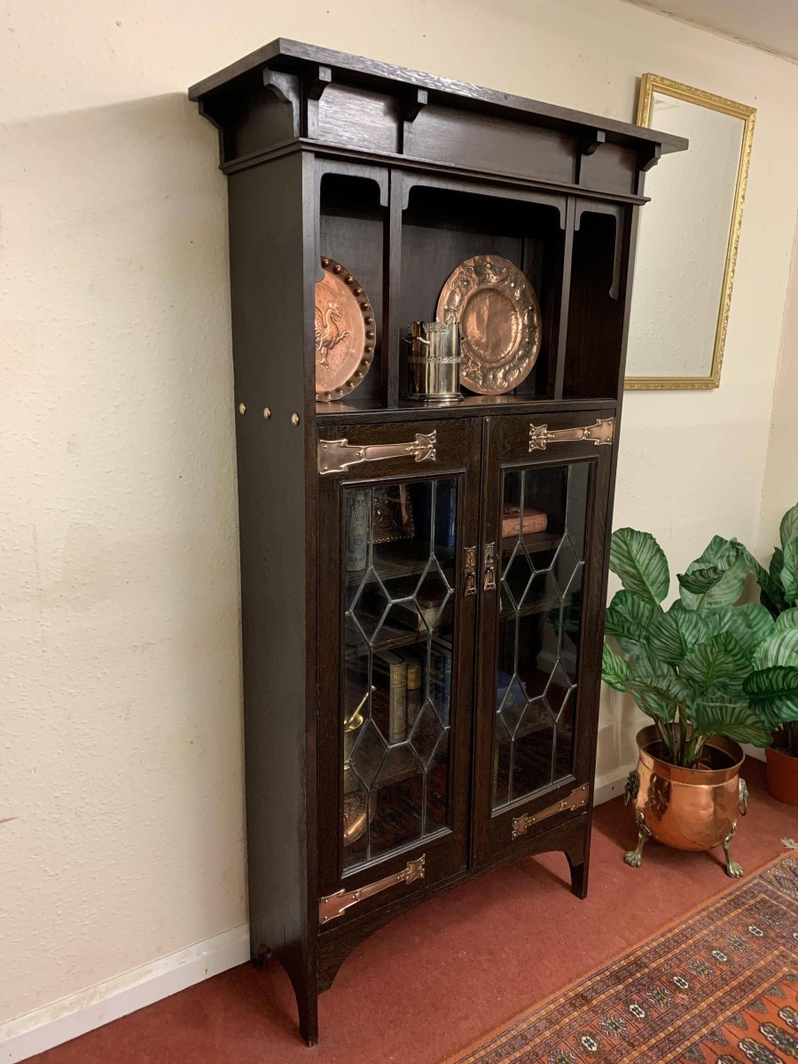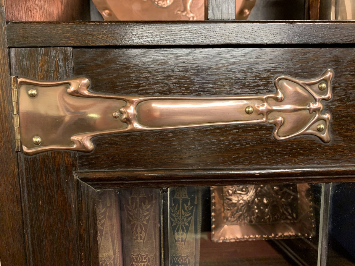A fine example of English Arts & Crafts furniture, this great cabinet dates Circa 1900. The open top sits above a pair of lockable glazed doors, each door having copper and brass tulip hinged plates, copper drop handles with decorative plates. The doors open to reveal three adjustable and removable shelves. To each side of the cabinet are three brass decorative buttons. Outstanding