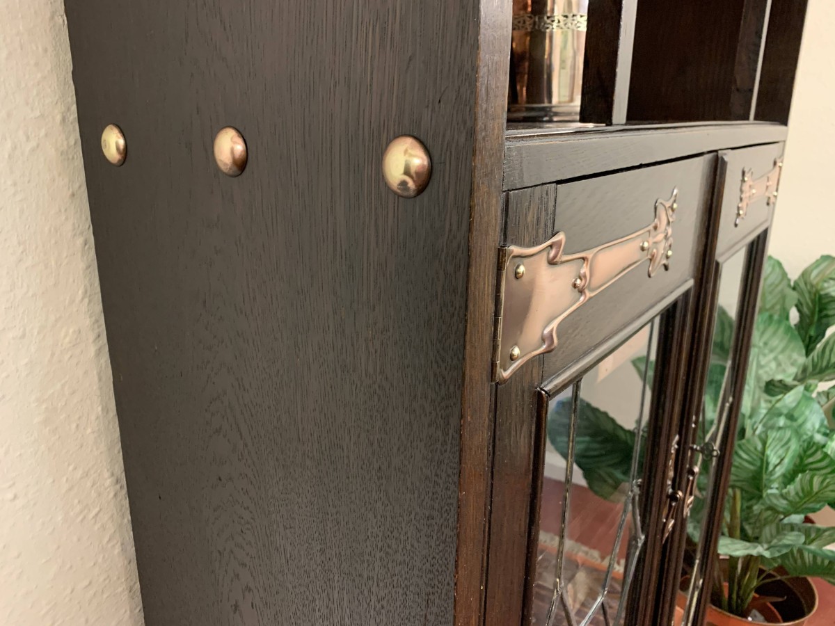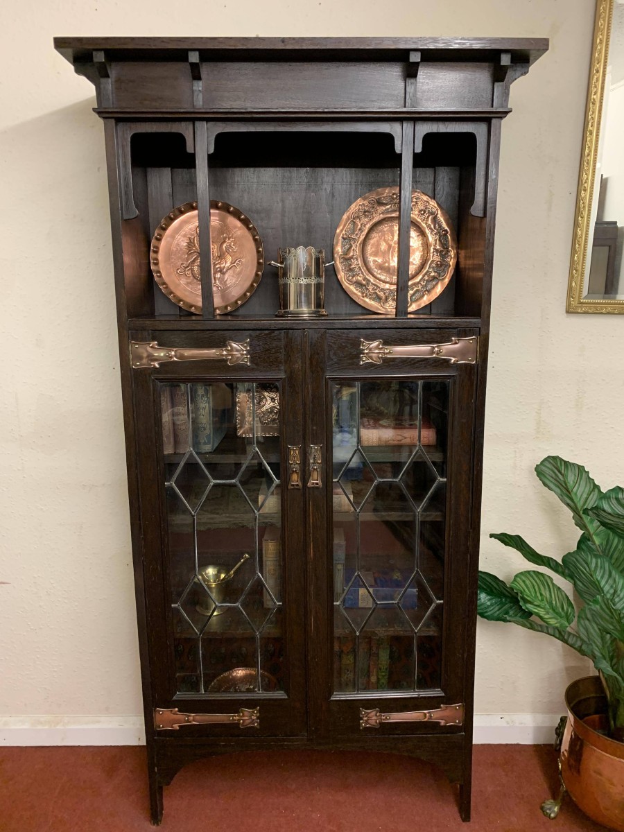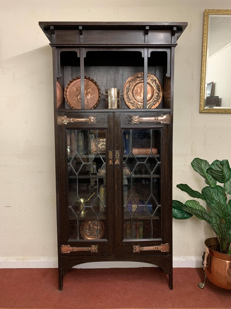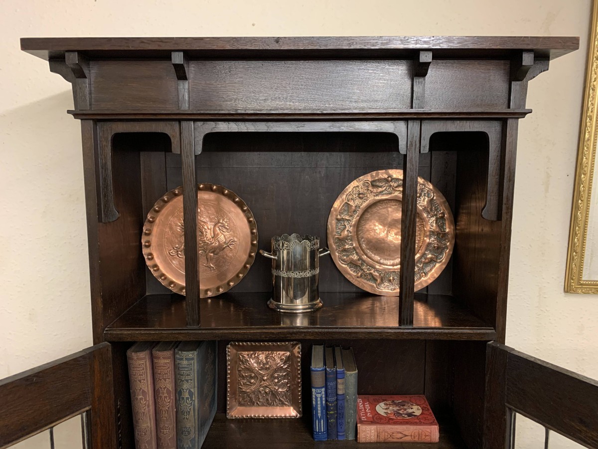 A fine example of English Arts & Crafts furniture, this great cabinet dates Circa 1900. The open top sits above a pair of lockable glazed doors, each door having copper and brass tulip hinged plates, copper drop handles with decorative plates. The doors open to reveal three adjustable and removable shelves. To each side of the cabinet are three brass decorative buttons. Outstanding