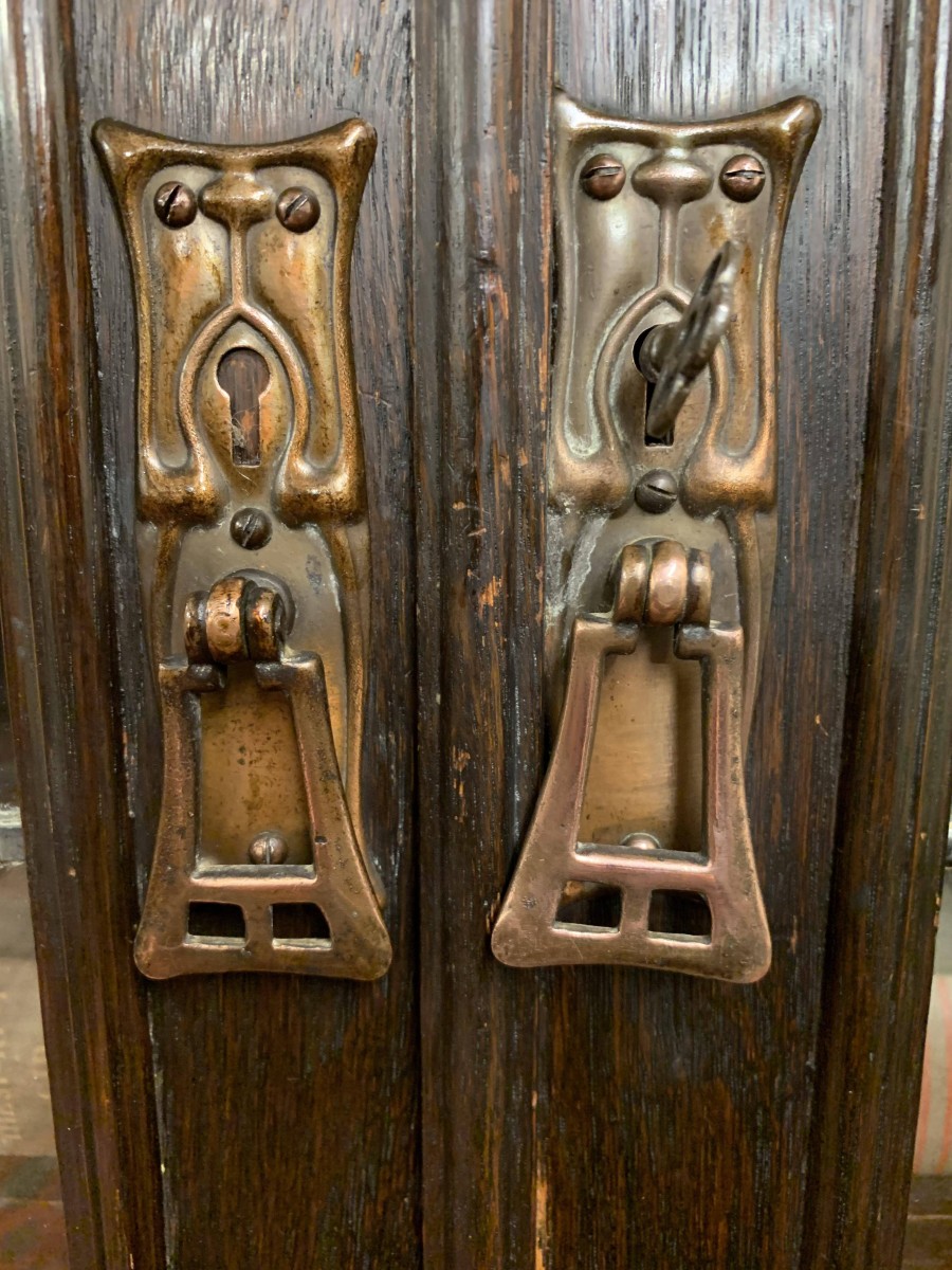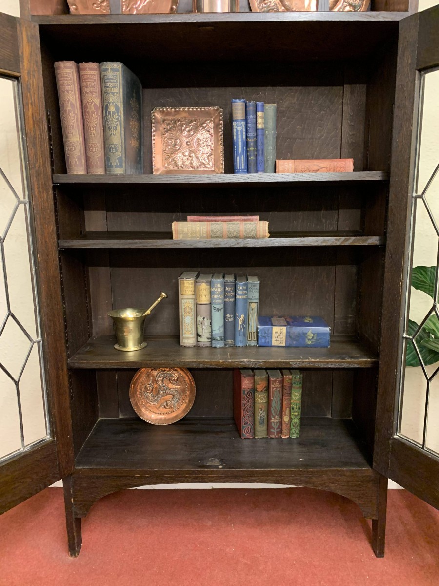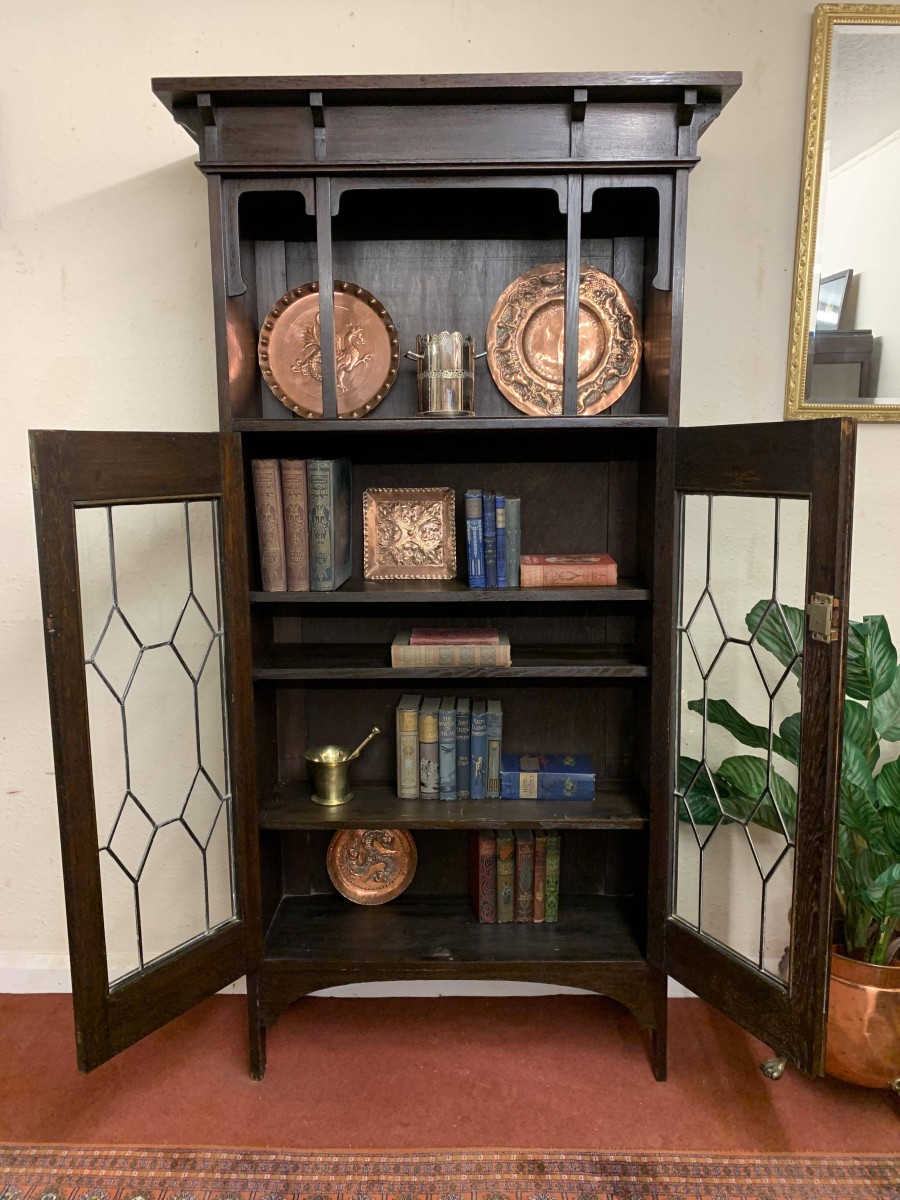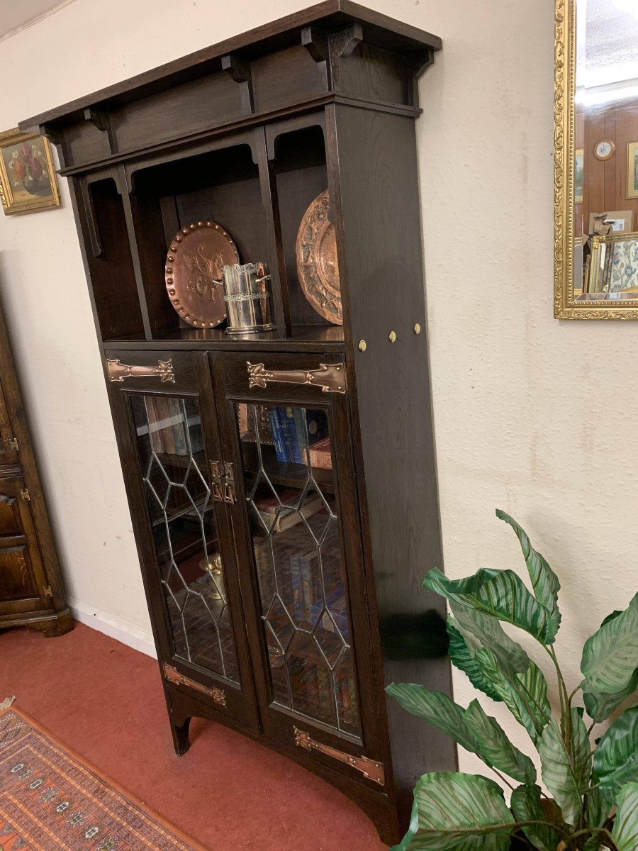 A fine example of English Arts & Crafts furniture, this great cabinet dates Circa 1900. The open top sits above a pair of lockable glazed doors, each door having copper and brass tulip hinged plates, copper drop handles with decorative plates. The doors open to reveal three adjustable and removable shelves. To each side of the cabinet are three brass decorative buttons. Outstanding