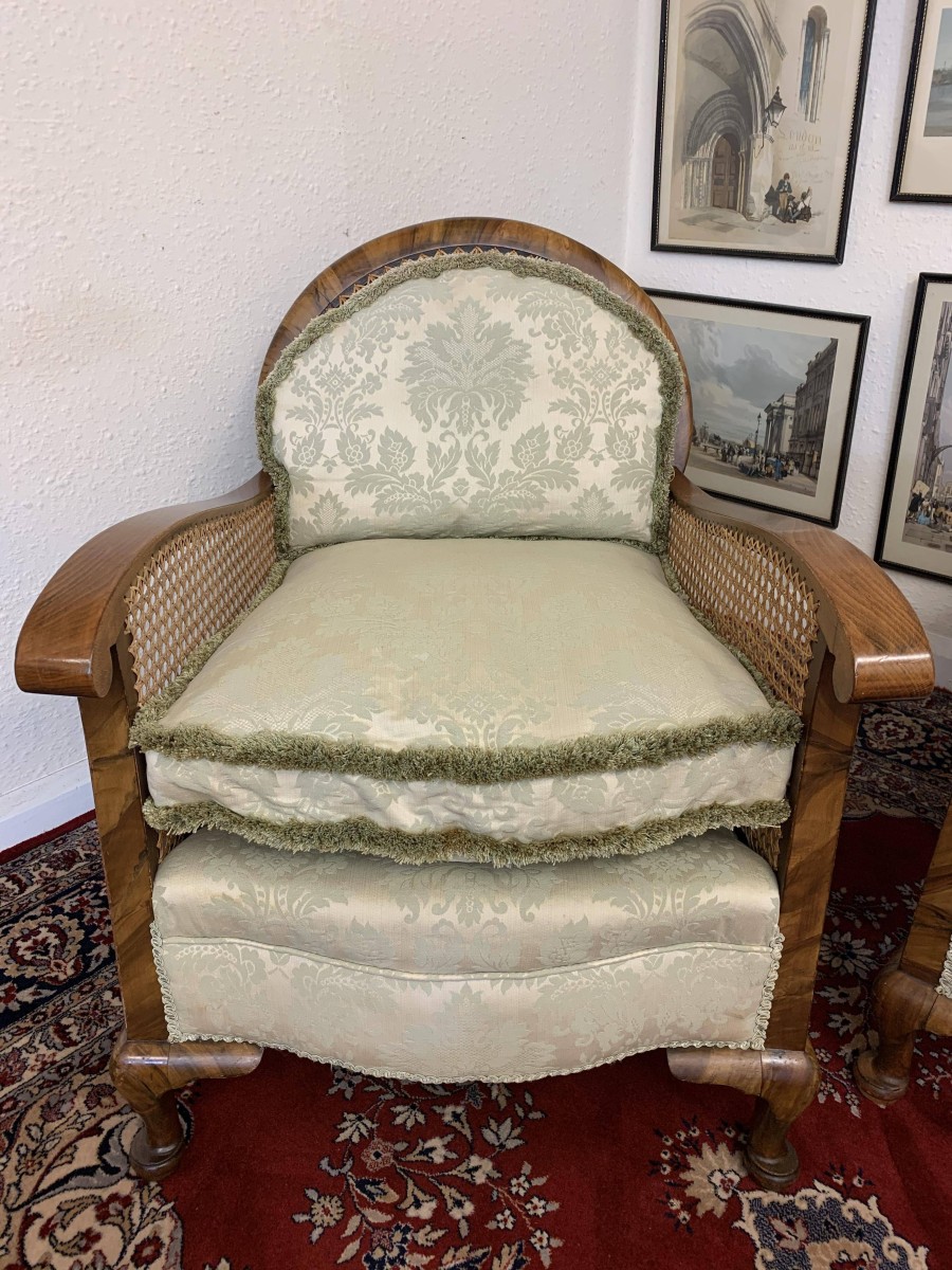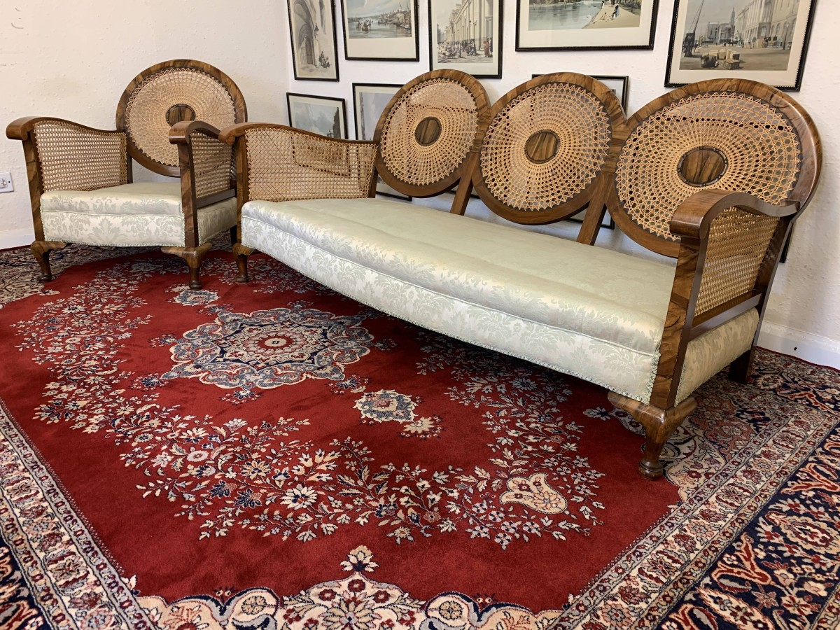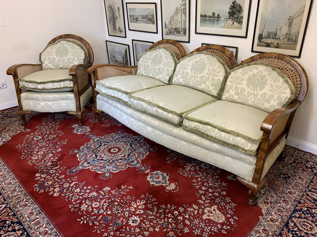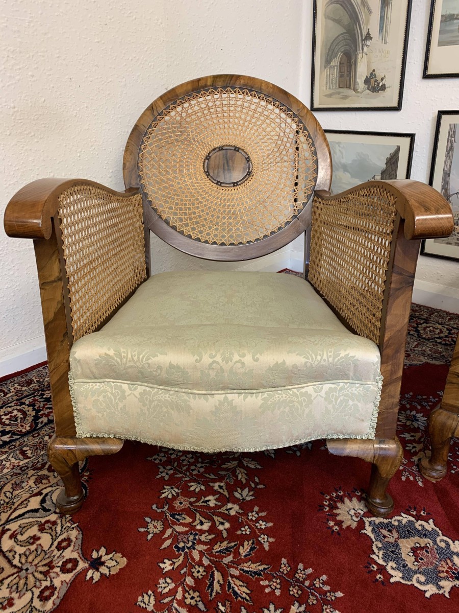 Made in striking Burr Walnut this Begere settee and armchair ooze style and quality. The sunburst shaped back and shaped arms are Begere and are in immaculate condition. Both the settee and armchair are slightly bowed at the front and offer a deep seat. The suite is upholstered in a damask fabric, all in super condition. The suite stands on shaped cabriole legs to the front.