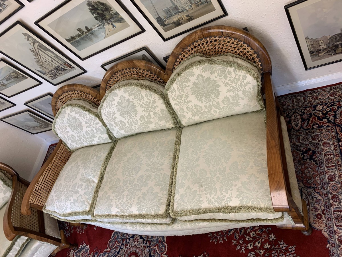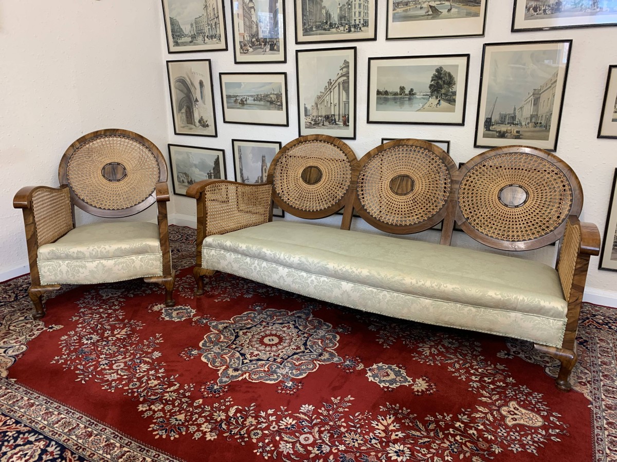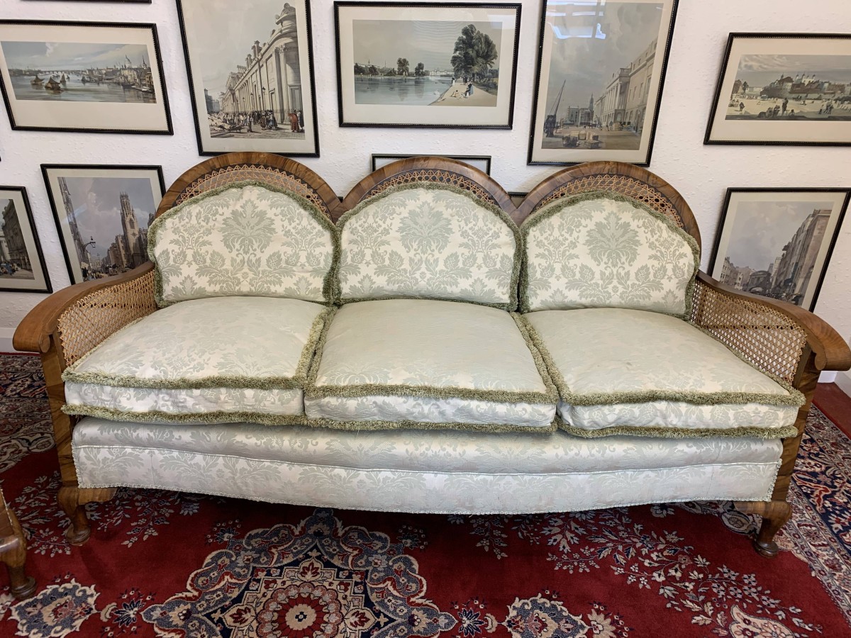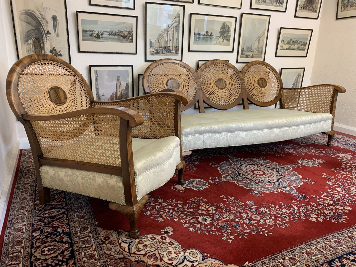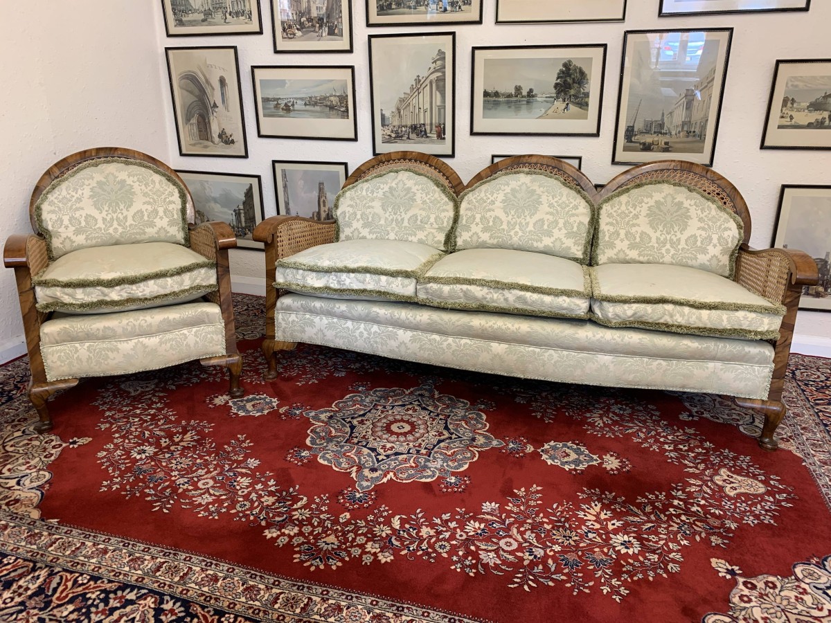 Made in striking Burr Walnut this Begere settee and armchair ooze style and quality. The sunburst shaped back and shaped arms are Begere and are in immaculate condition. Both the settee and armchair are slightly bowed at the front and offer a deep seat. The suite is upholstered in a damask fabric, all in super condition. The suite stands on shaped cabriole legs to the front.