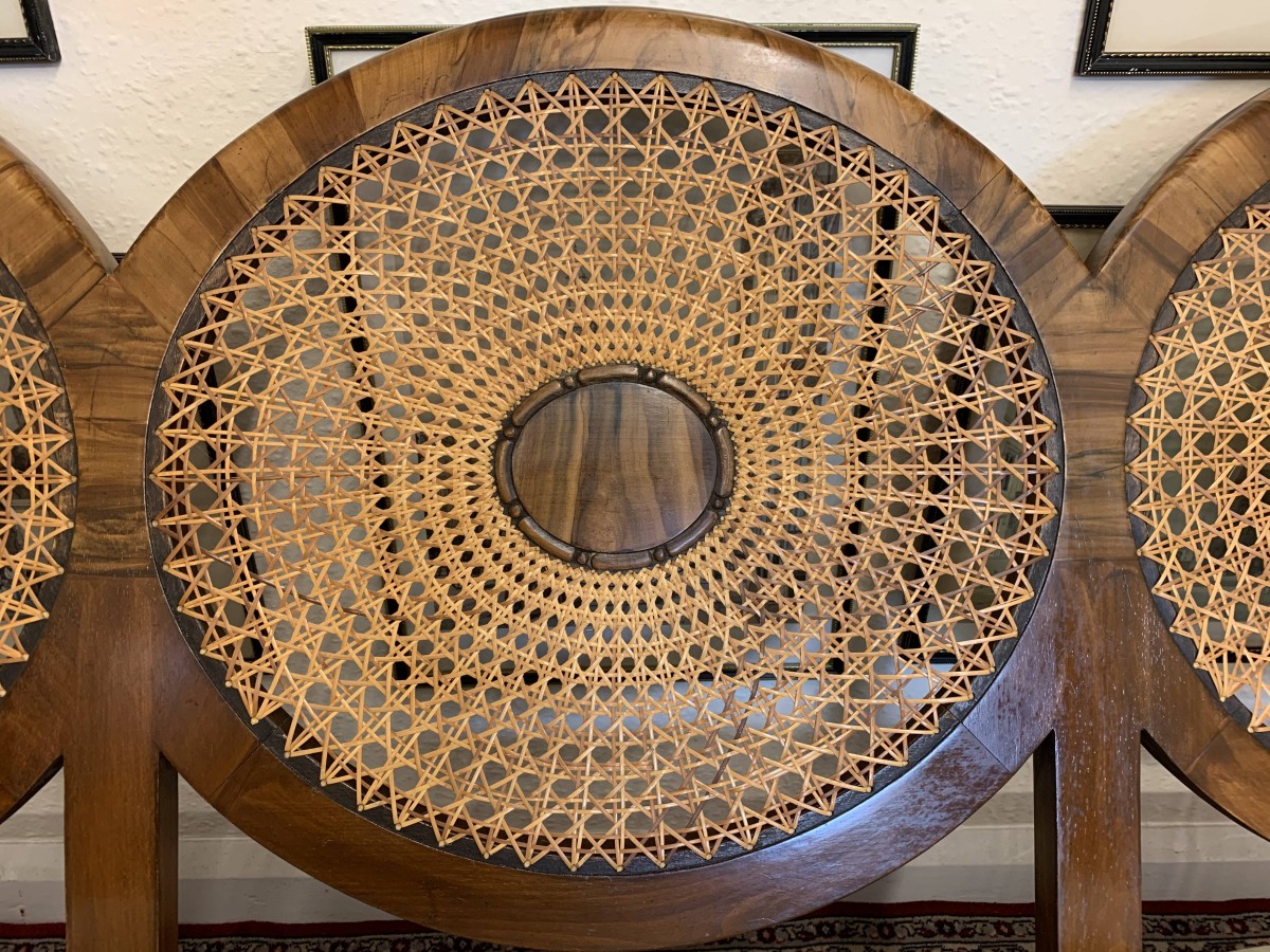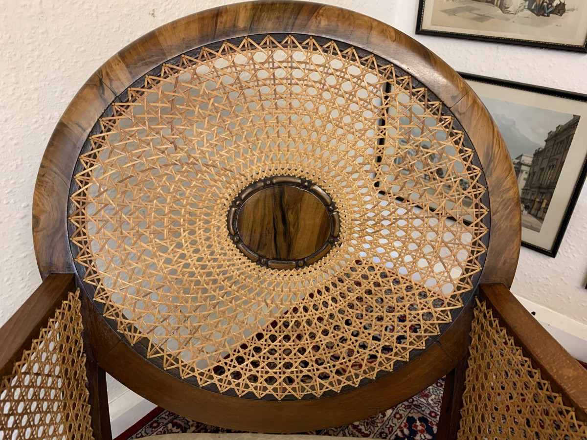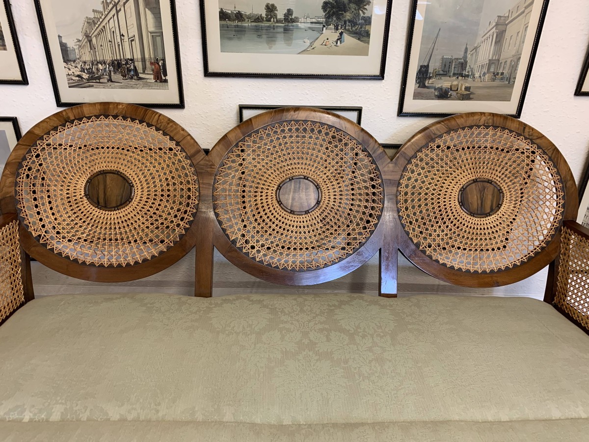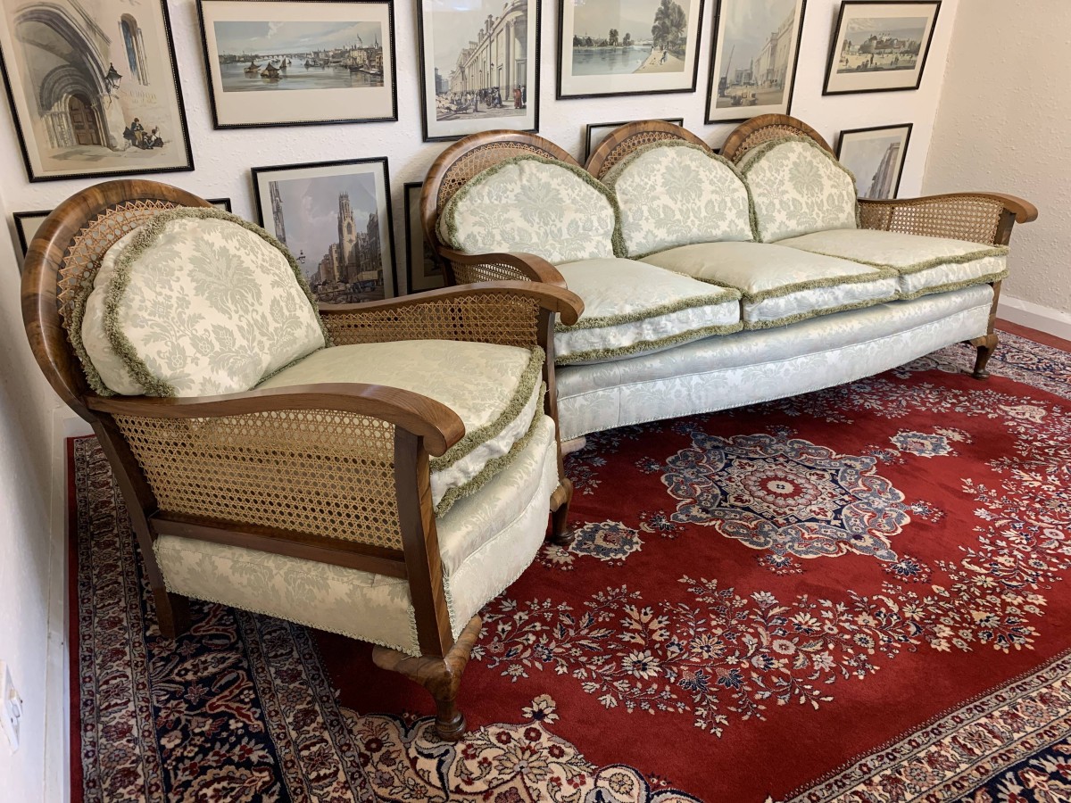 Made in striking Burr Walnut this Begere settee and armchair ooze style and quality. The sunburst shaped back and shaped arms are Begere and are in immaculate condition. Both the settee and armchair are slightly bowed at the front and offer a deep seat. The suite is upholstered in a damask fabric, all in super condition. The suite stands on shaped cabriole legs to the front.