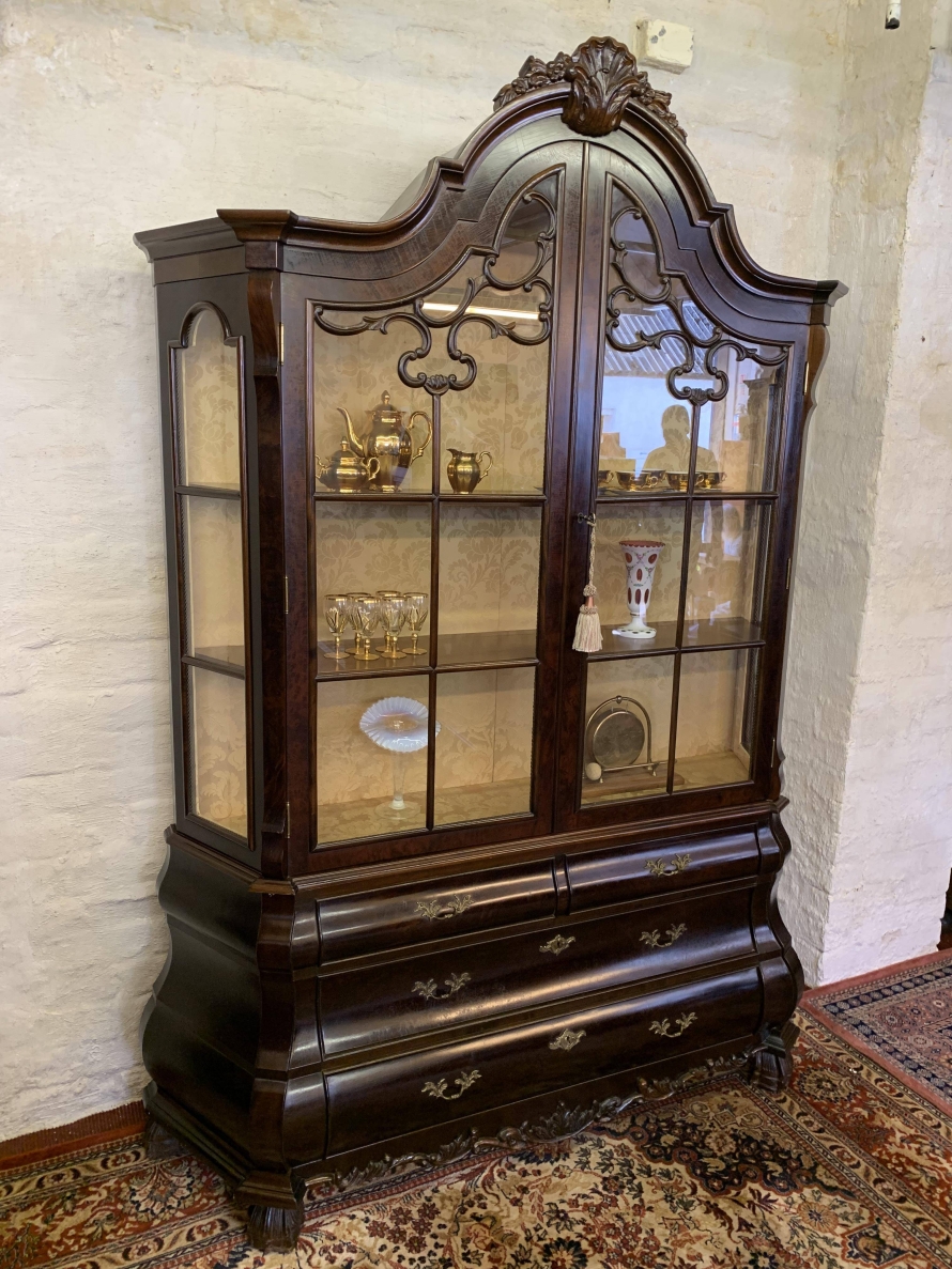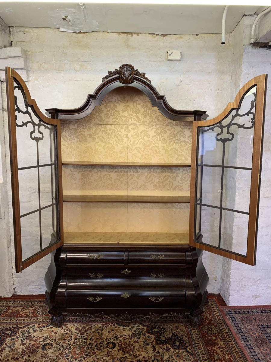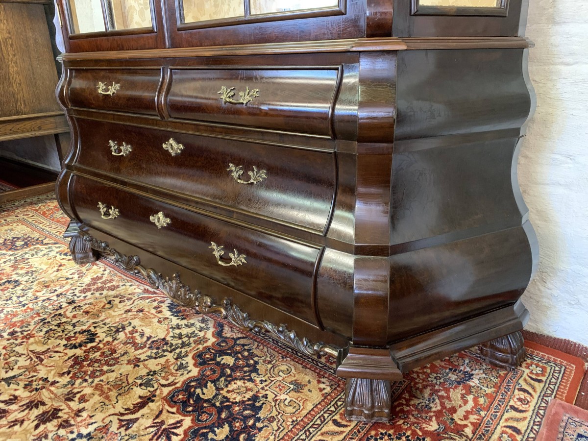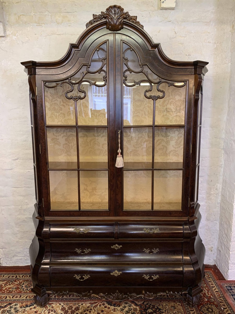 The shaped glazed top section rises to a fabulous central carving. Below are a pair of lockable glazed doors, the doors having decorative wood barring. The doors open to reveal two removable shelves. The canted sides are also glazed. The bombe base having two short shaped drawers above two long shaped drawers. Canted shaped sides, carved decorative skirt to the front this fabulous bombe cabinet which stands on four paw feet.