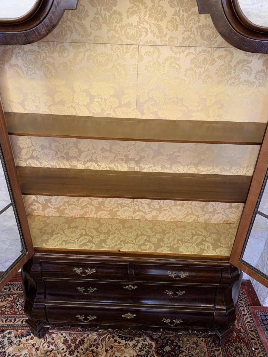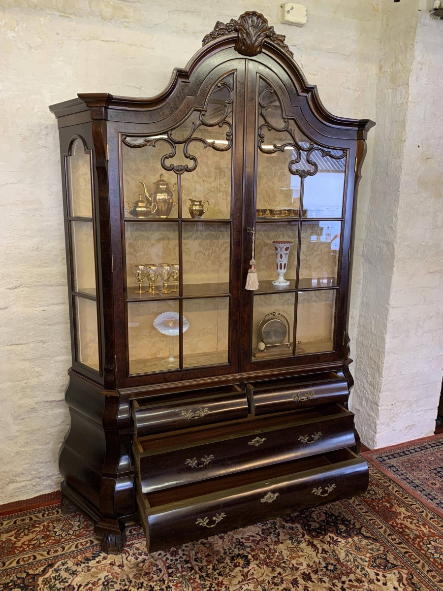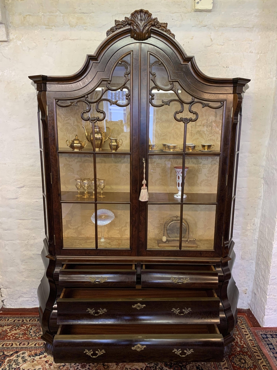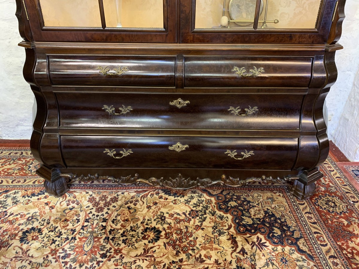The shaped glazed top section rises to a fabulous central carving. Below are a pair of lockable glazed doors, the doors having decorative wood barring. The doors open to reveal two removable shelves. The canted sides are also glazed. The bombe base having two short shaped drawers above two long shaped drawers. Canted shaped sides, carved decorative skirt to the front this fabulous bombe cabinet which stands on four paw feet.