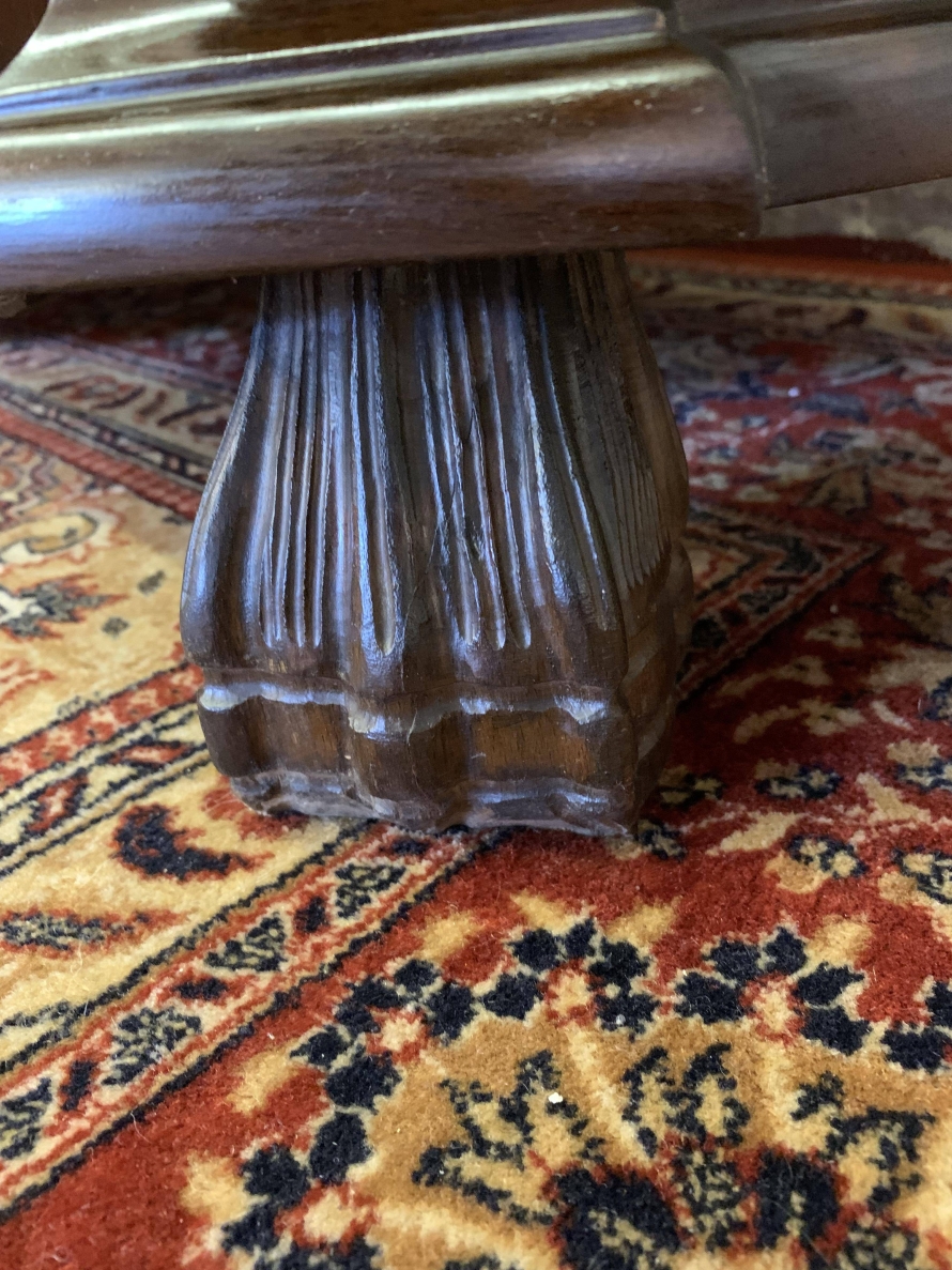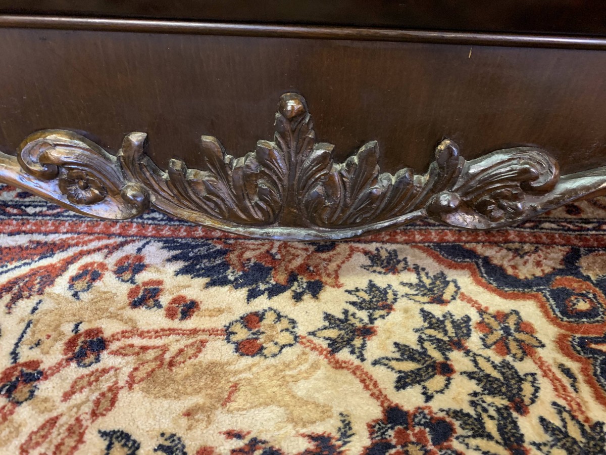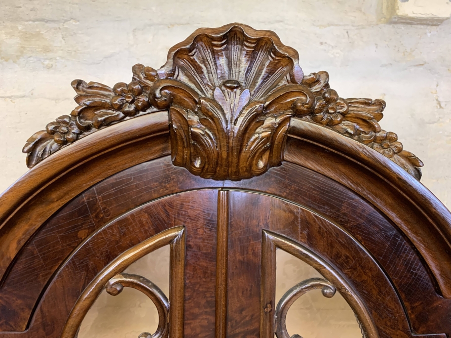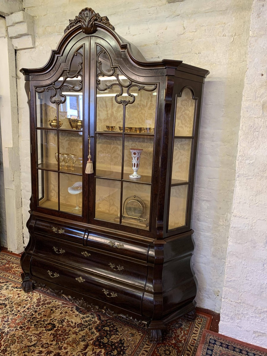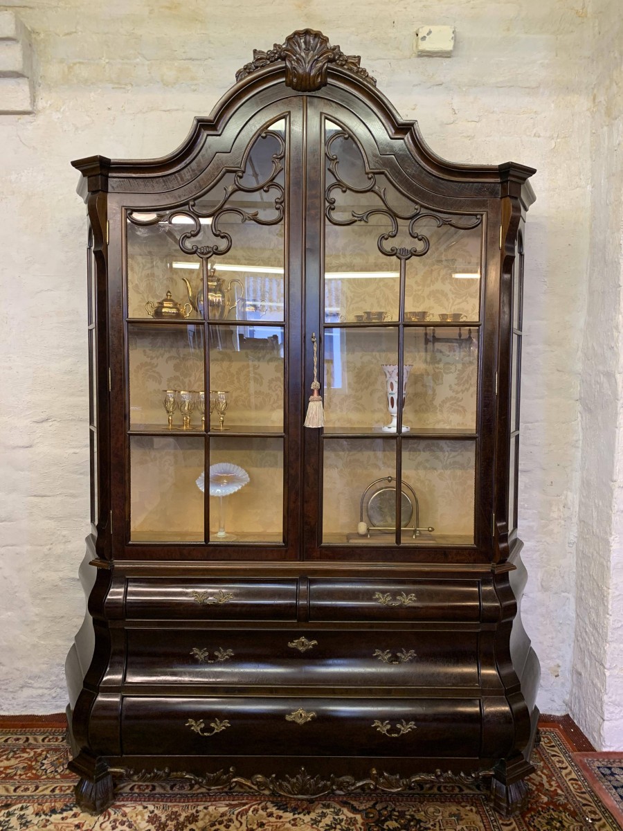 The shaped glazed top section rises to a fabulous central carving. Below are a pair of lockable glazed doors, the doors having decorative wood barring. The doors open to reveal two removable shelves. The canted sides are also glazed. The bombe base having two short shaped drawers above two long shaped drawers. Canted shaped sides, carved decorative skirt to the front this fabulous bombe cabinet which stands on four paw feet.
