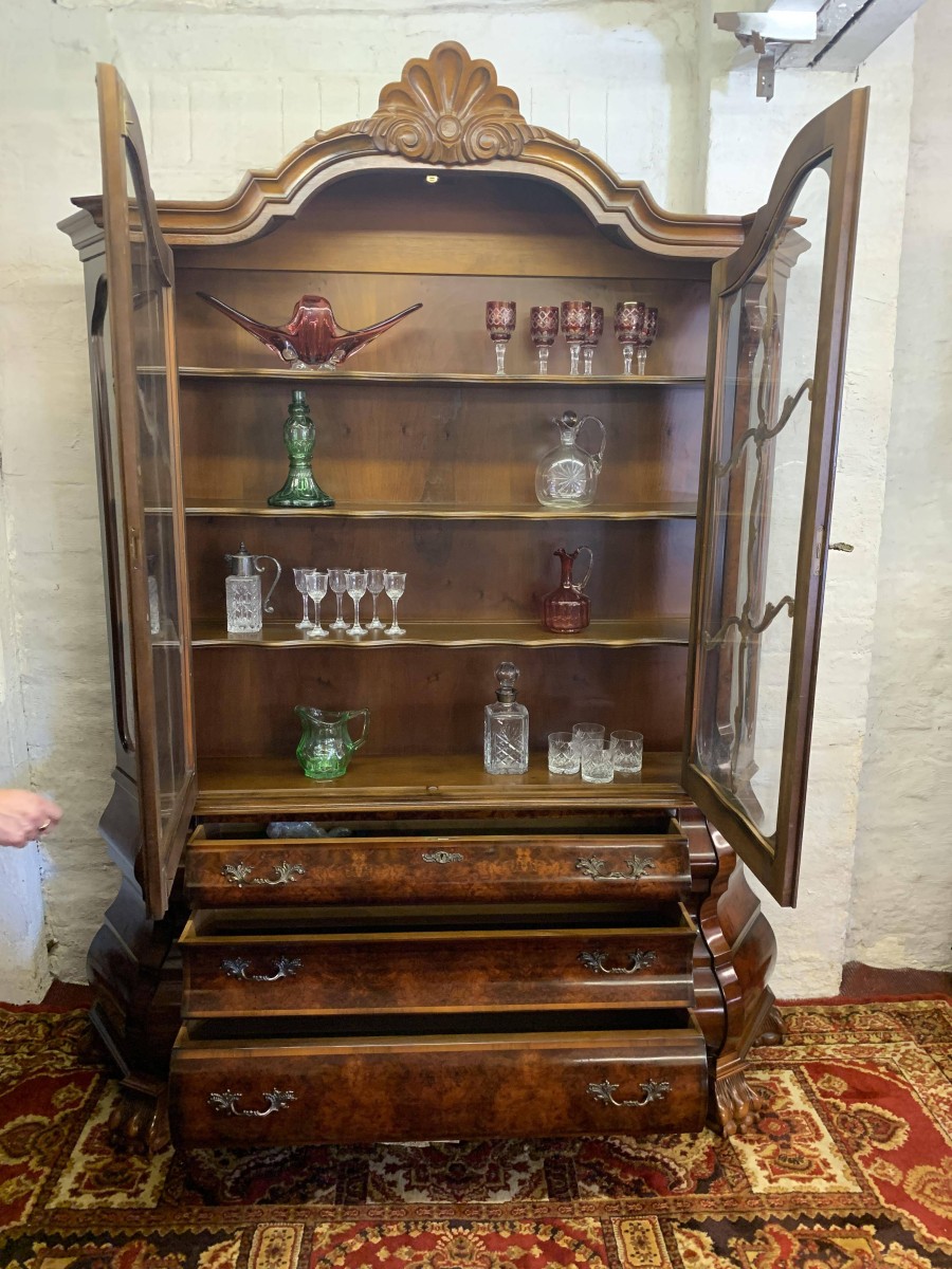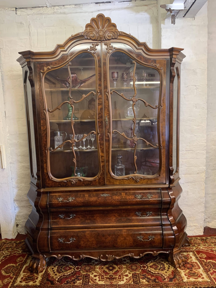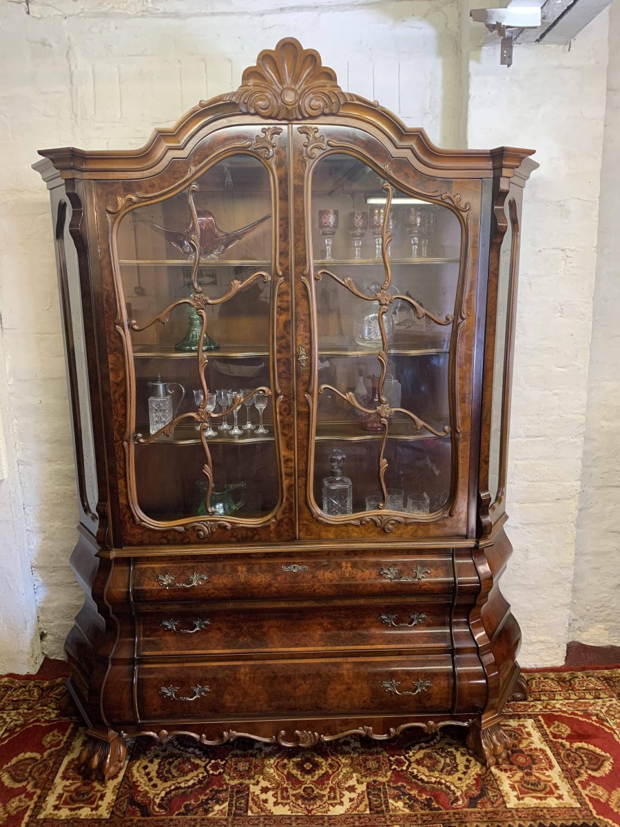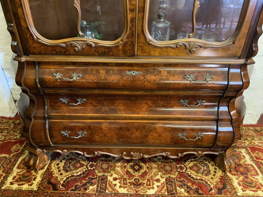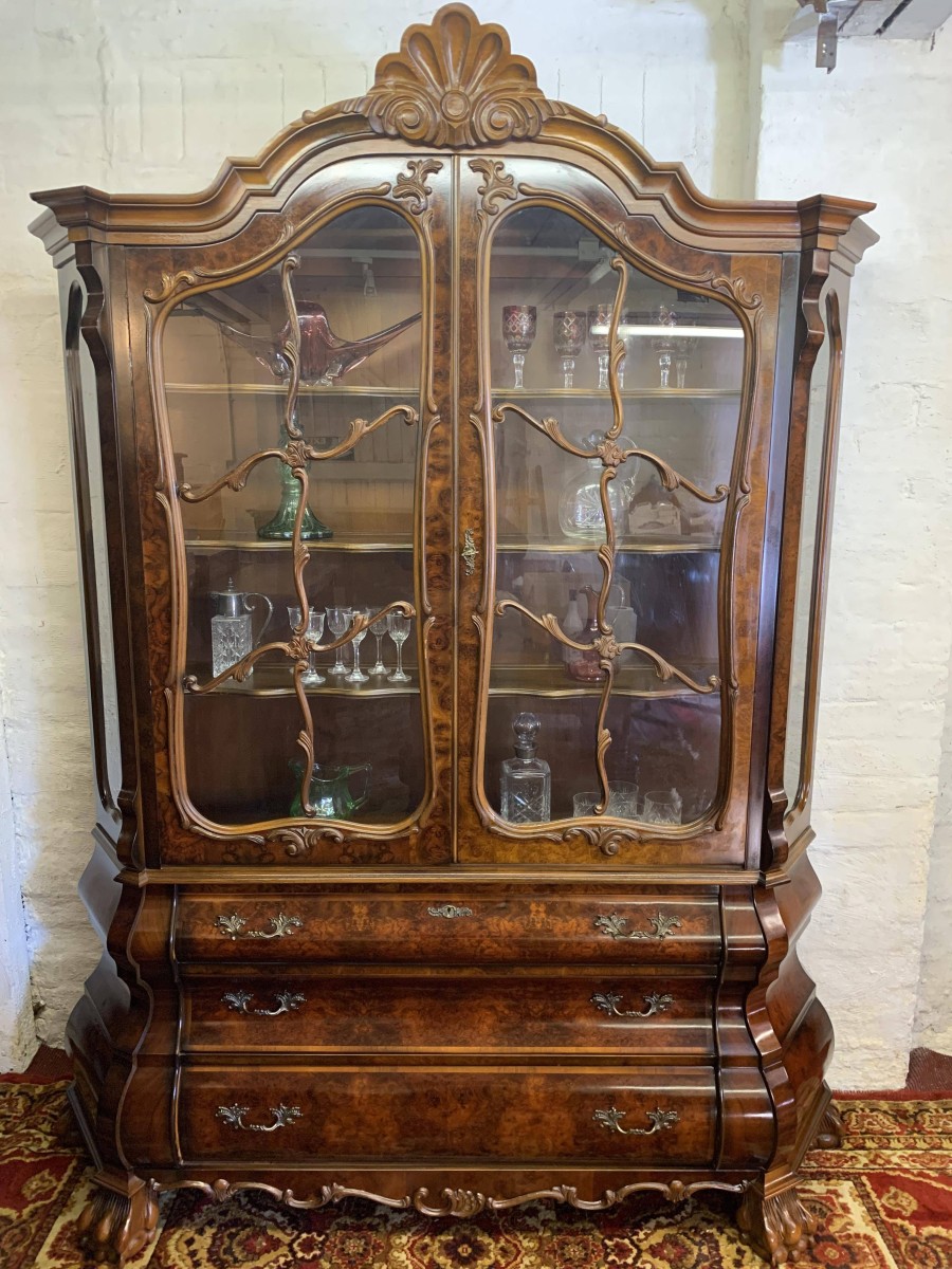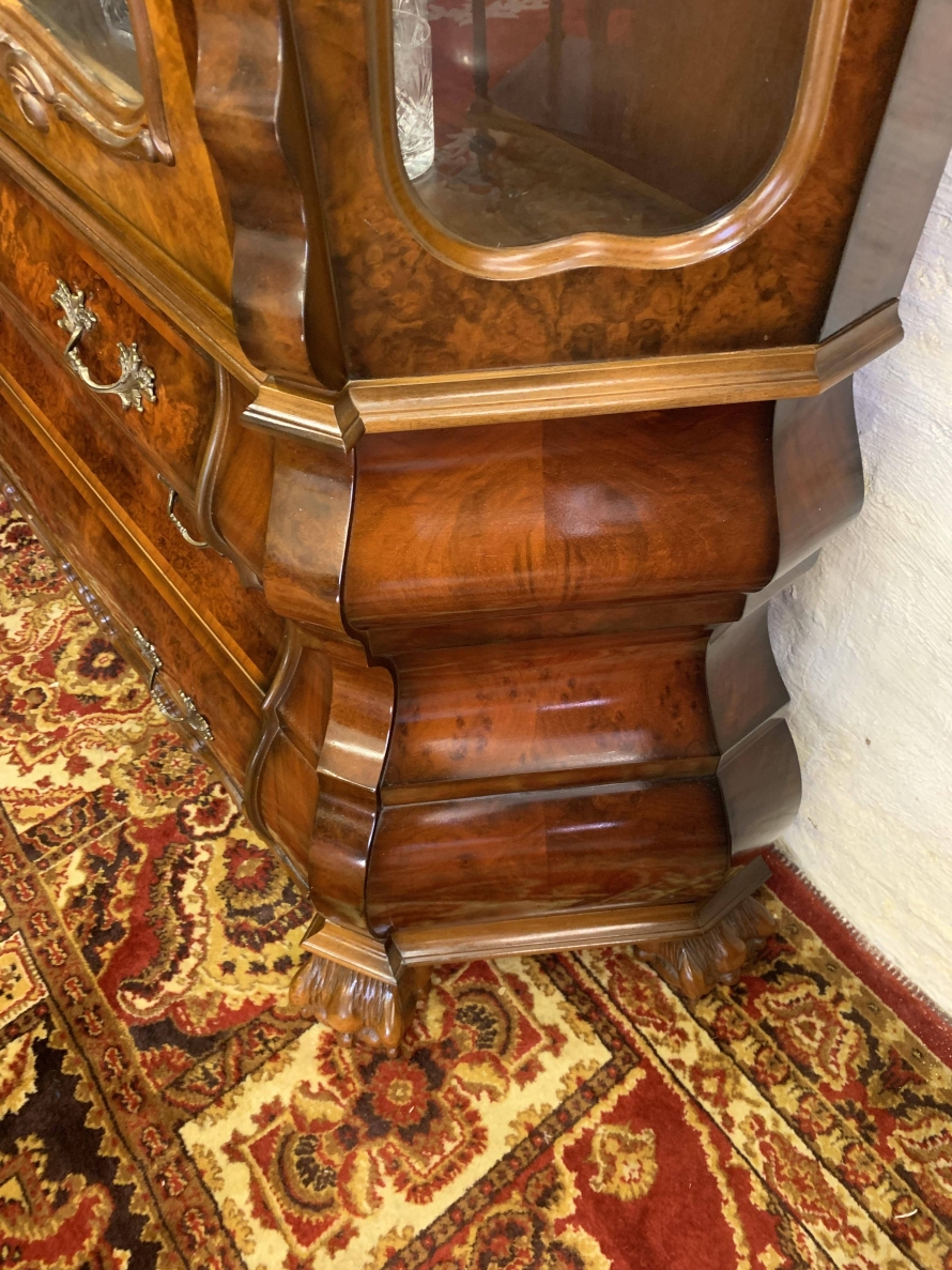 A fantastic cabinet made in striking burr walnut and in excellent condition. The shaped oversailing top rises to an impressive central carving. Below are a pair of lockable glazed doors, the doors having carved wood barring. The doors open to reveal three shaped removable shelves. The canted sides are also glazed. Below are three shaped drawers, each drawer having a pair of ornate brass handles. Shaped sides, shaped carved skirt; this outstanding cabinet stands on four paw feet.