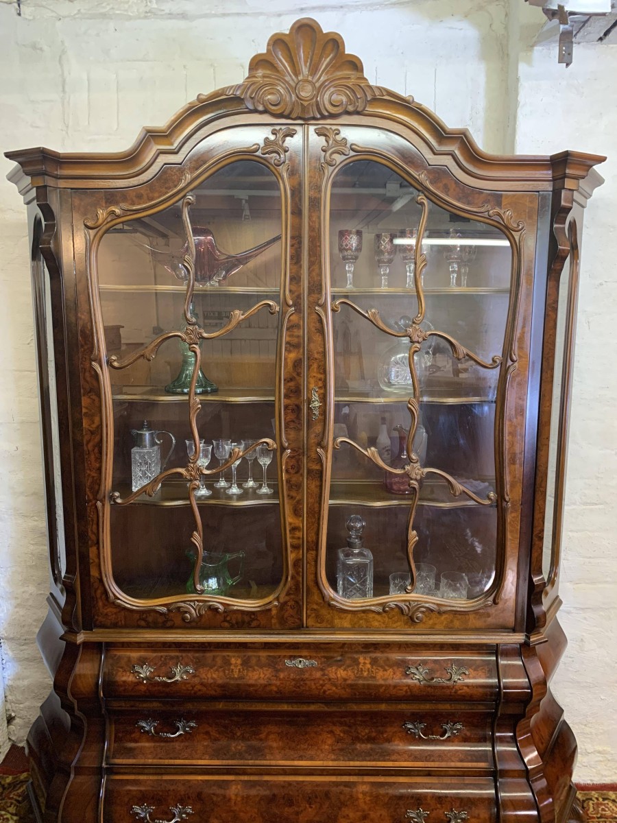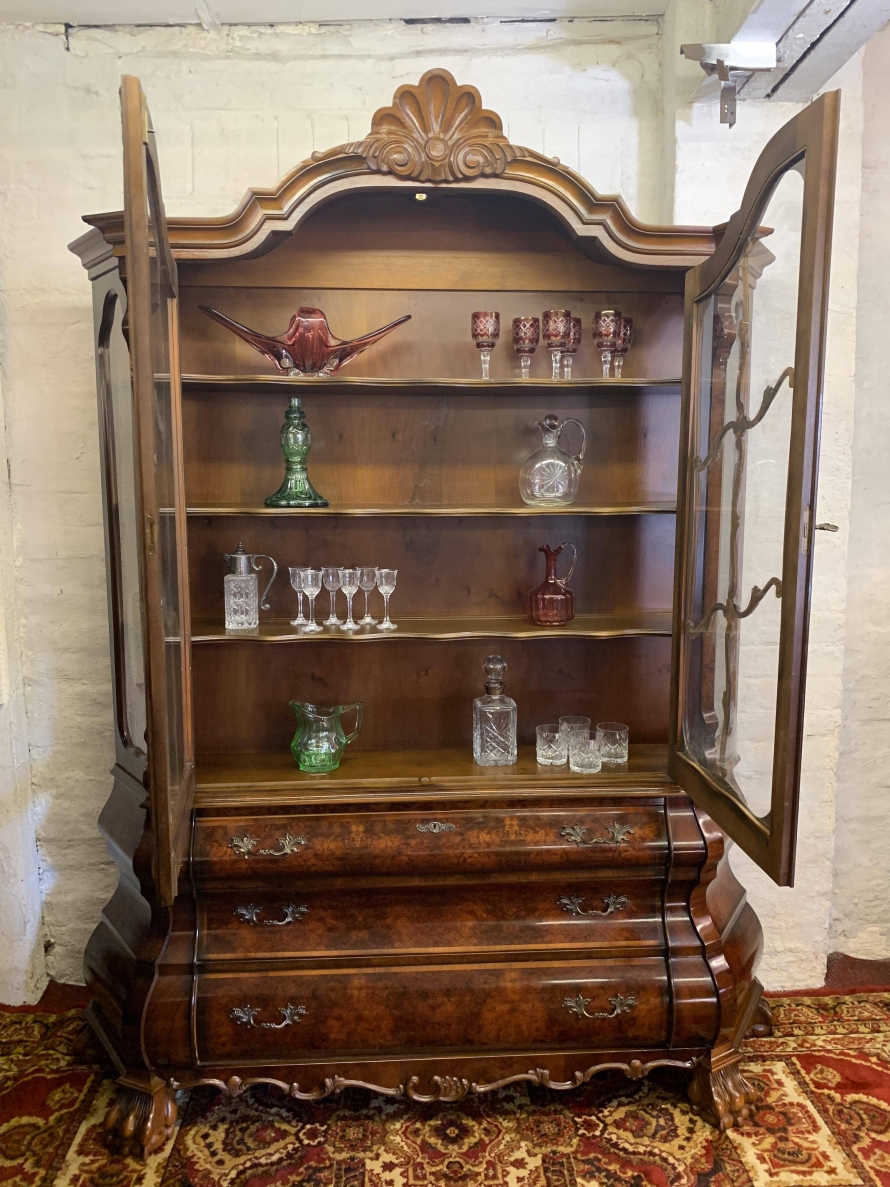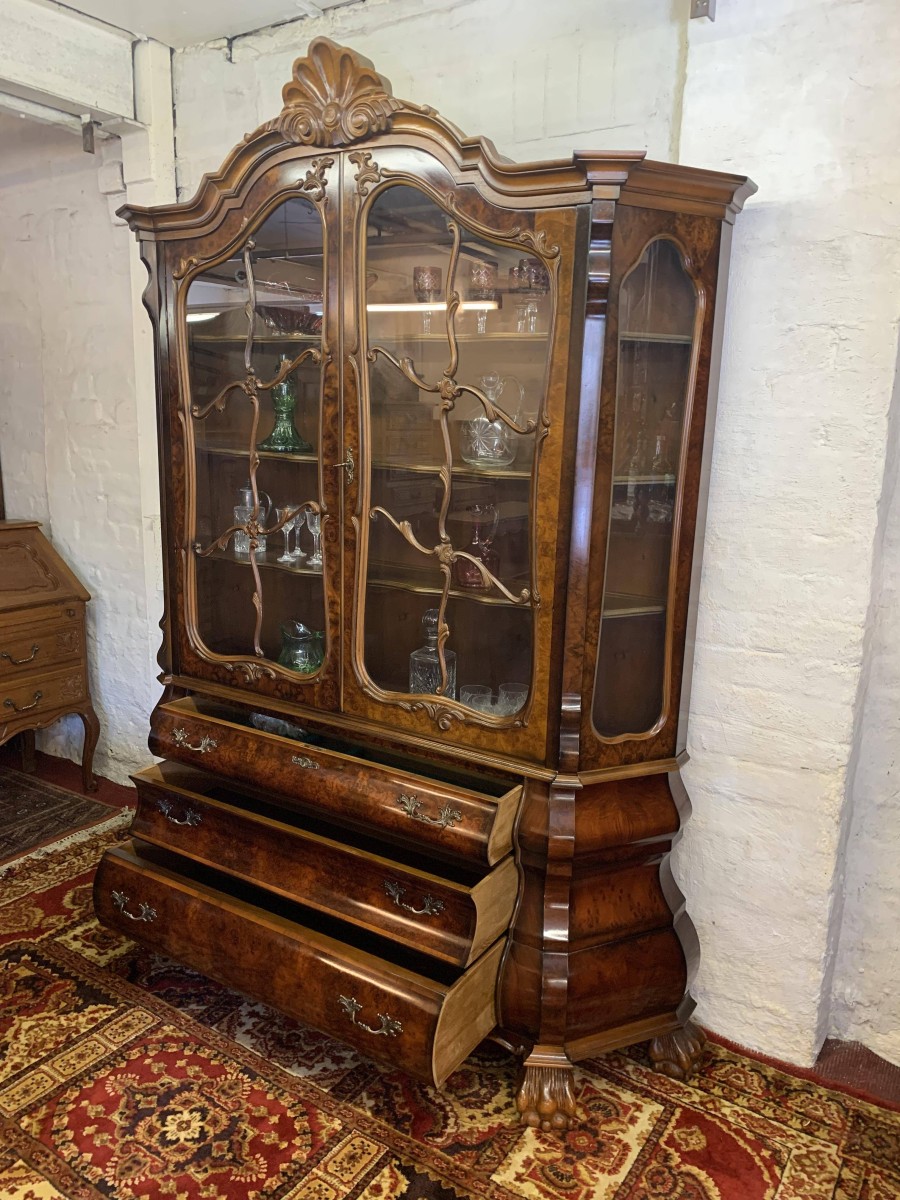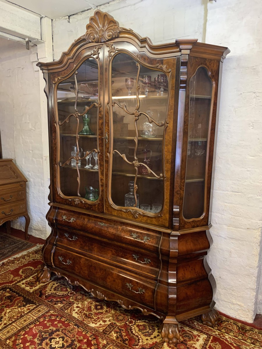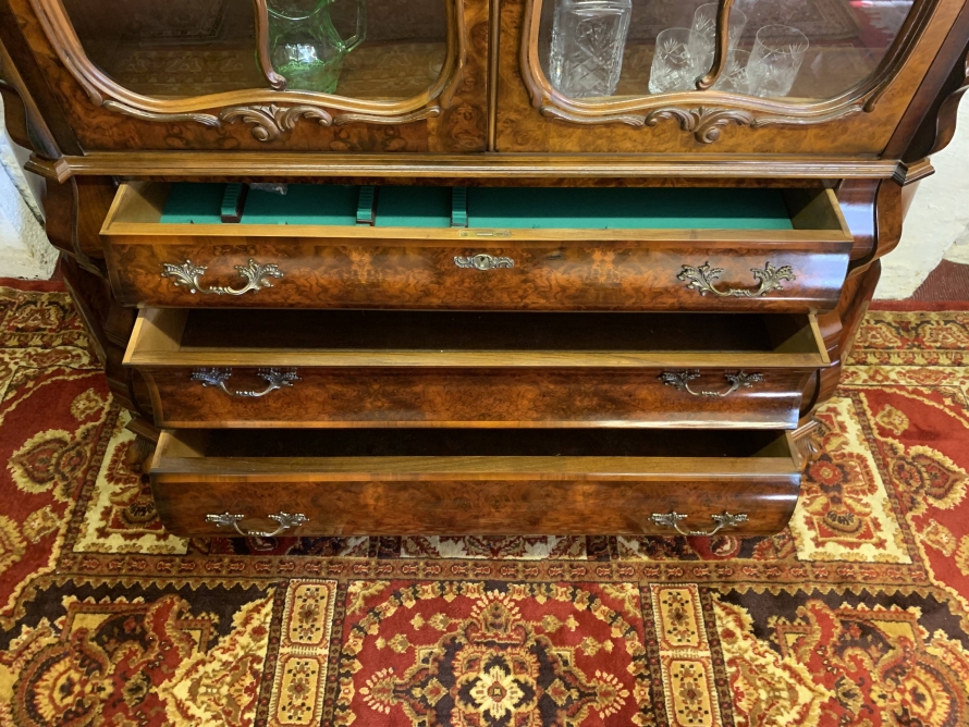 A fantastic cabinet made in striking burr walnut and in excellent condition. The shaped oversailing top rises to an impressive central carving. Below are a pair of lockable glazed doors, the doors having carved wood barring. The doors open to reveal three shaped removable shelves. The canted sides are also glazed. Below are three shaped drawers, each drawer having a pair of ornate brass handles. Shaped sides, shaped carved skirt; this outstanding cabinet stands on four paw feet.