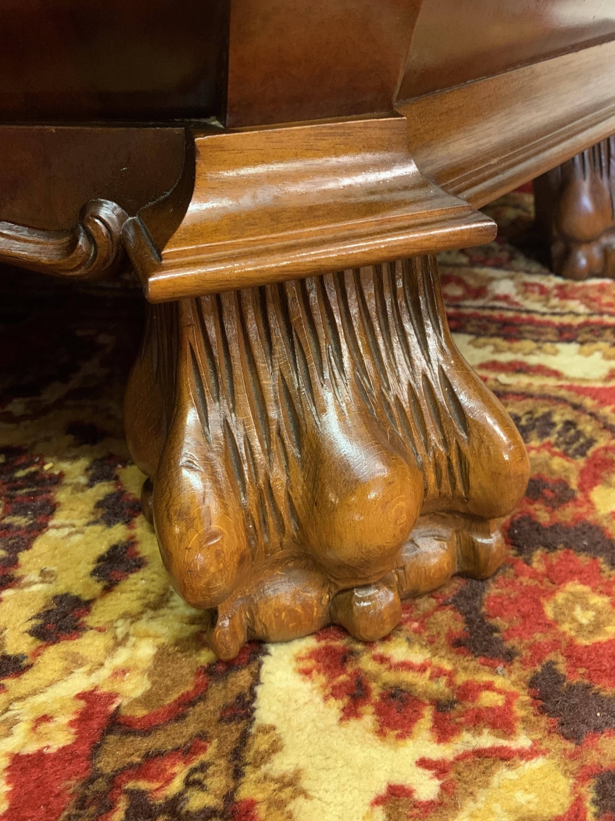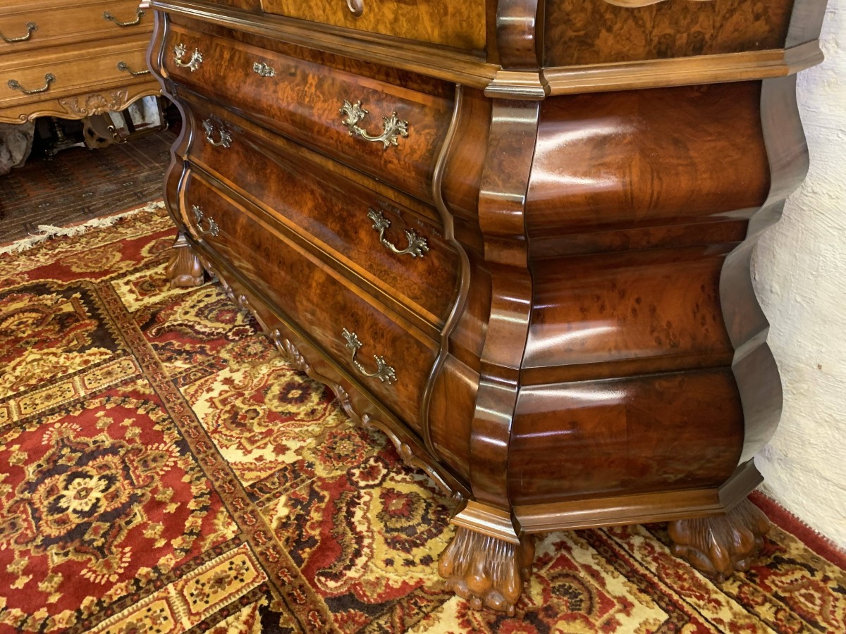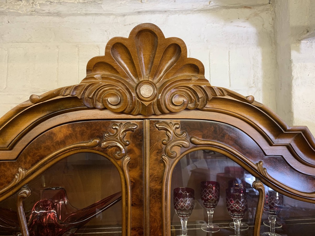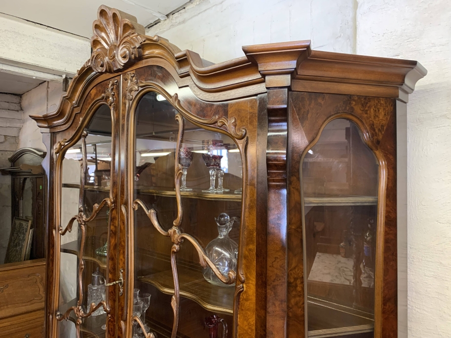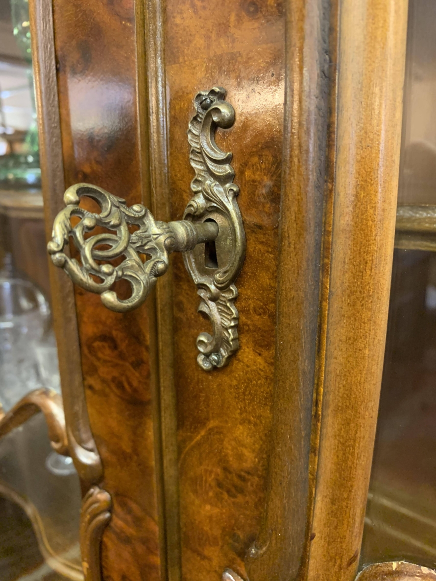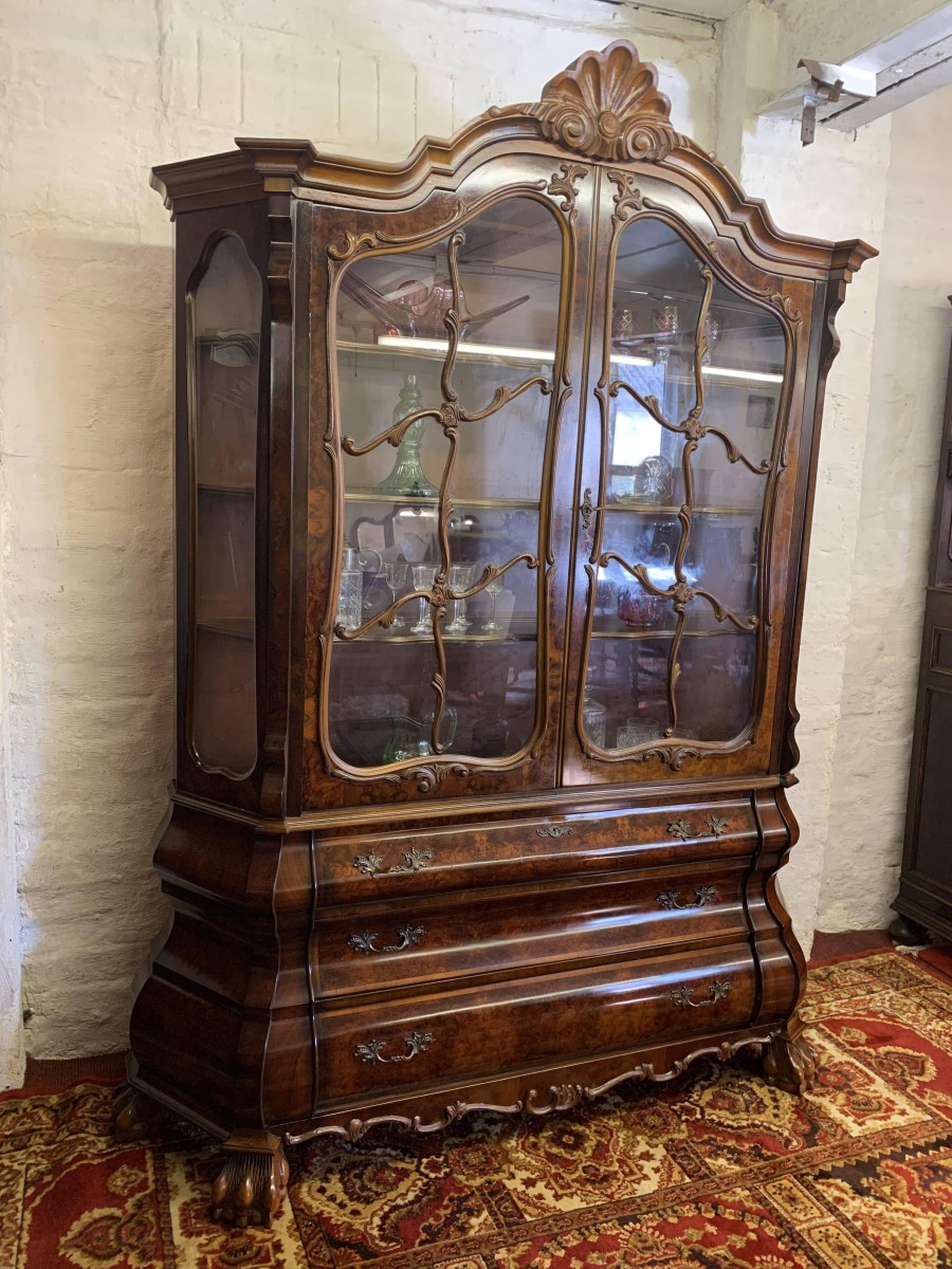 A fantastic cabinet made in striking burr walnut and in excellent condition. The shaped oversailing top rises to an impressive central carving. Below are a pair of lockable glazed doors, the doors having carved wood barring. The doors open to reveal three shaped removable shelves. The canted sides are also glazed. Below are three shaped drawers, each drawer having a pair of ornate brass handles. Shaped sides, shaped carved skirt; this outstanding cabinet stands on four paw feet.