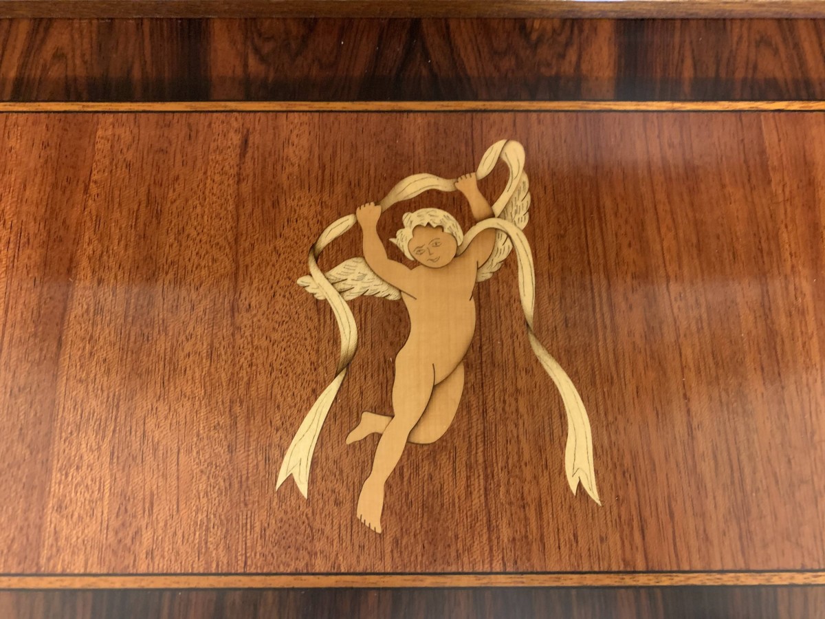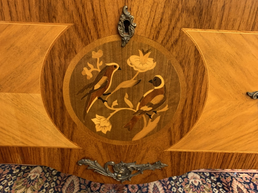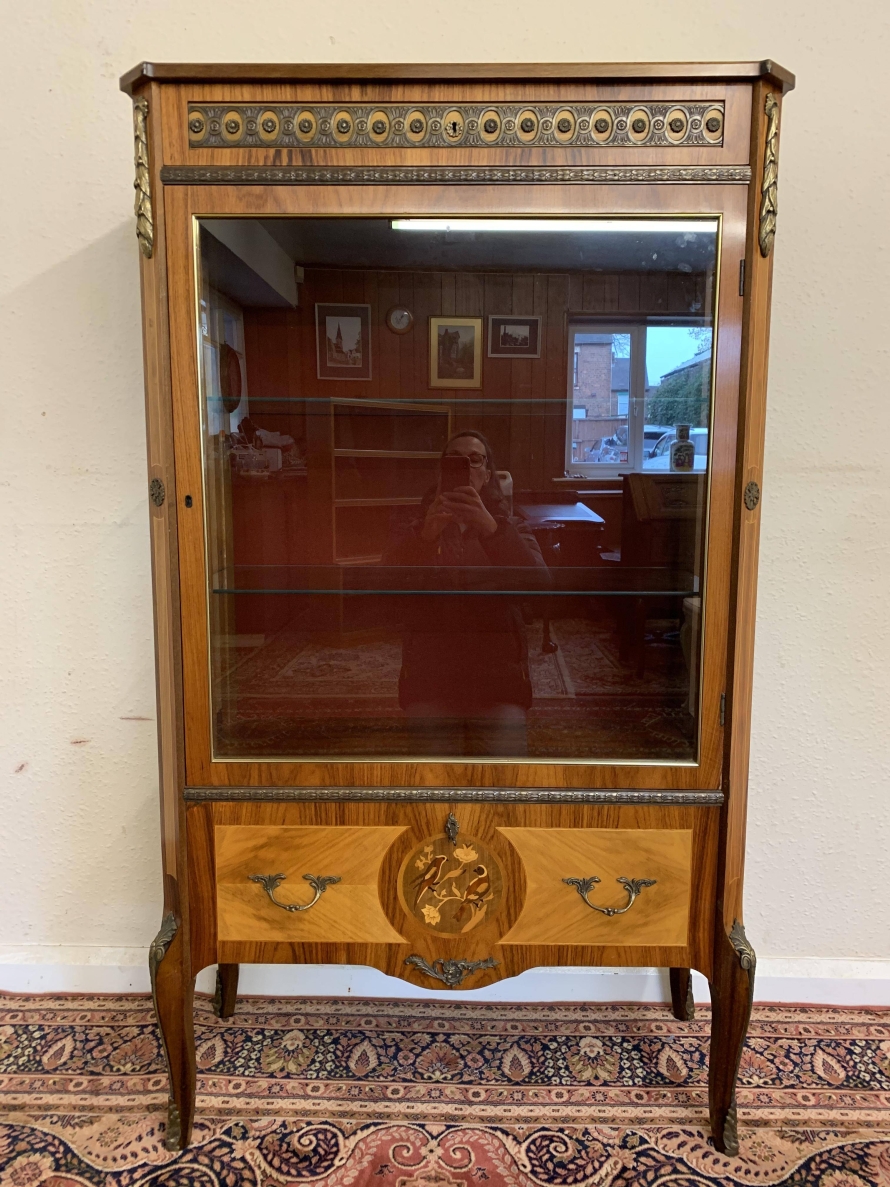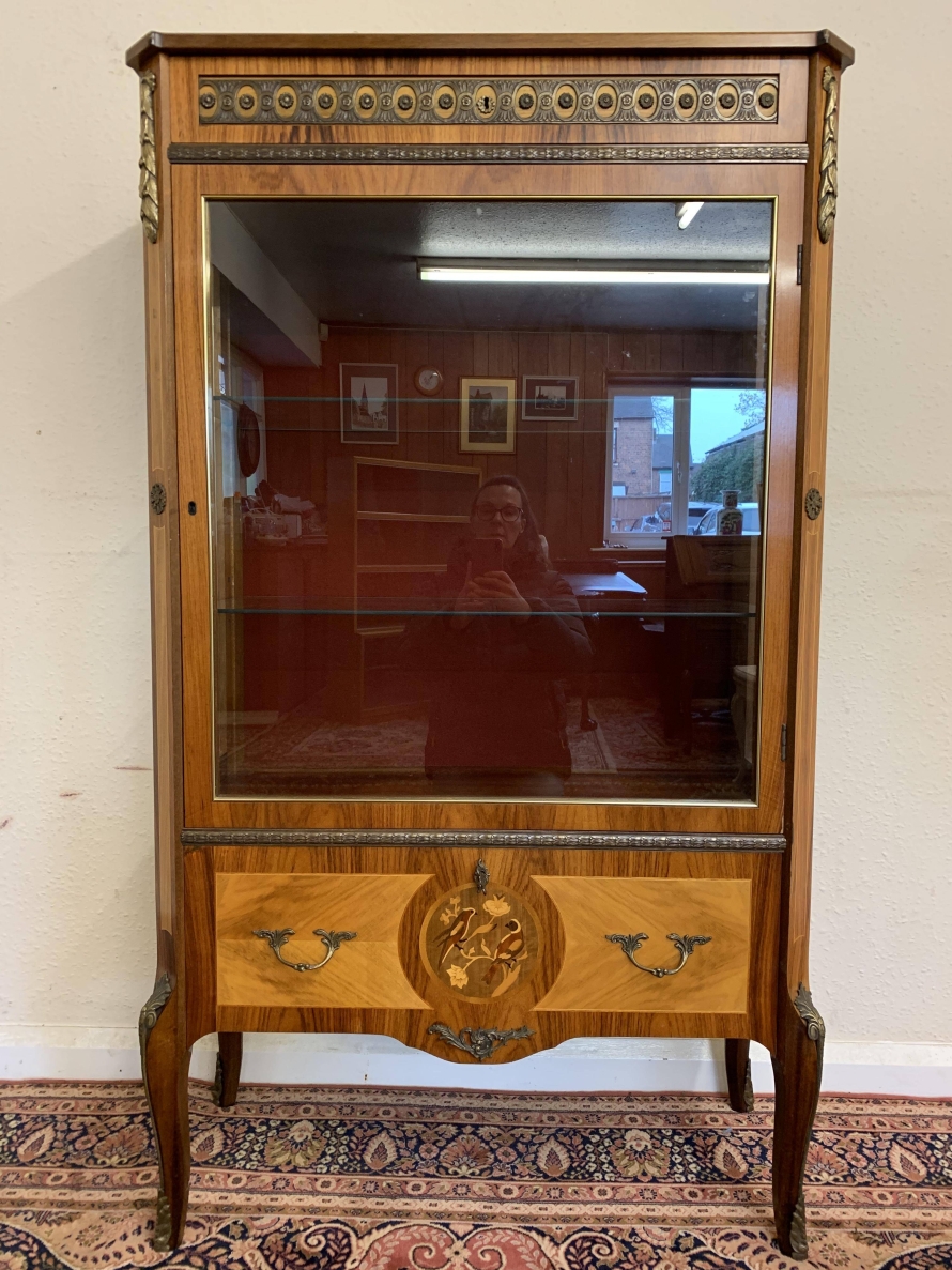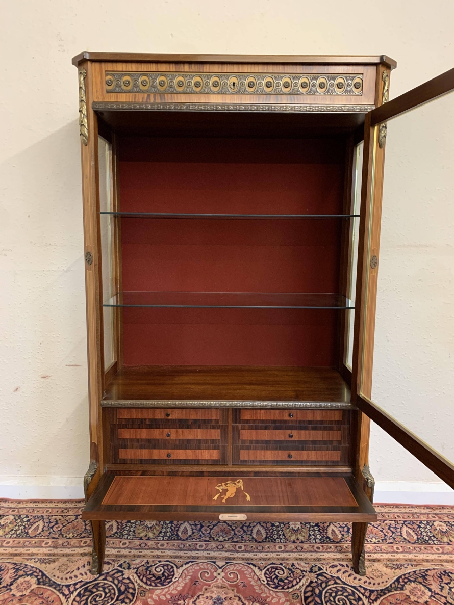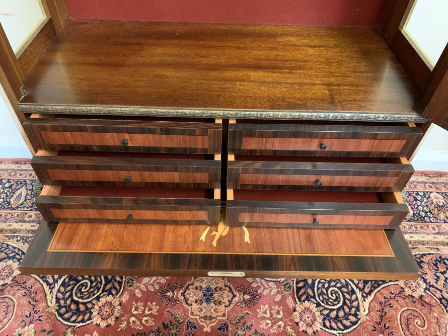 A truly exceptional item of furniture produced by the renowned Epstein Brothers Furniture Company. The cross banded inlaid top has a lockable drawer below, the drawer has stunning ormolu decoration. Below is a glazed lockable door, the glazed panel having brass piping to the edge. The door opens to reveal two glass adjustable and removable shelves. The sides of the cabinet are also glazed, and have ormolu mount decoration. Below the glazed door is a lockable fall front, the front having two decorative handles with exceptional marquetry bird inlay decoration. The fall drops to reveal a fabulous inlaid cherub figure. There are six drawers. Quartered inlaid decoration to the sides, this outstanding quality cabinet stands on four elegant shaped legs each with ormolu mounts.