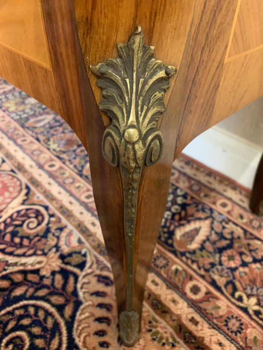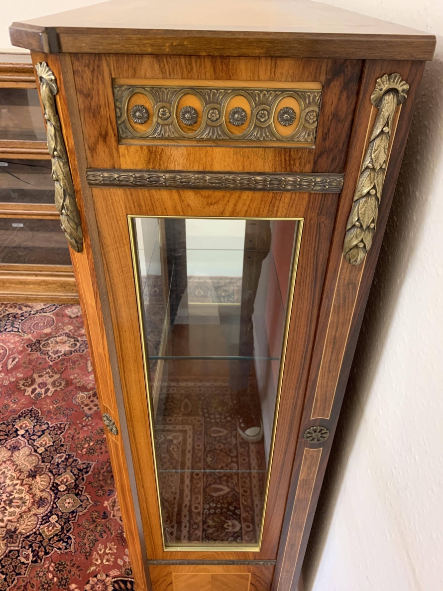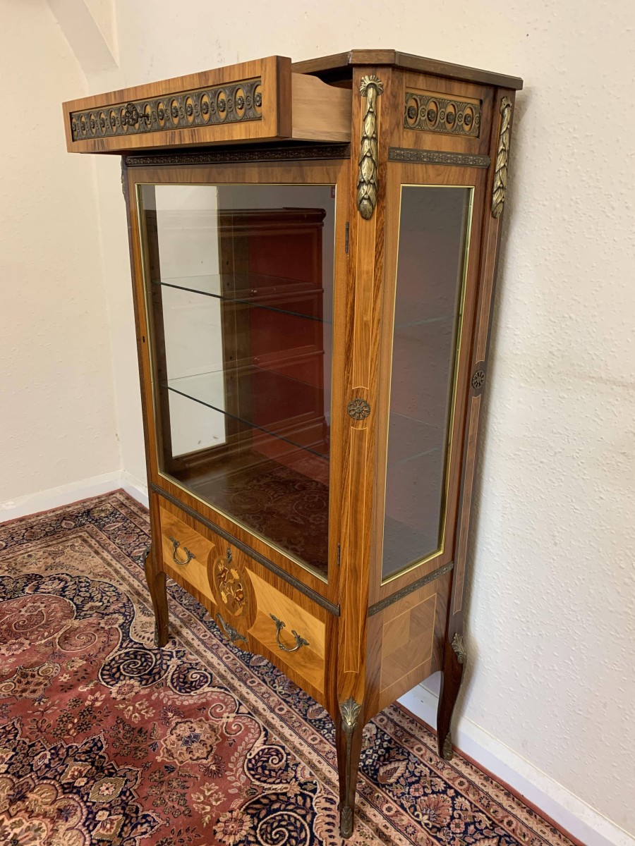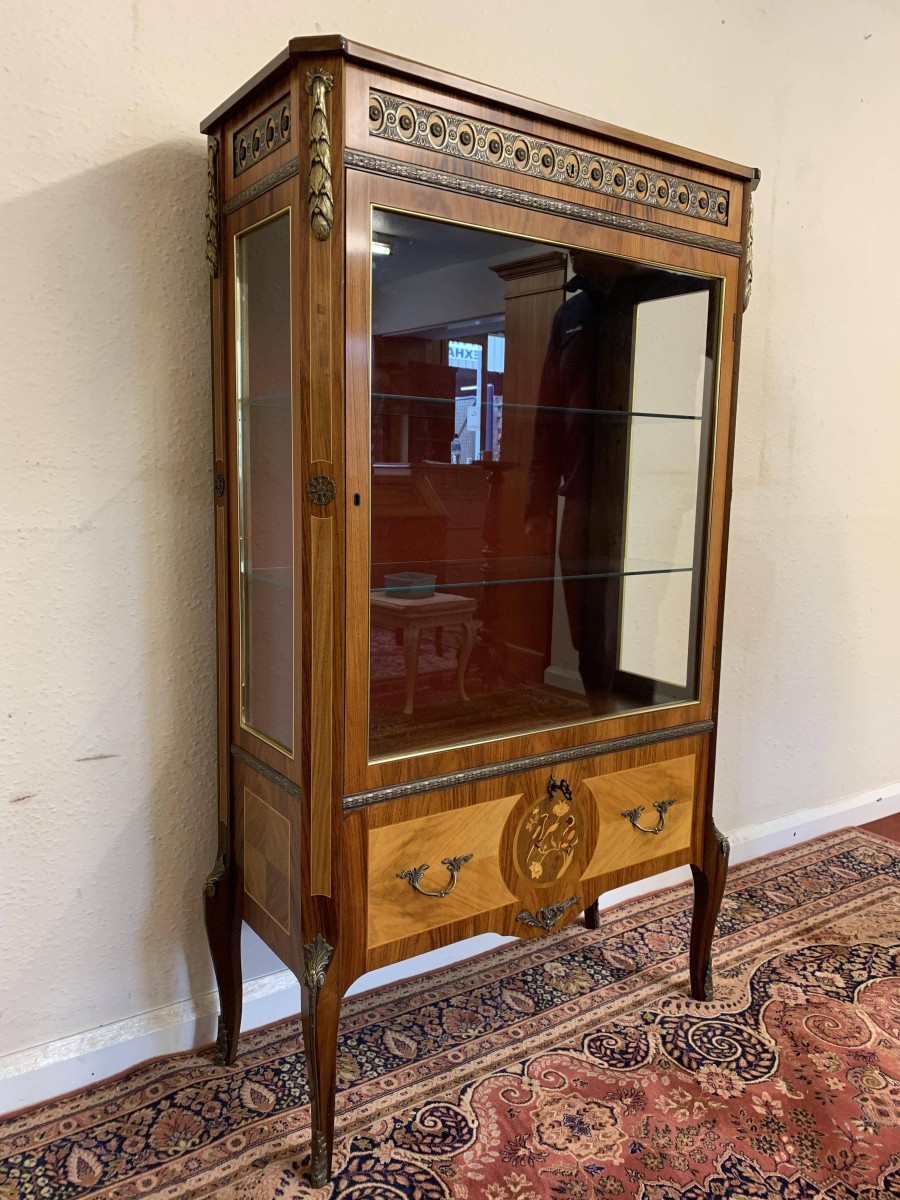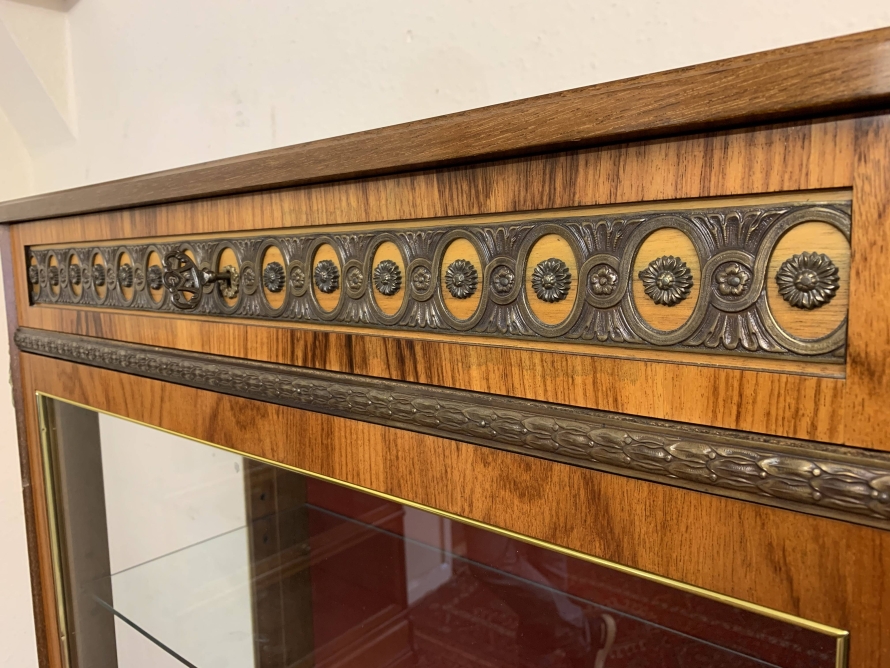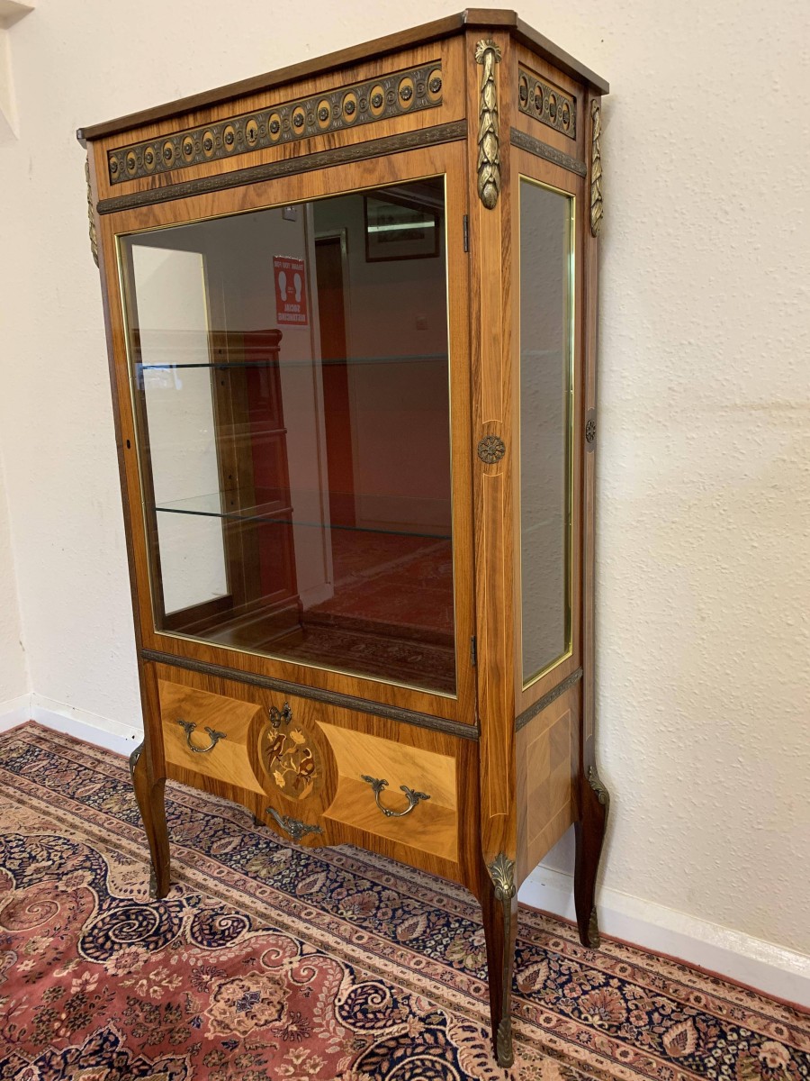A truly exceptional item of furniture produced by the renowned Epstein Brothers Furniture Company. The cross banded inlaid top has a lockable drawer below, the drawer has stunning ormolu decoration. Below is a glazed lockable door, the glazed panel having brass piping to the edge. The door opens to reveal two glass adjustable and removable shelves. The sides of the cabinet are also glazed, and have ormolu mount decoration. Below the glazed door is a lockable fall front, the front having two decorative handles with exceptional marquetry bird inlay decoration. The fall drops to reveal a fabulous inlaid cherub figure. There are six drawers. Quartered inlaid decoration to the sides, this outstanding quality cabinet stands on four elegant shaped legs each with ormolu mounts.