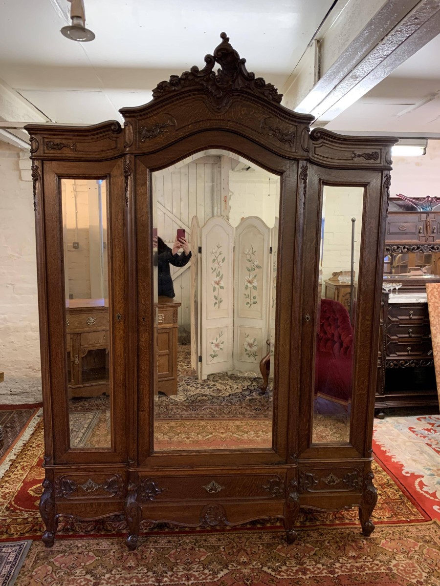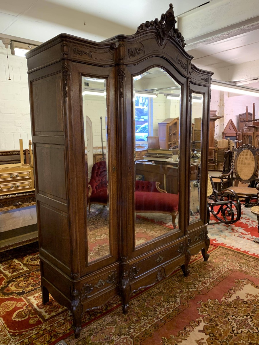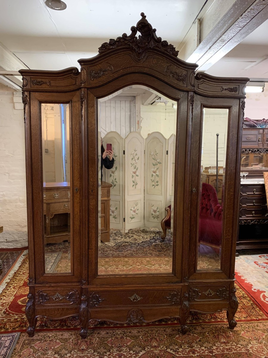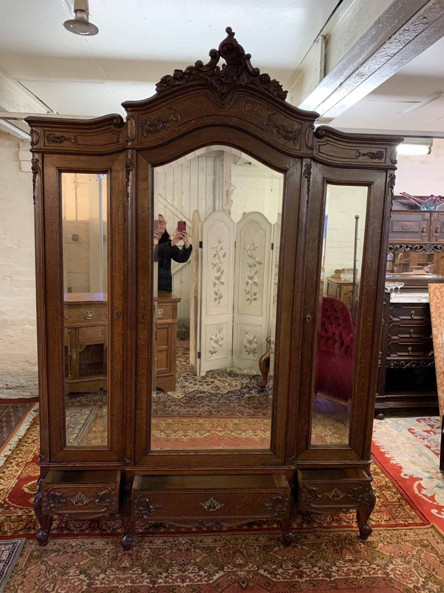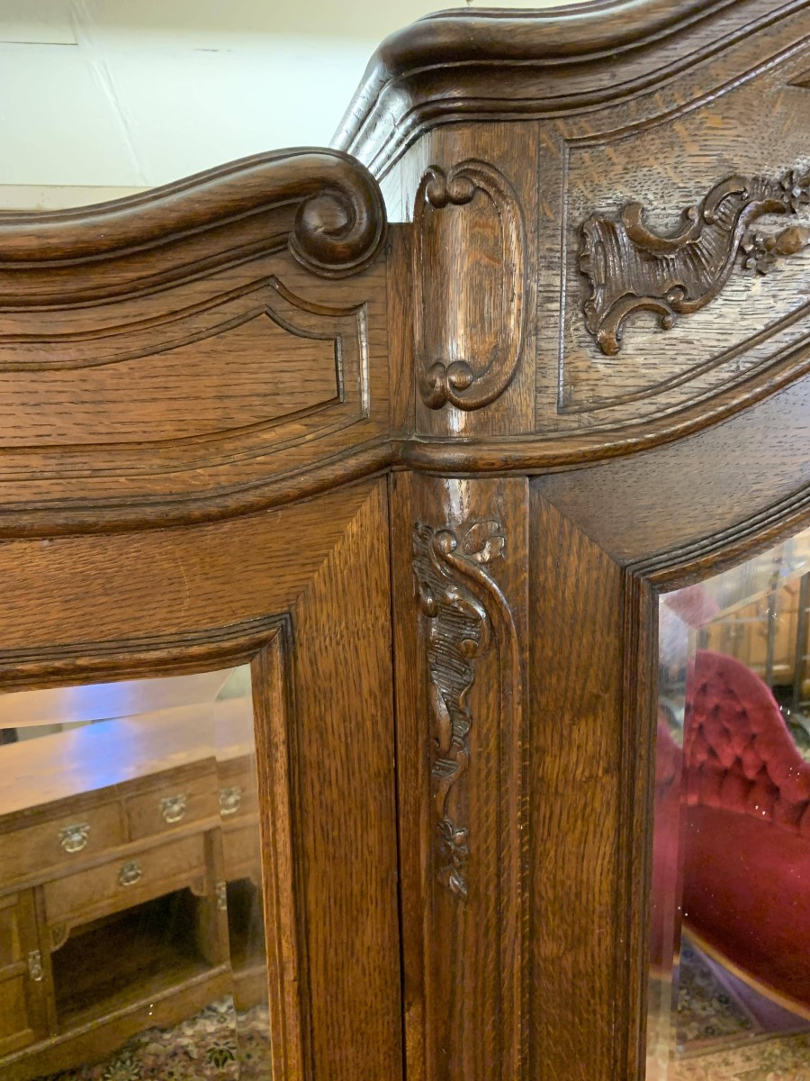 Made in glorious carved solid oak. The shaped oversailing top rises to a fabulous central carving. Below is a central brakefront full length bevel edged mirrored door which is flanked by a pair of full length bevelled mirrored smaller doors. Each door has decorative carvings to the sides. The left-hand door opens to reveal three adjustable and removable shelves. The central brake front door and right hand door open to reveal a metal hanging rail and offering ample storage. Below are three carved drawers, each drawer having decorative brass handle. Recessed panelled sides, shaped skirt with decorative central carving – this stunning Antique French armoire stands on four carved cabriole legs to the front.