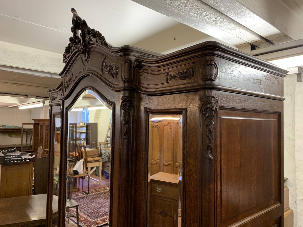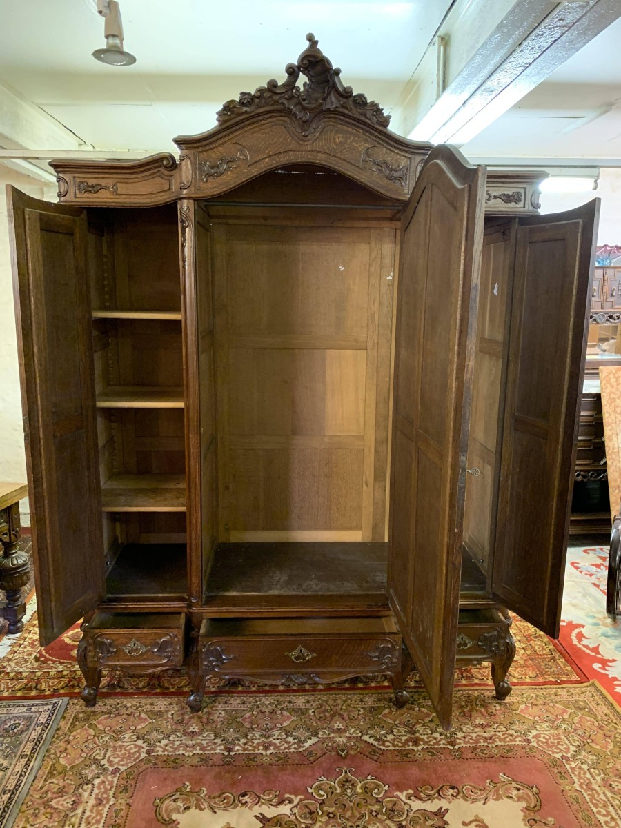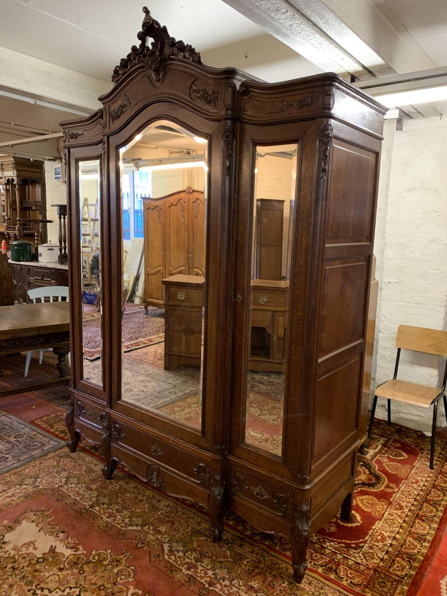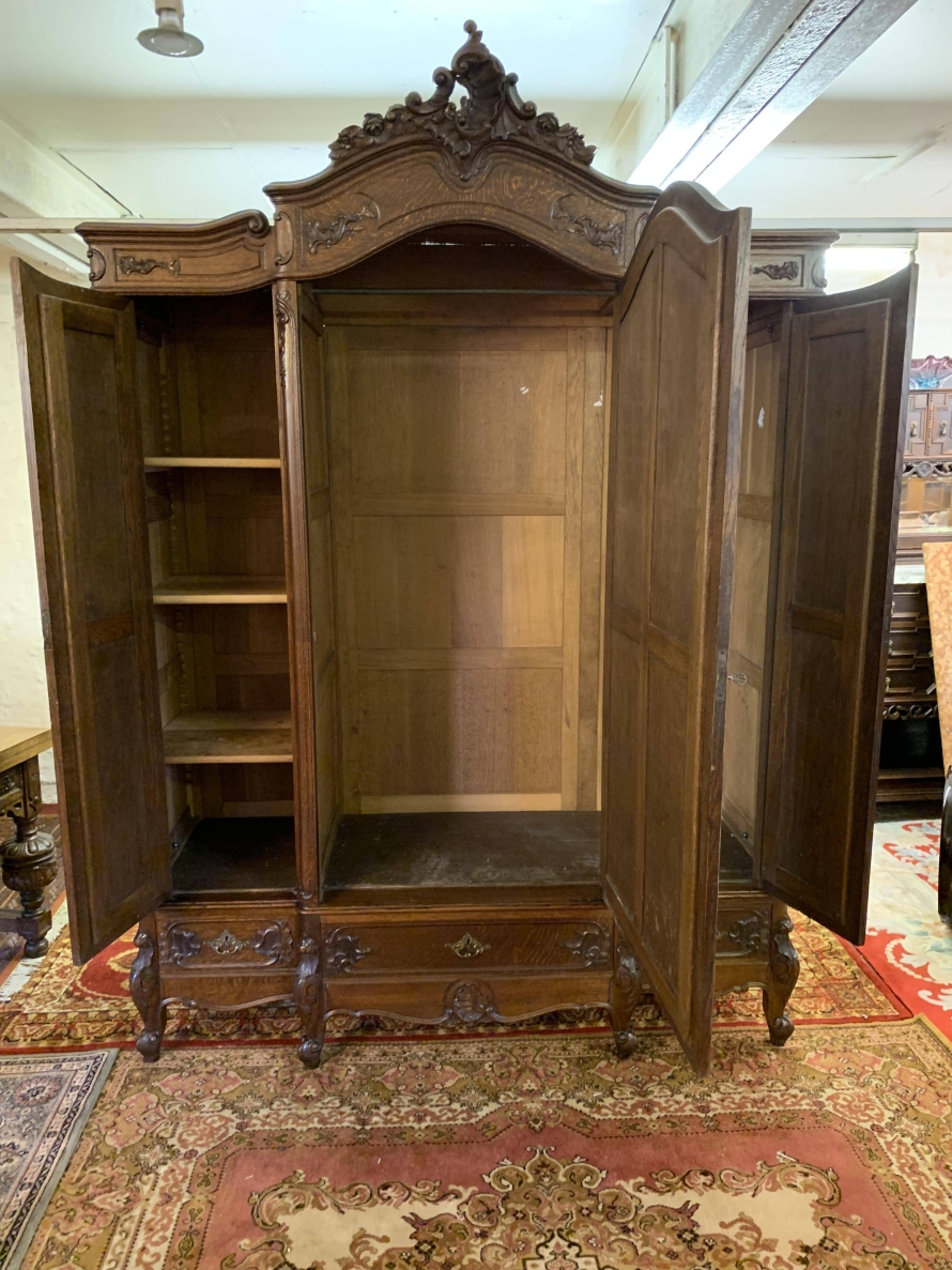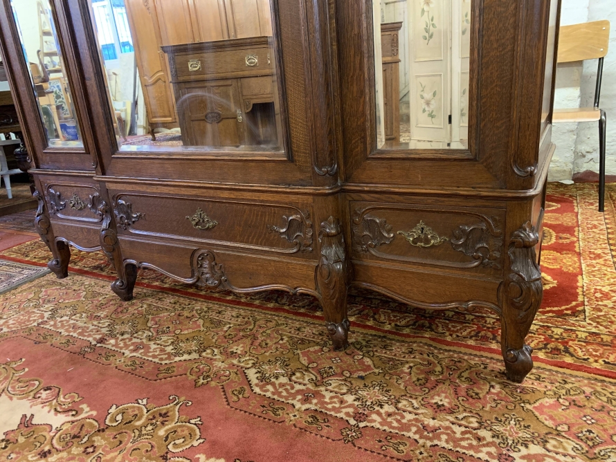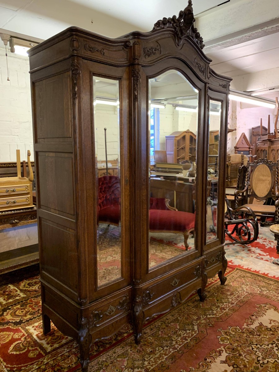 Made in glorious carved solid oak. The shaped oversailing top rises to a fabulous central carving. Below is a central brakefront full length bevel edged mirrored door which is flanked by a pair of full length bevelled mirrored smaller doors. Each door has decorative carvings to the sides. The left-hand door opens to reveal three adjustable and removable shelves. The central brake front door and right hand door open to reveal a metal hanging rail and offering ample storage. Below are three carved drawers, each drawer having decorative brass handle. Recessed panelled sides, shaped skirt with decorative central carving – this stunning Antique French armoire stands on four carved cabriole legs to the front.