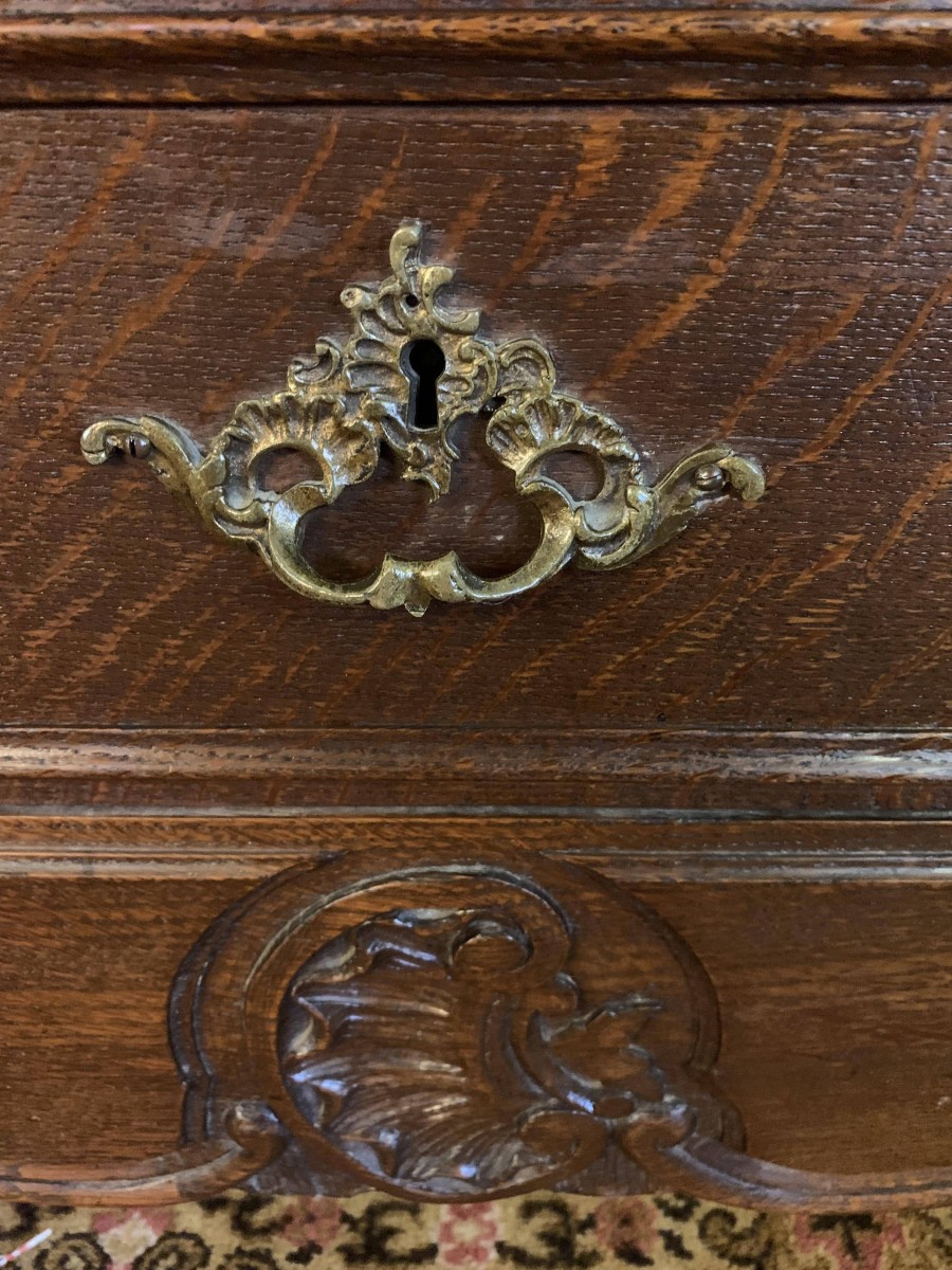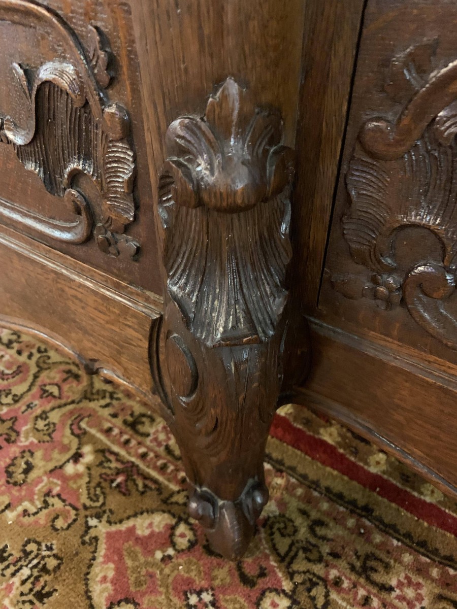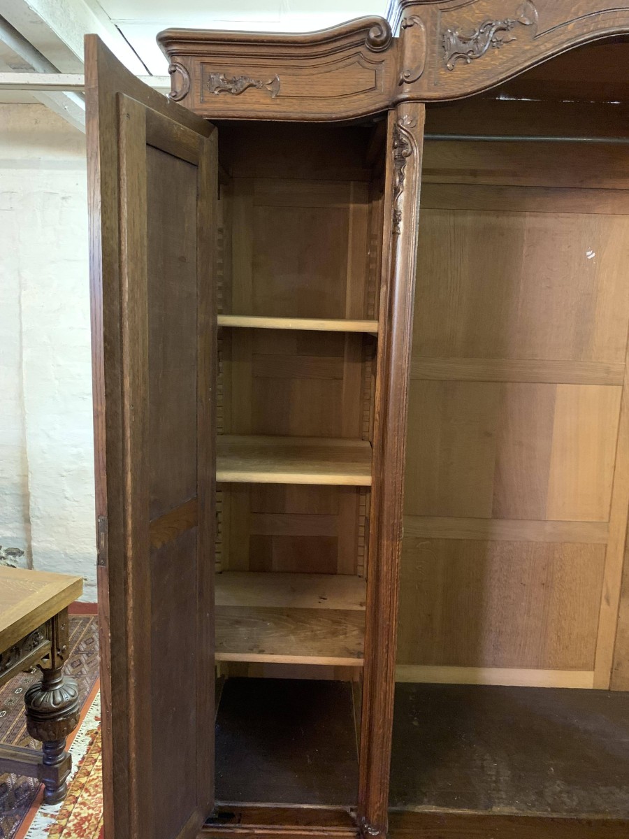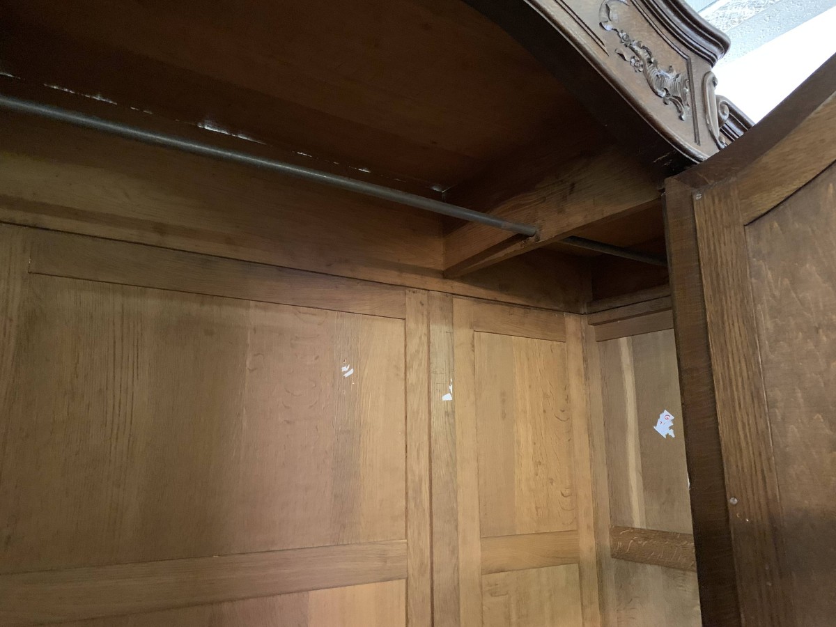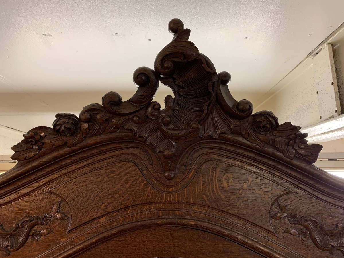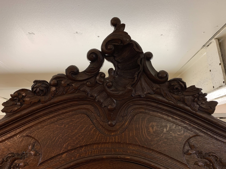 Made in glorious carved solid oak. The shaped oversailing top rises to a fabulous central carving. Below is a central brakefront full length bevel edged mirrored door which is flanked by a pair of full length bevelled mirrored smaller doors. Each door has decorative carvings to the sides. The left-hand door opens to reveal three adjustable and removable shelves. The central brake front door and right hand door open to reveal a metal hanging rail and offering ample storage. Below are three carved drawers, each drawer having decorative brass handle. Recessed panelled sides, shaped skirt with decorative central carving – this stunning Antique French armoire stands on four carved cabriole legs to the front.