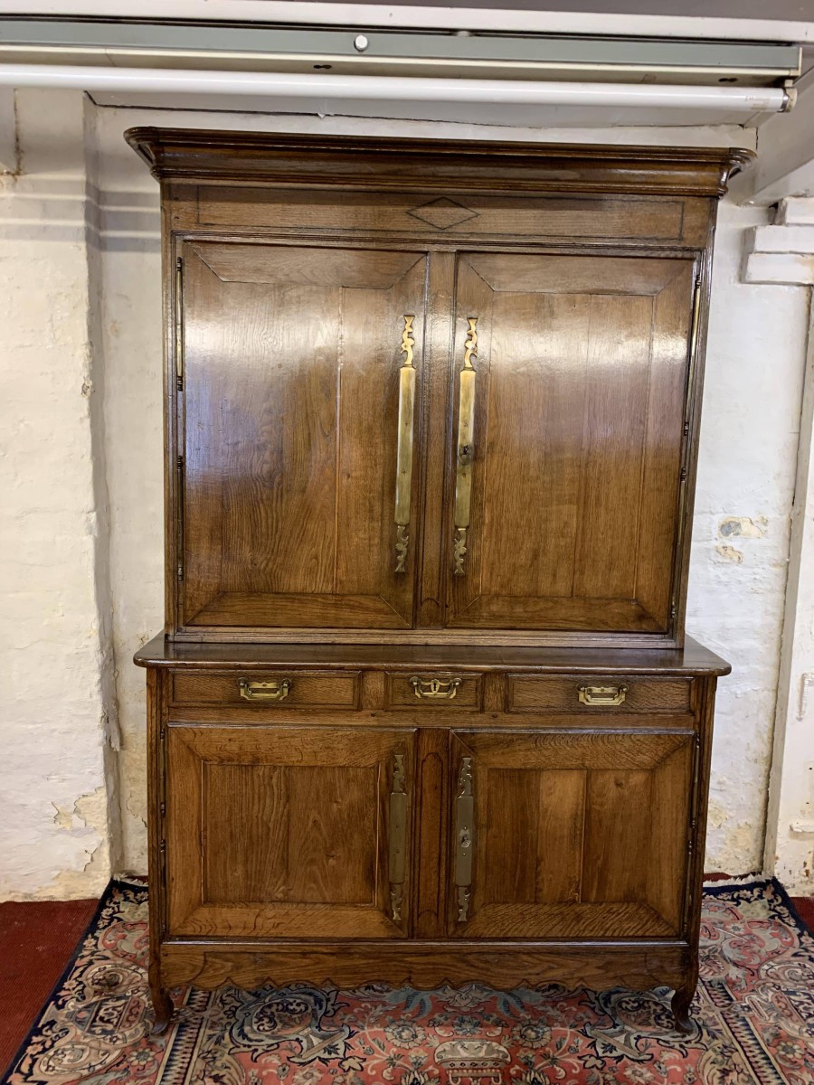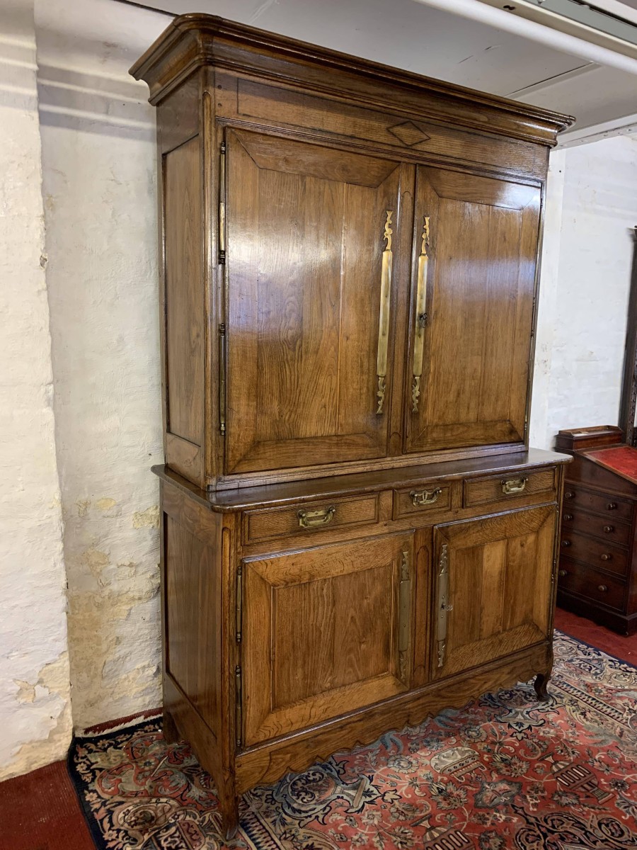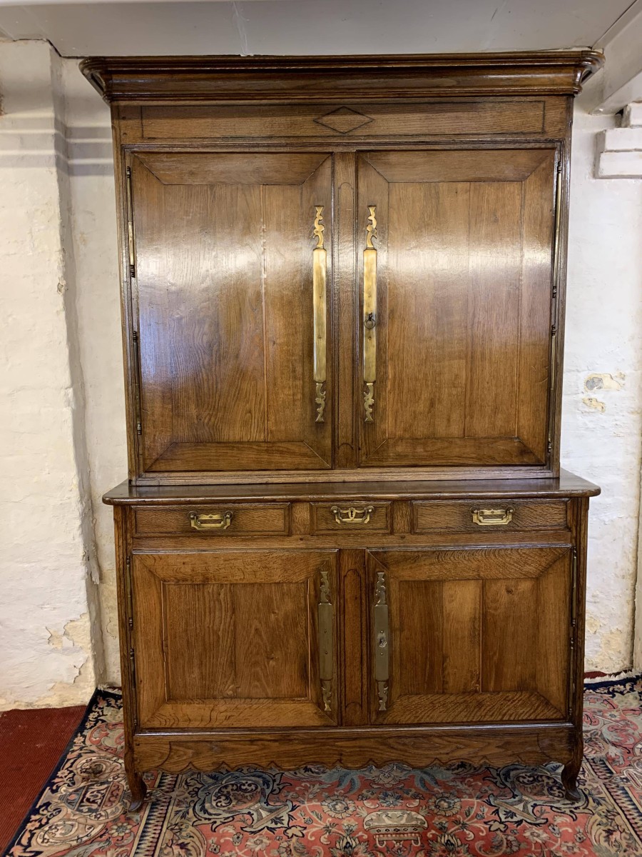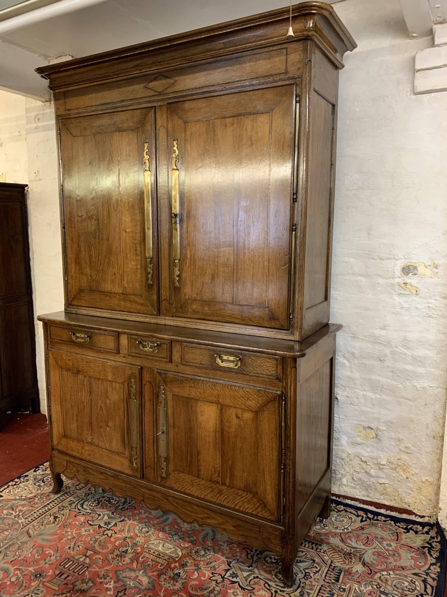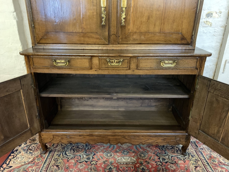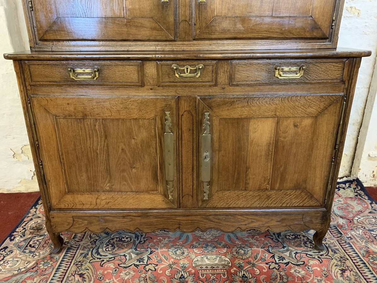 A fine example of French country oak furniture. The rounded removable cornice sits above a pair of lockable cupboard doors, the doors have key, brass hinges and brass peacock decorated cover plates. The doors open to reveal two removable shelves. The base has three drawers, each drawer having substantial brass handle, the drawers sit above a pair of lockable cupboard doors, each door having brass hinges, key and brass peacock decorated cover plates. The doors open to reveal a removable shelf. Recessed panelled sides shaped skirt, this stunning original cupboard stands proud on two cabriole shaped legs to the front.