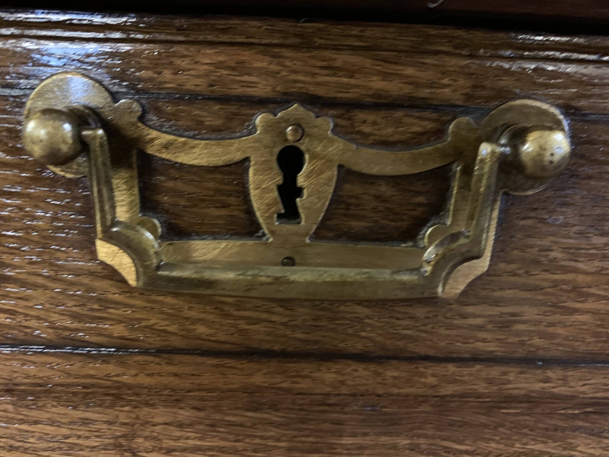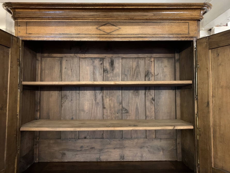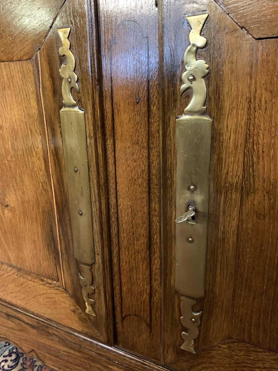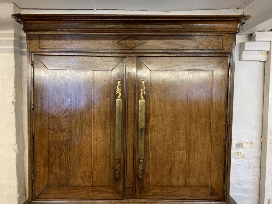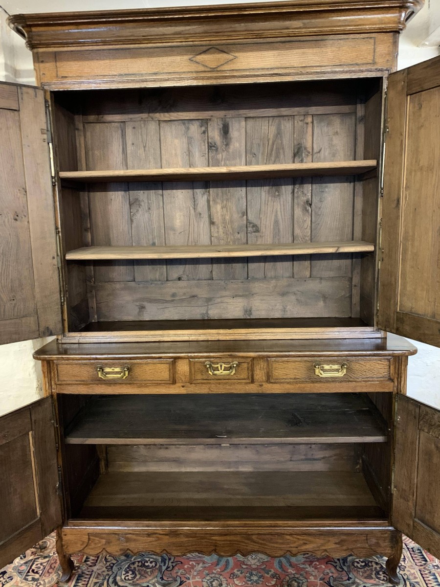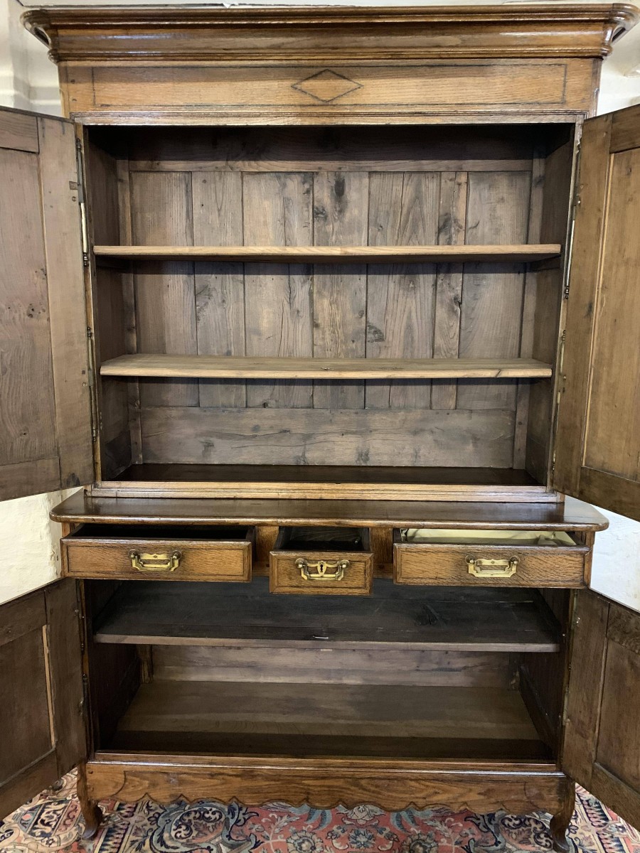A fine example of French country oak furniture. The rounded removable cornice sits above a pair of lockable cupboard doors, the doors have key, brass hinges and brass peacock decorated cover plates. The doors open to reveal two removable shelves. The base has three drawers, each drawer having substantial brass handle, the drawers sit above a pair of lockable cupboard doors, each door having brass hinges, key and brass peacock decorated cover plates. The doors open to reveal a removable shelf. Recessed panelled sides shaped skirt, this stunning original cupboard stands proud on two cabriole shaped legs to the front.