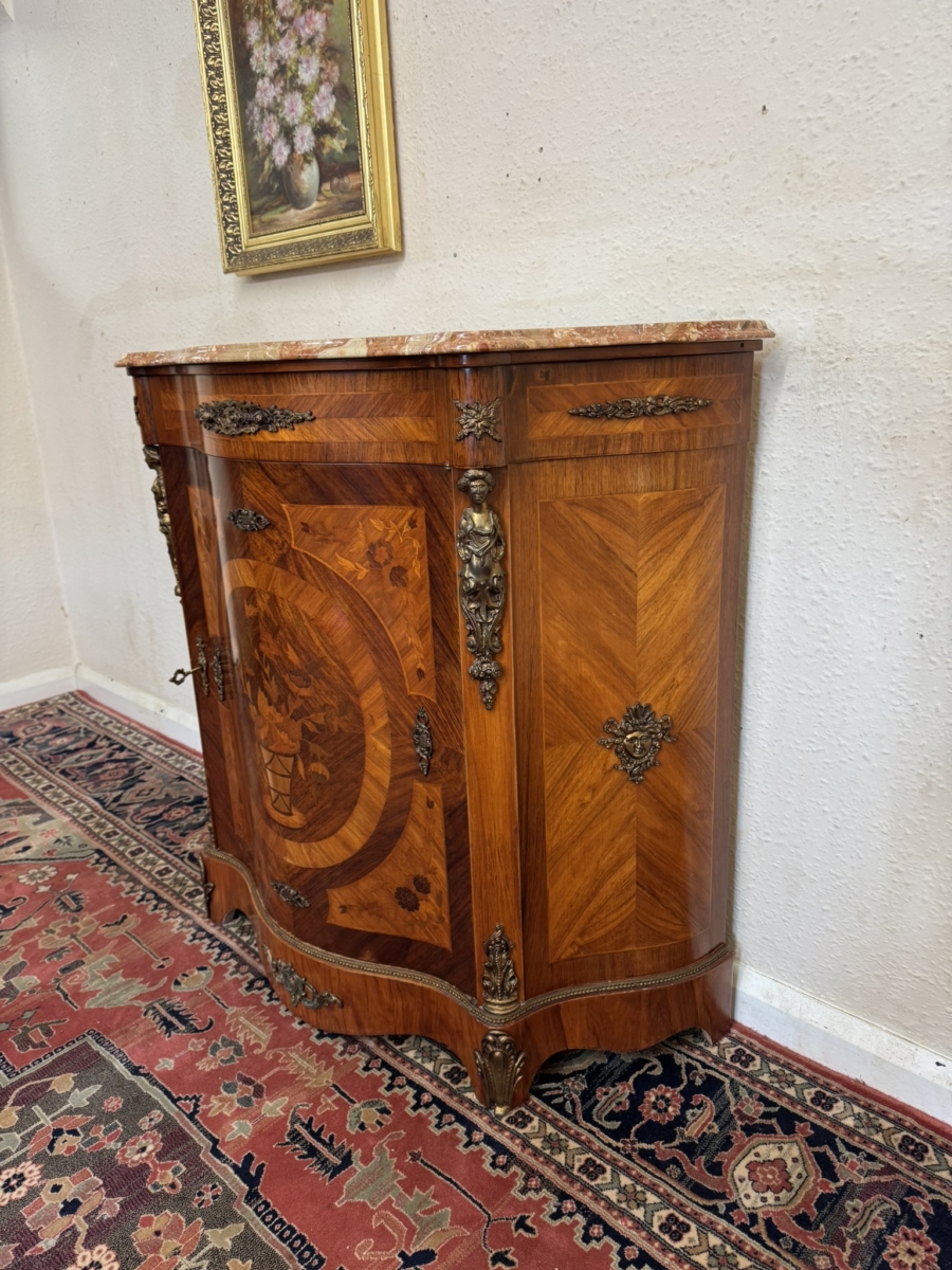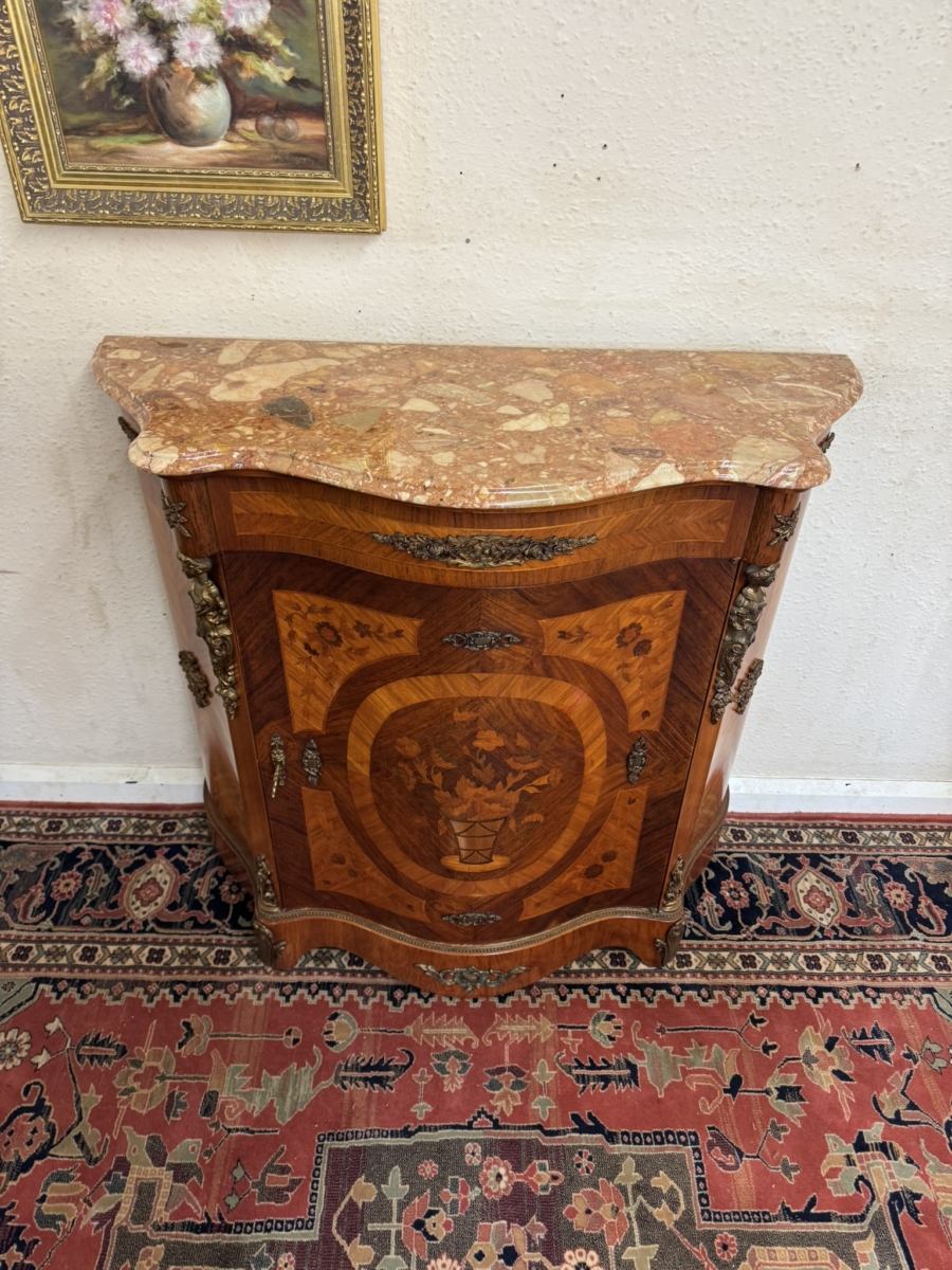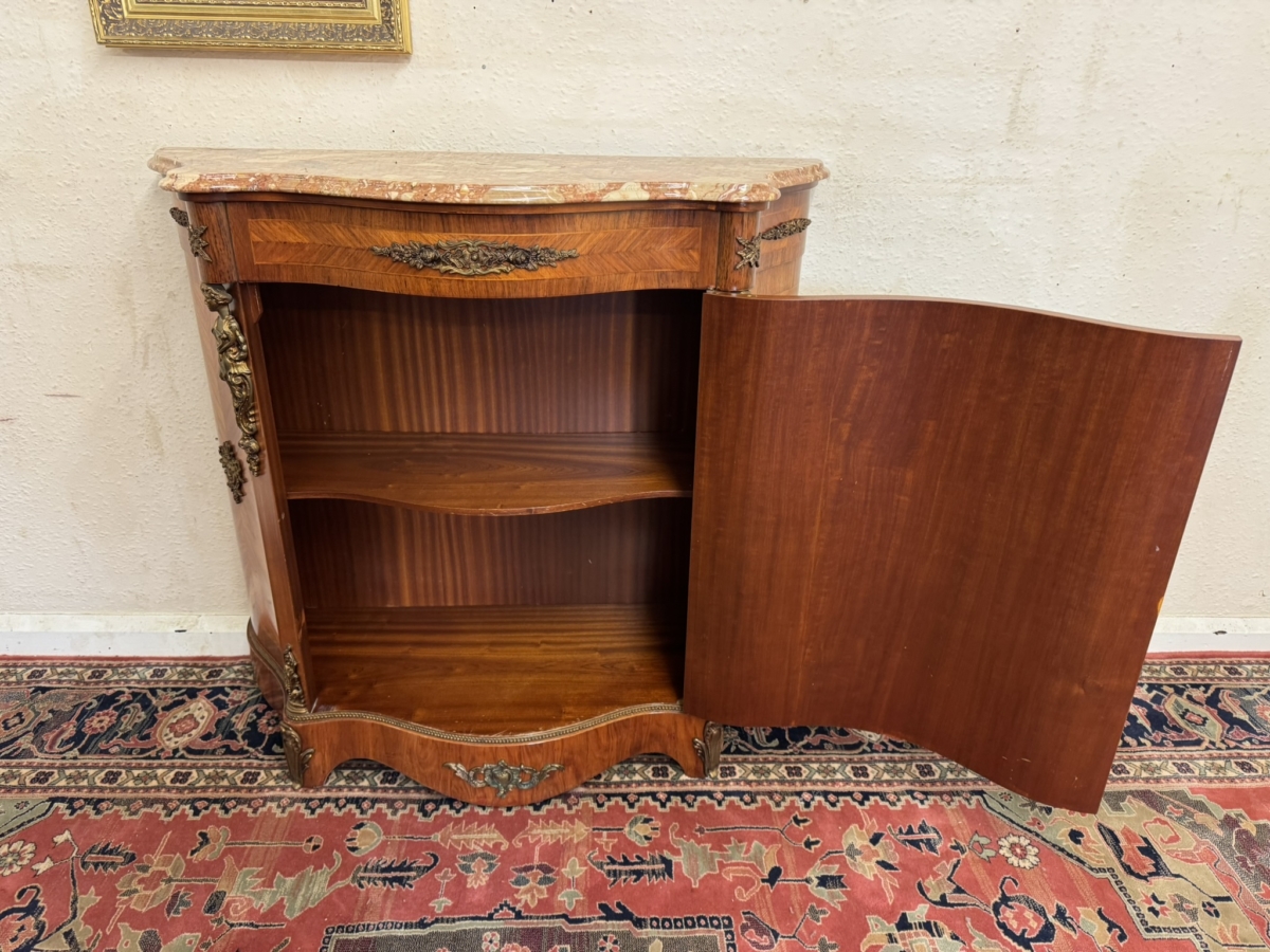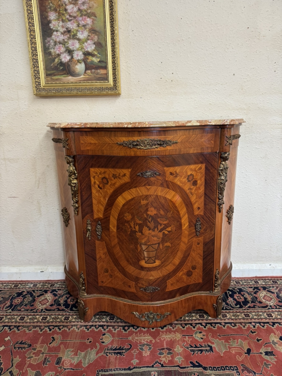 This elegant French cabinet is in excellent condition. The cabinet has a shaped marble top. The king wood base is serpentine shaped and adorned in exquisite marquetry inlay. The lockable door showcases a beautiful floral basket motif with intricate geometric and floral designs. The door opens to reveal a shaped wooden shelf. Ormolu mounts on the corners and edges. A fabulous statement item of French furniture