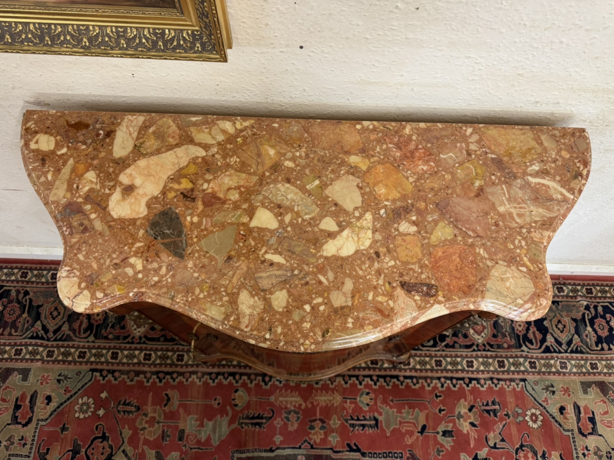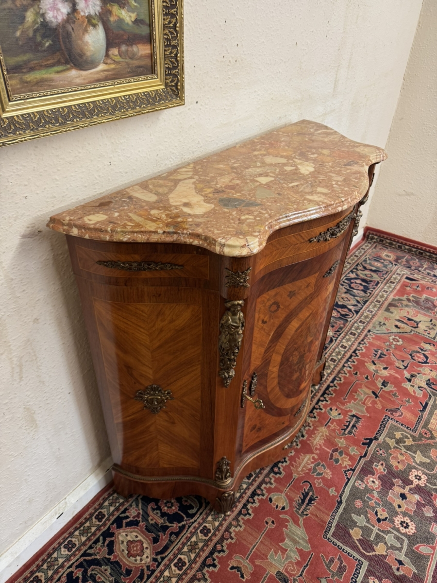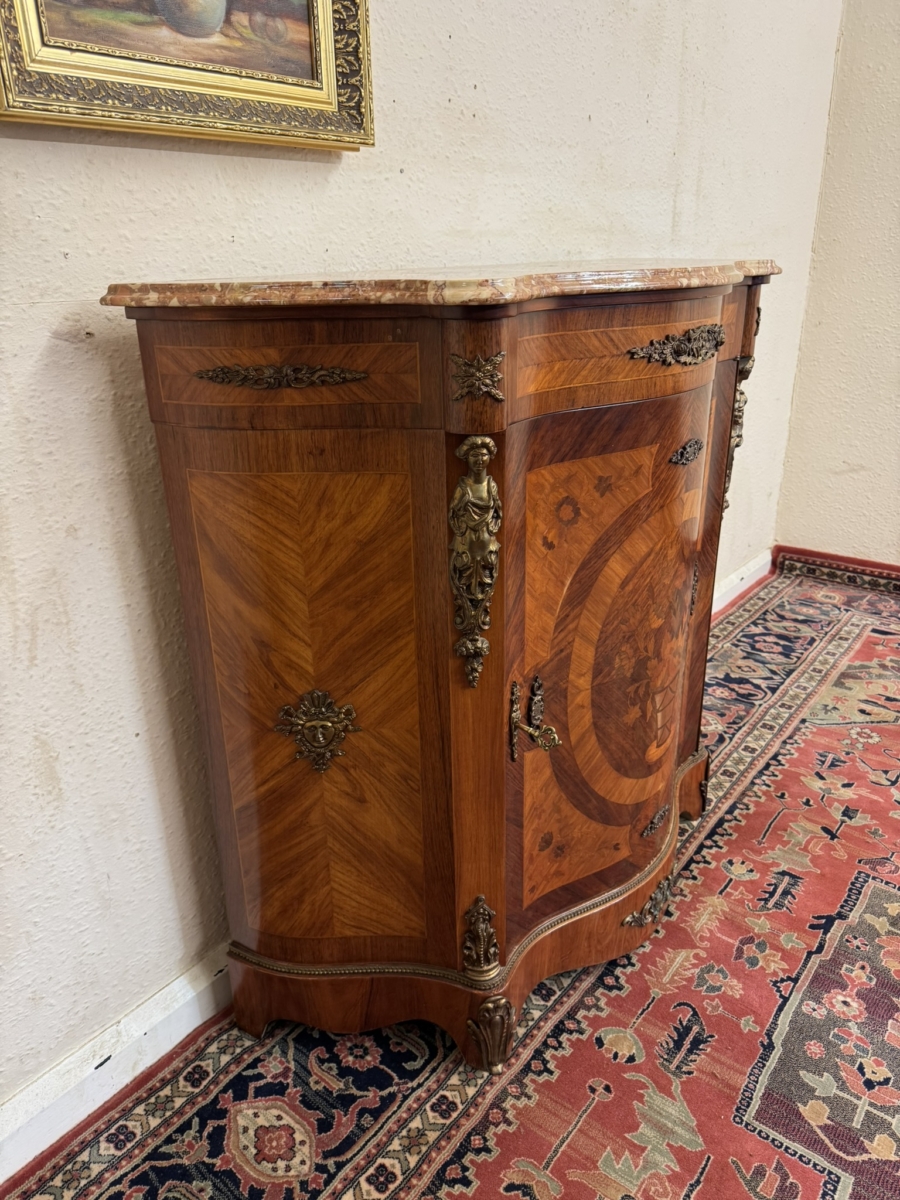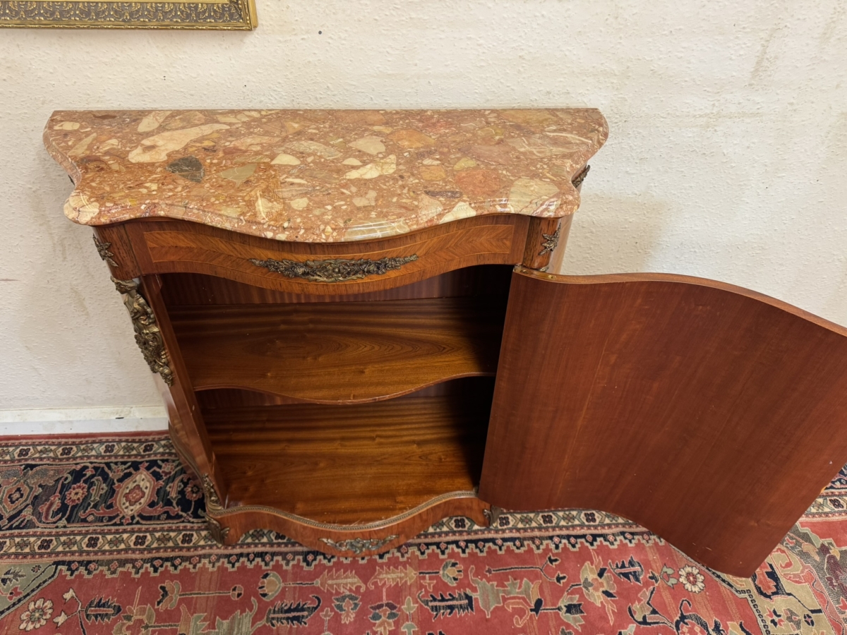 This elegant French cabinet is in excellent condition. The cabinet has a shaped marble top. The king wood base is serpentine shaped and adorned in exquisite marquetry inlay. The lockable door showcases a beautiful floral basket motif with intricate geometric and floral designs. The door opens to reveal a shaped wooden shelf. Ormolu mounts on the corners and edges. A fabulous statement item of French furniture