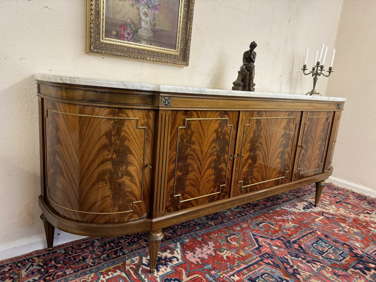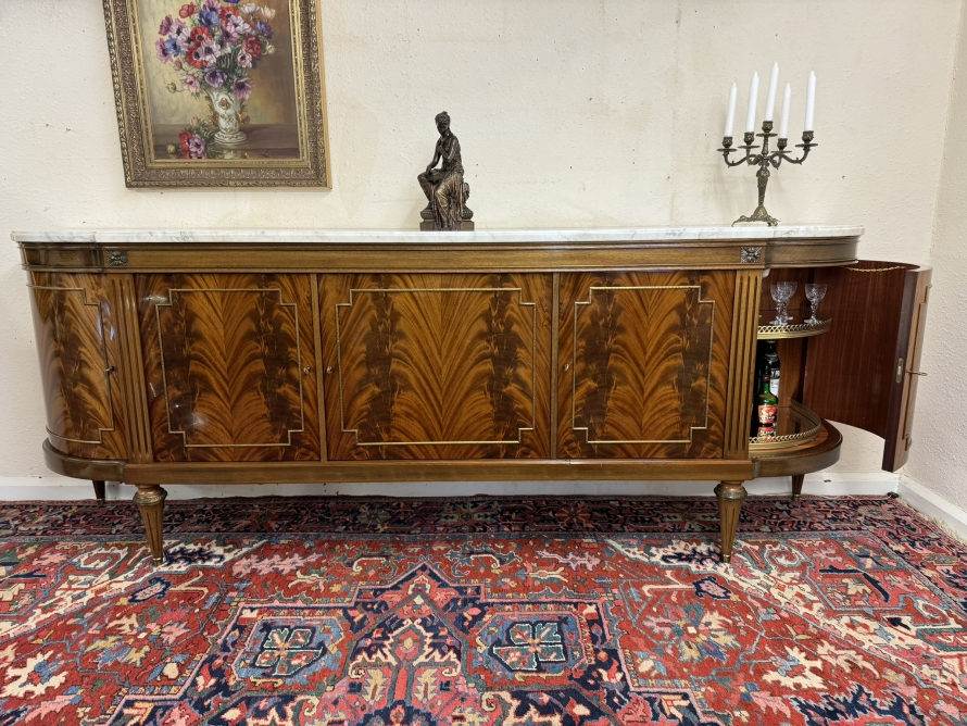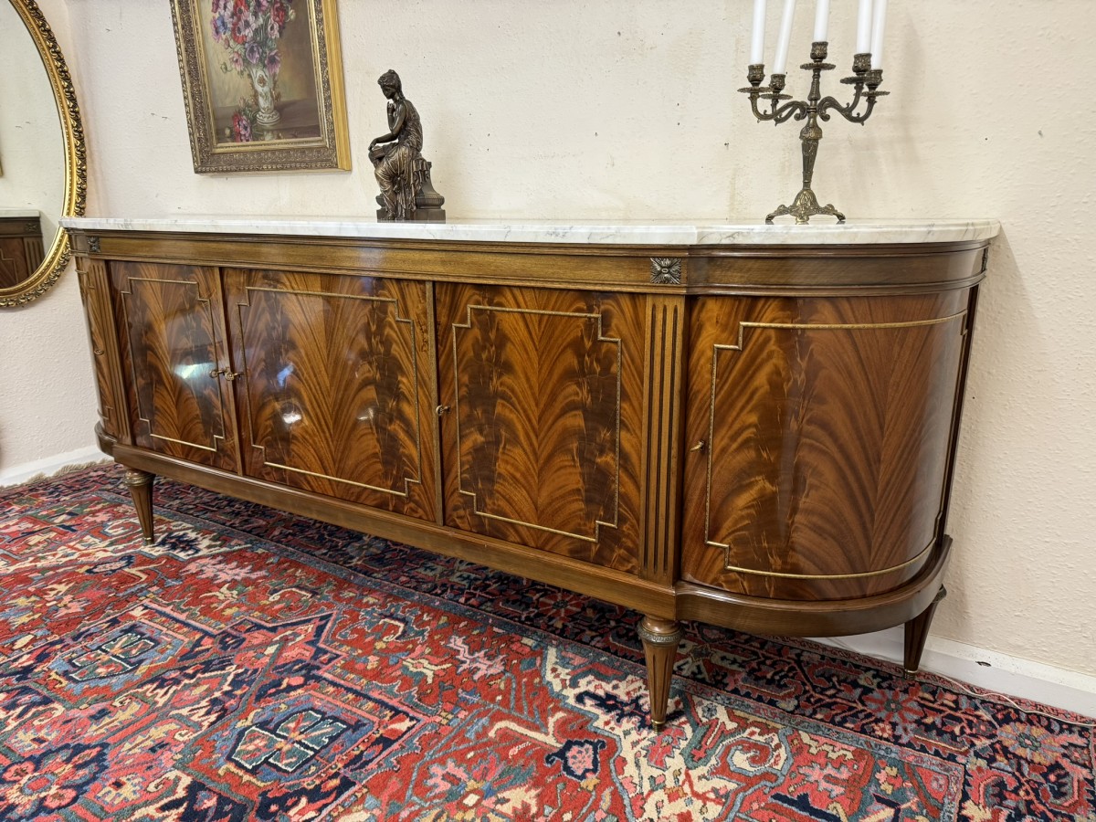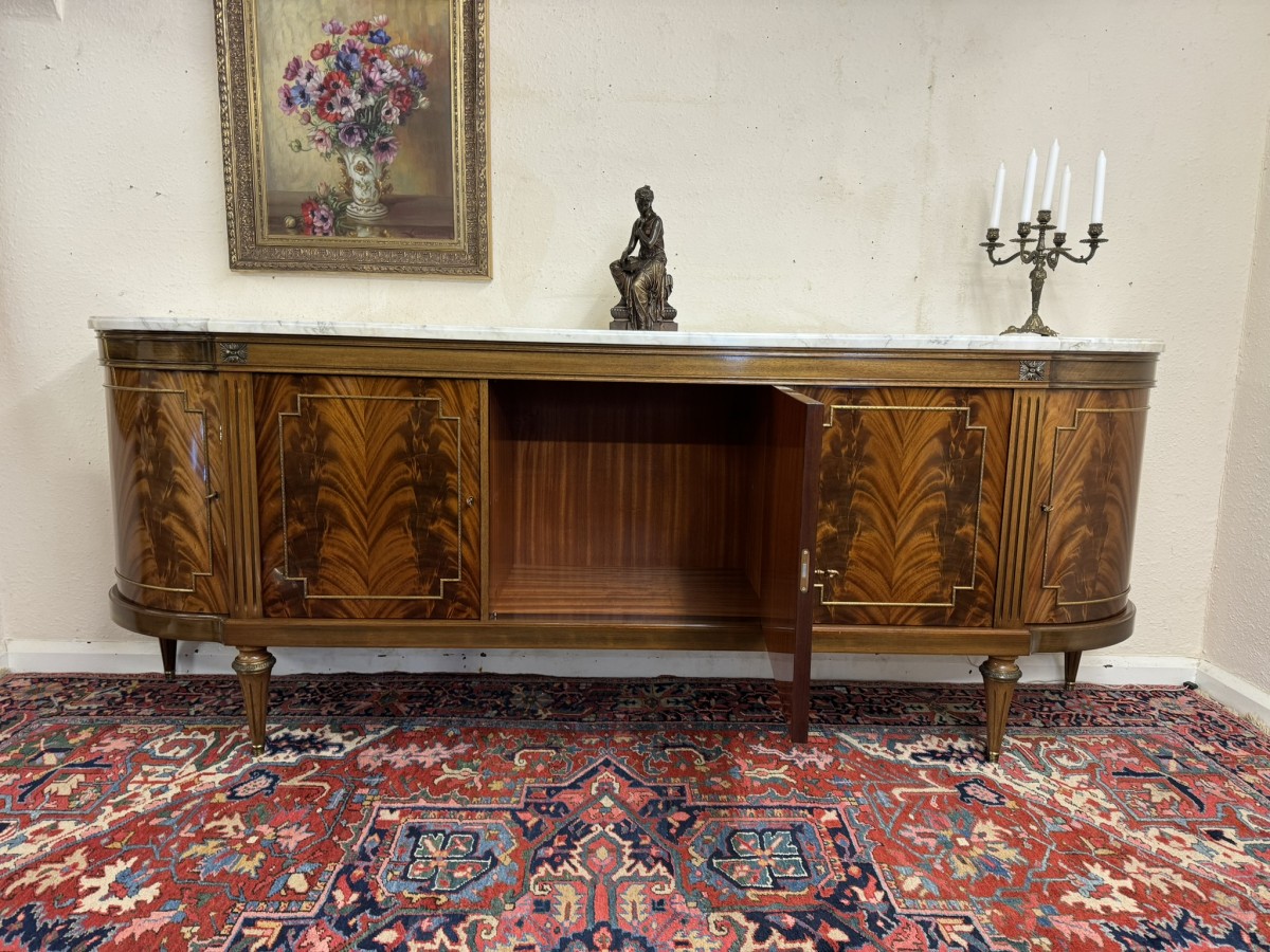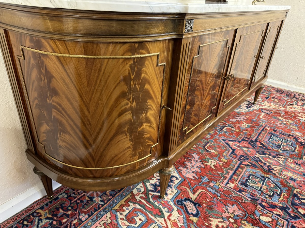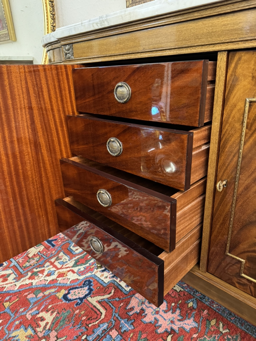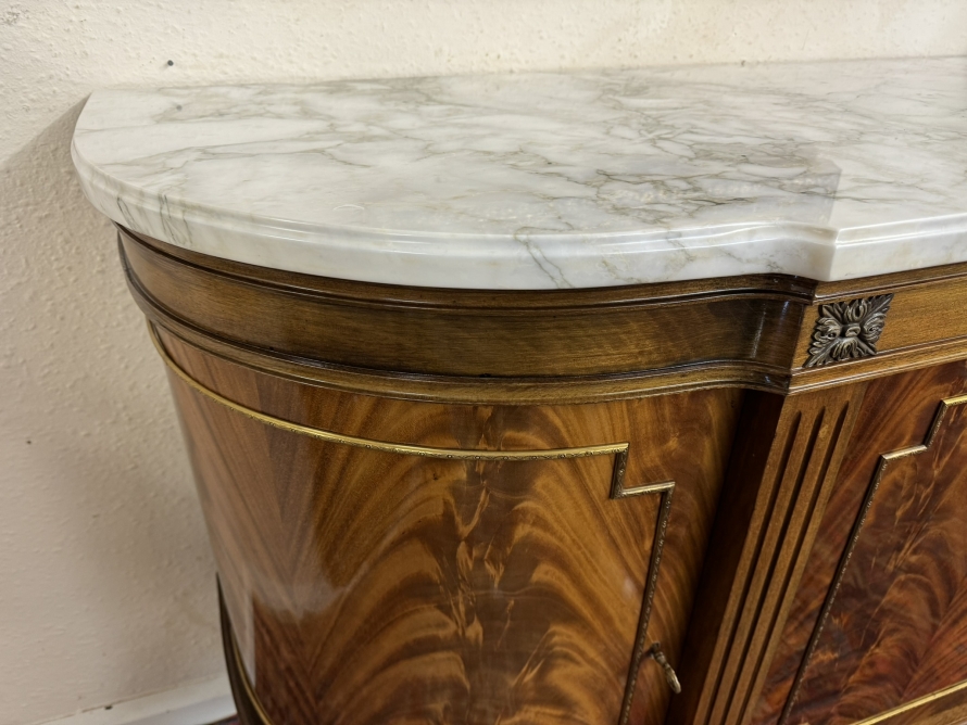 This exceptional quality French mahogany credenza has a fabulous shaped carrarra white marble top. Below are five cupboard doors the end doors are beautifully curved in shape. Each of the doors have gilt brass decoration. The left-hand curved door opens to reveal a curved shelf. The door next to the curved left side door opens to reveal four drawers, each drawer having an ornate carved handle. The central and right side front door open to reveal ample cupboard storage. The right-hand shaped door opens to reveal two mirrored shelves, the shelves having brass decoration to the front. All doors are lockable and have their own key. This outstanding quality credenza has a striking platina and stands on four turned legs with gilt brass feet.