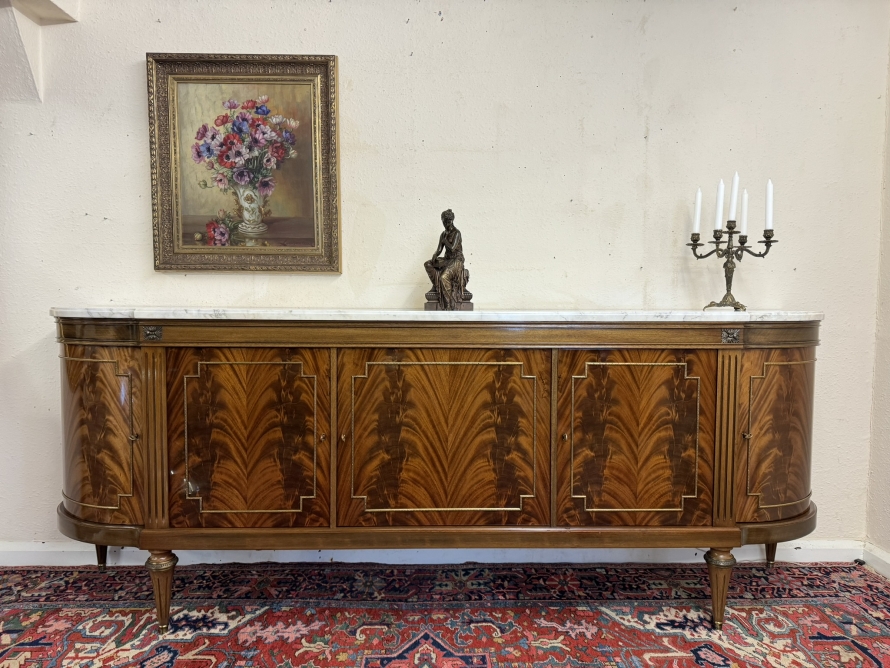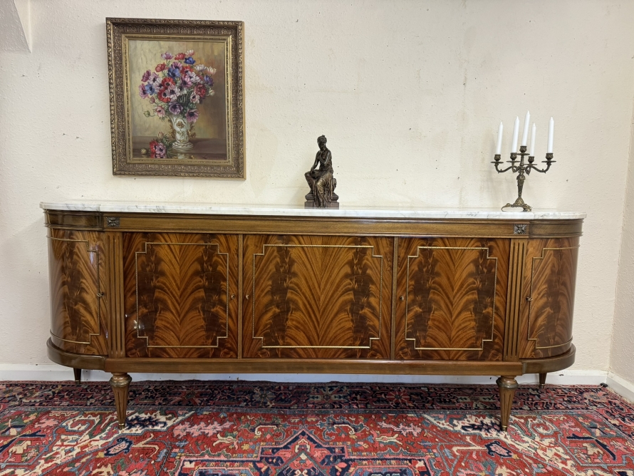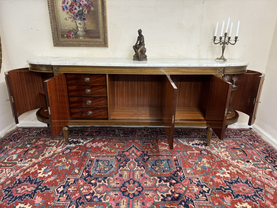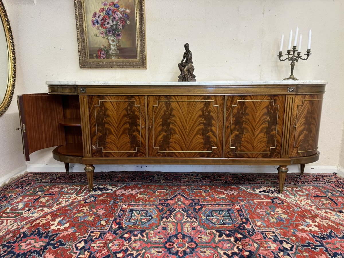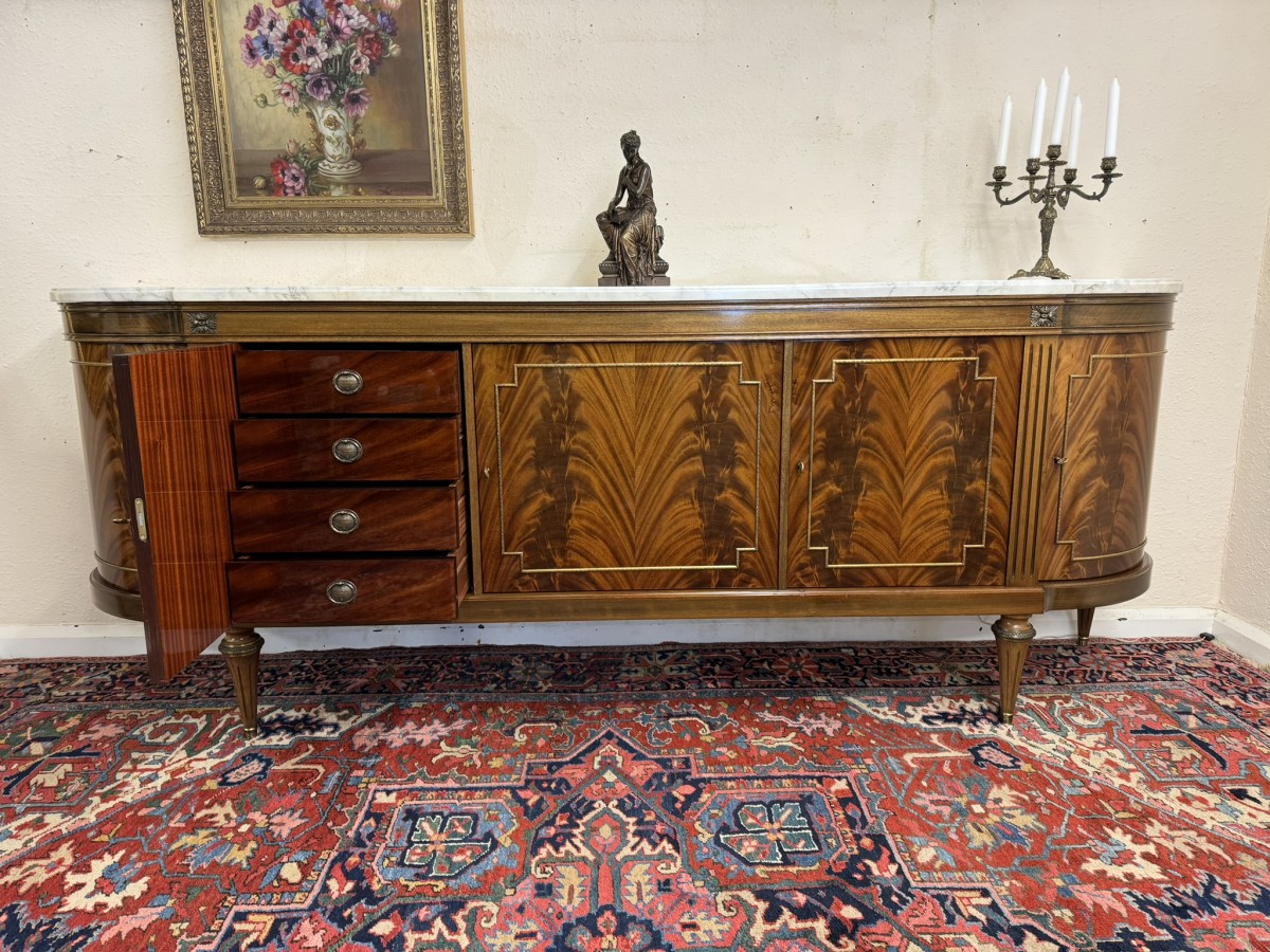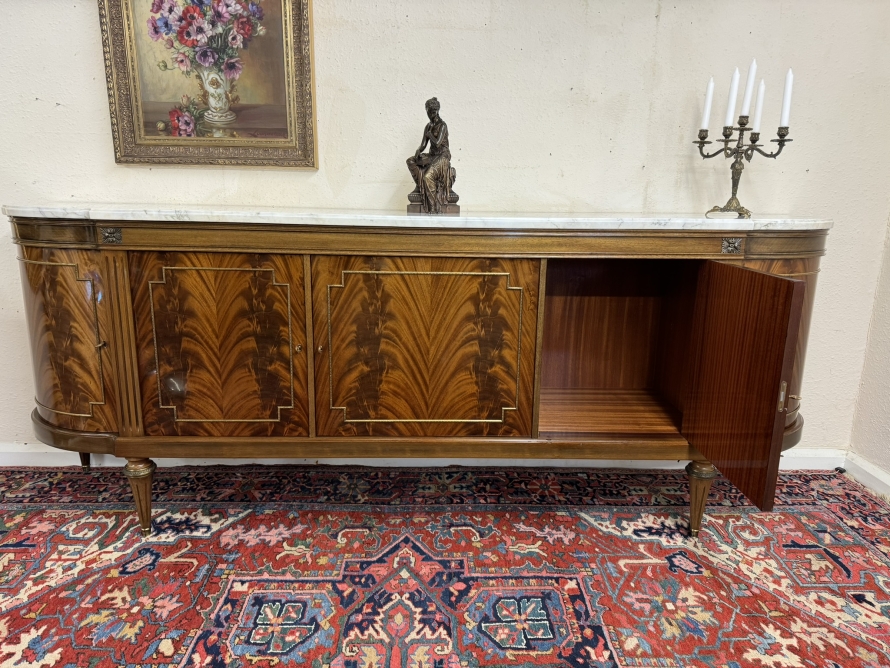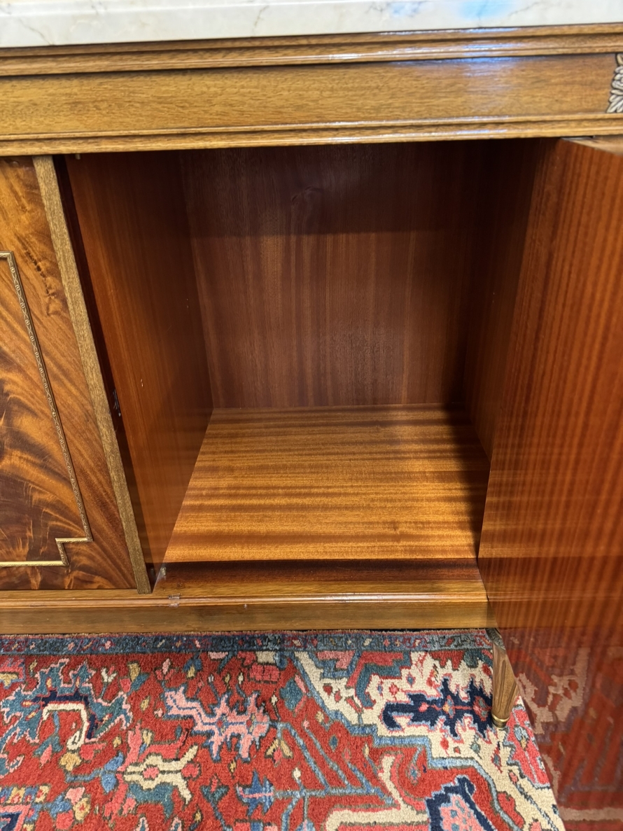 This exceptional quality French mahogany credenza has a fabulous shaped carrarra white marble top. Below are five cupboard doors the end doors are beautifully curved in shape. Each of the doors have gilt brass decoration. The left-hand curved door opens to reveal a curved shelf. The door next to the curved left side door opens to reveal four drawers, each drawer having an ornate carved handle. The central and right side front door open to reveal ample cupboard storage. The right-hand shaped door opens to reveal two mirrored shelves, the shelves having brass decoration to the front. All doors are lockable and have their own key. This outstanding quality credenza has a striking platina and stands on four turned legs with gilt brass feet.
