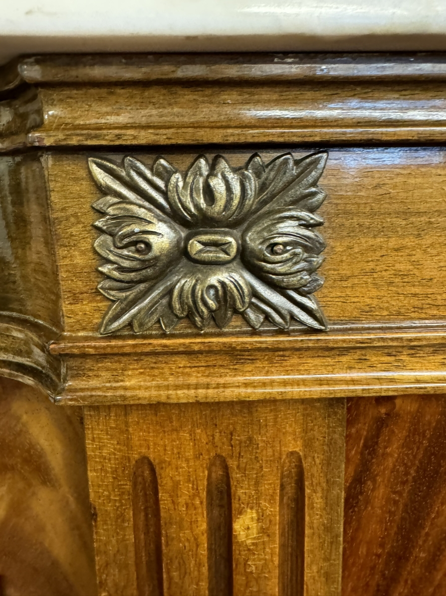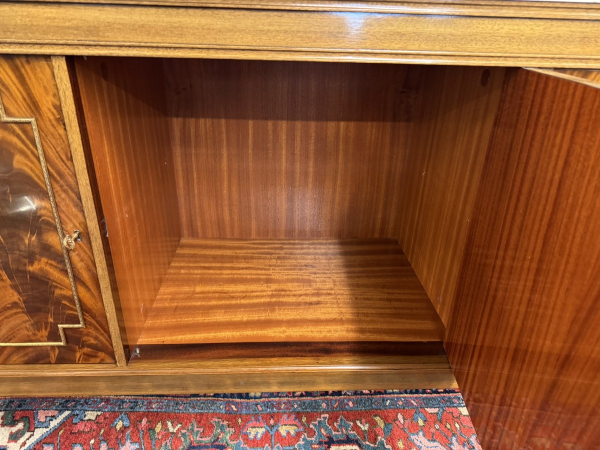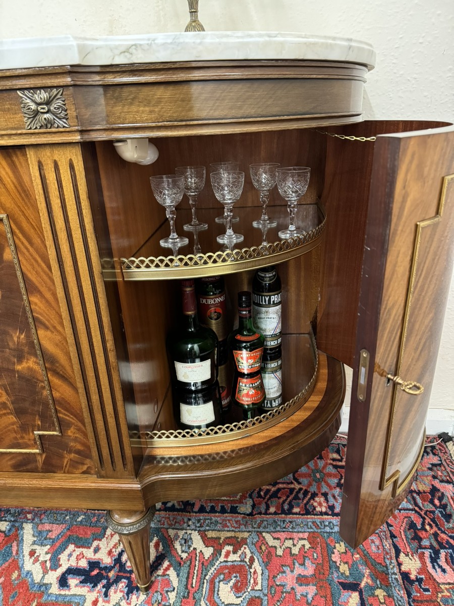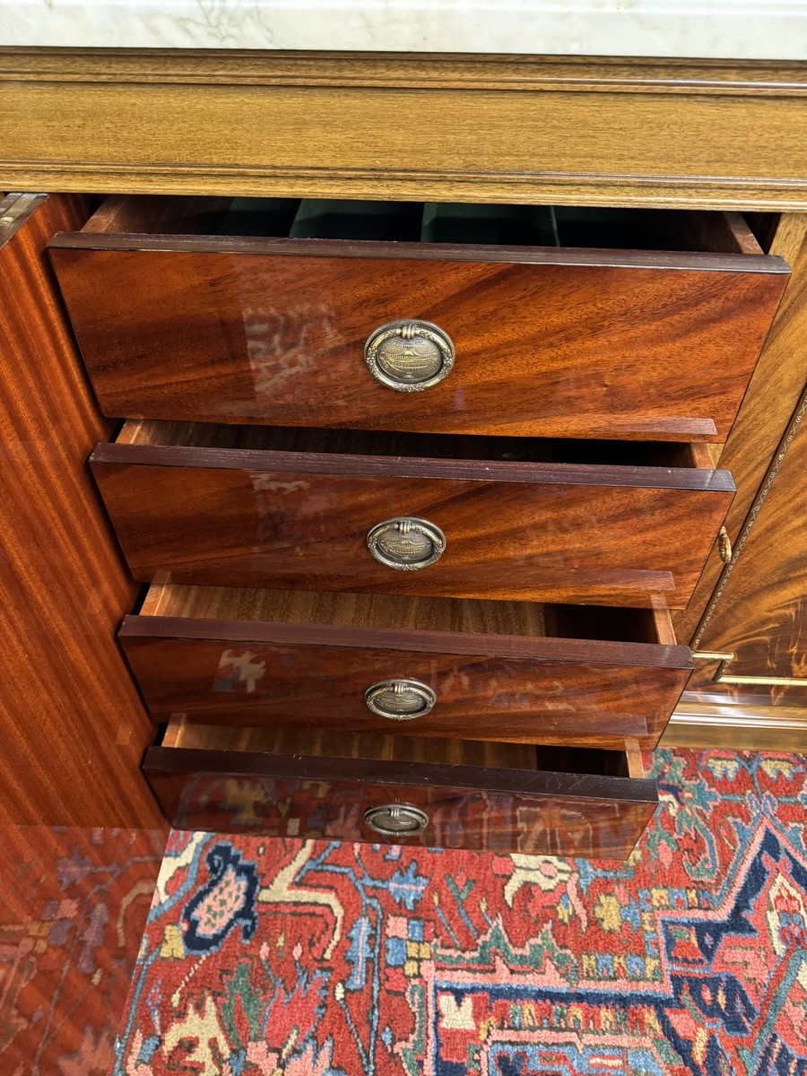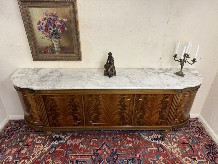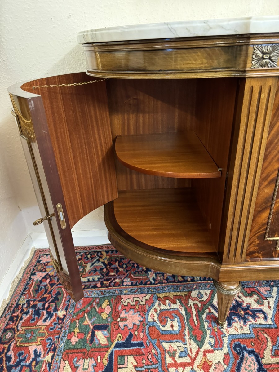 This exceptional quality French mahogany credenza has a fabulous shaped carrarra white marble top. Below are five cupboard doors the end doors are beautifully curved in shape. Each of the doors have gilt brass decoration. The left-hand curved door opens to reveal a curved shelf. The door next to the curved left side door opens to reveal four drawers, each drawer having an ornate carved handle. The central and right side front door open to reveal ample cupboard storage. The right-hand shaped door opens to reveal two mirrored shelves, the shelves having brass decoration to the front. All doors are lockable and have their own key. This outstanding quality credenza has a striking platina and stands on four turned legs with gilt brass feet.
