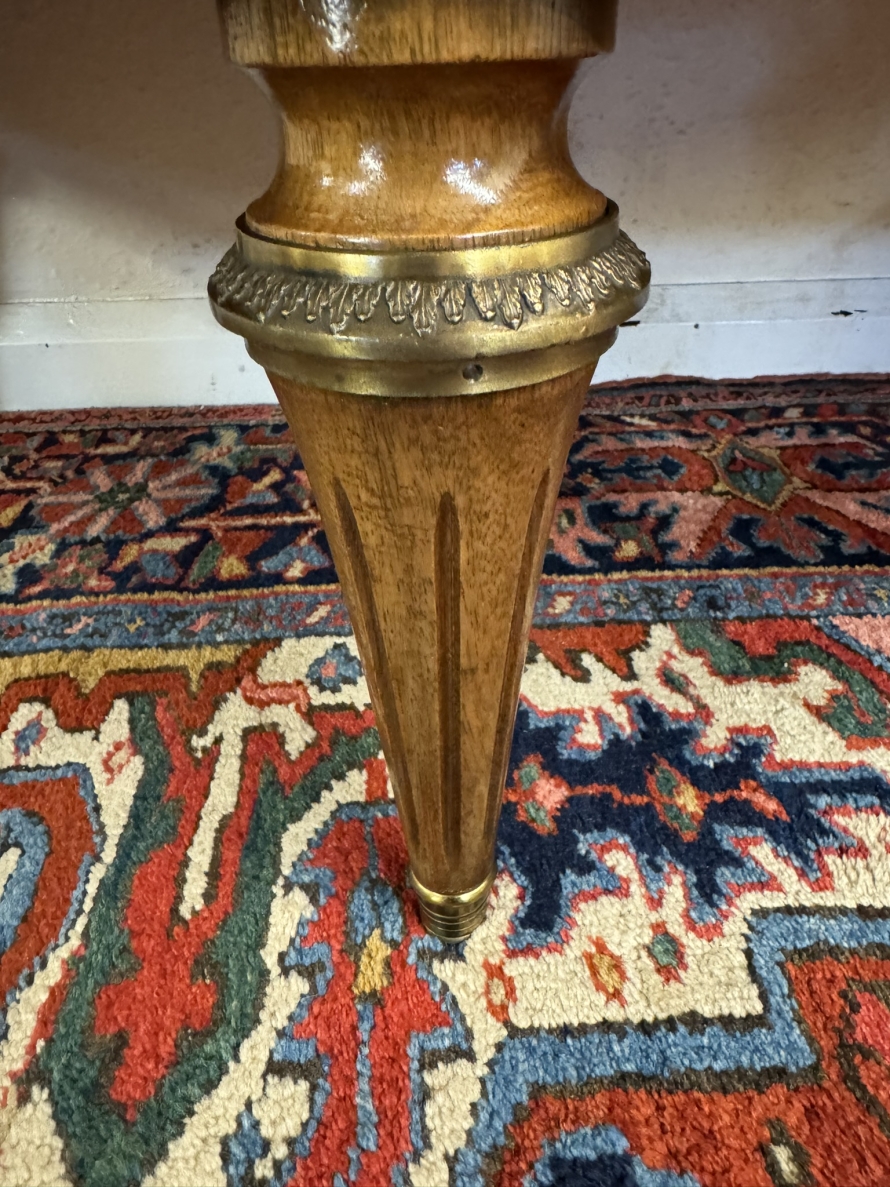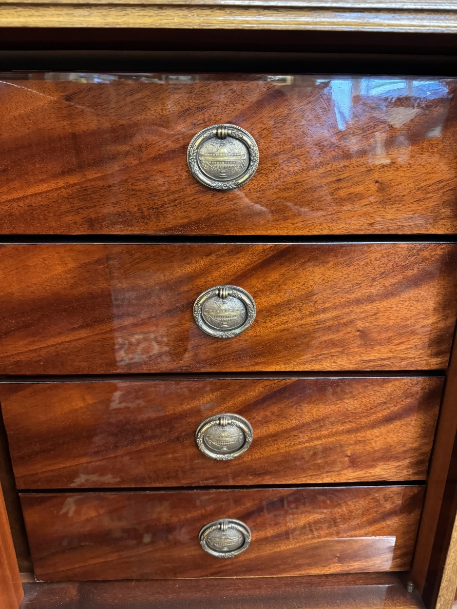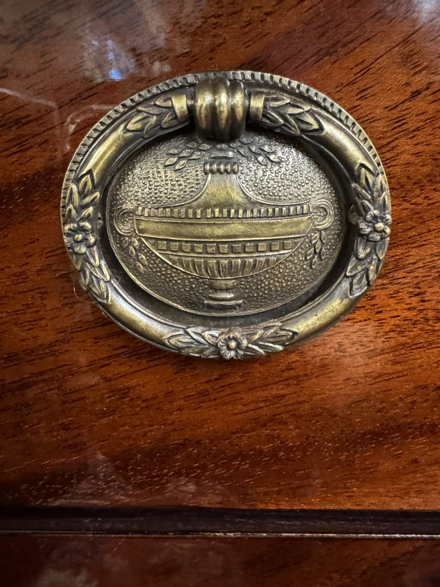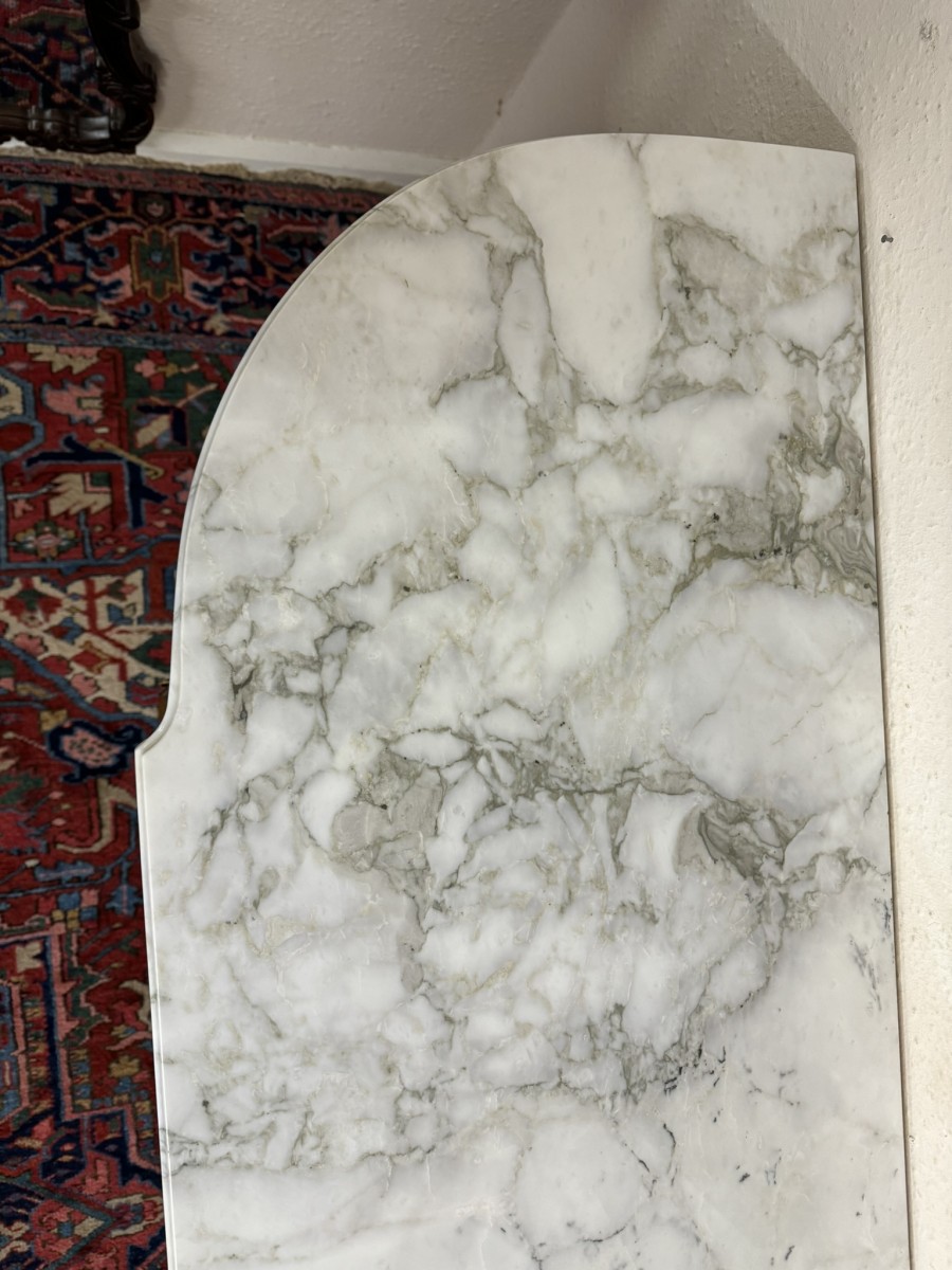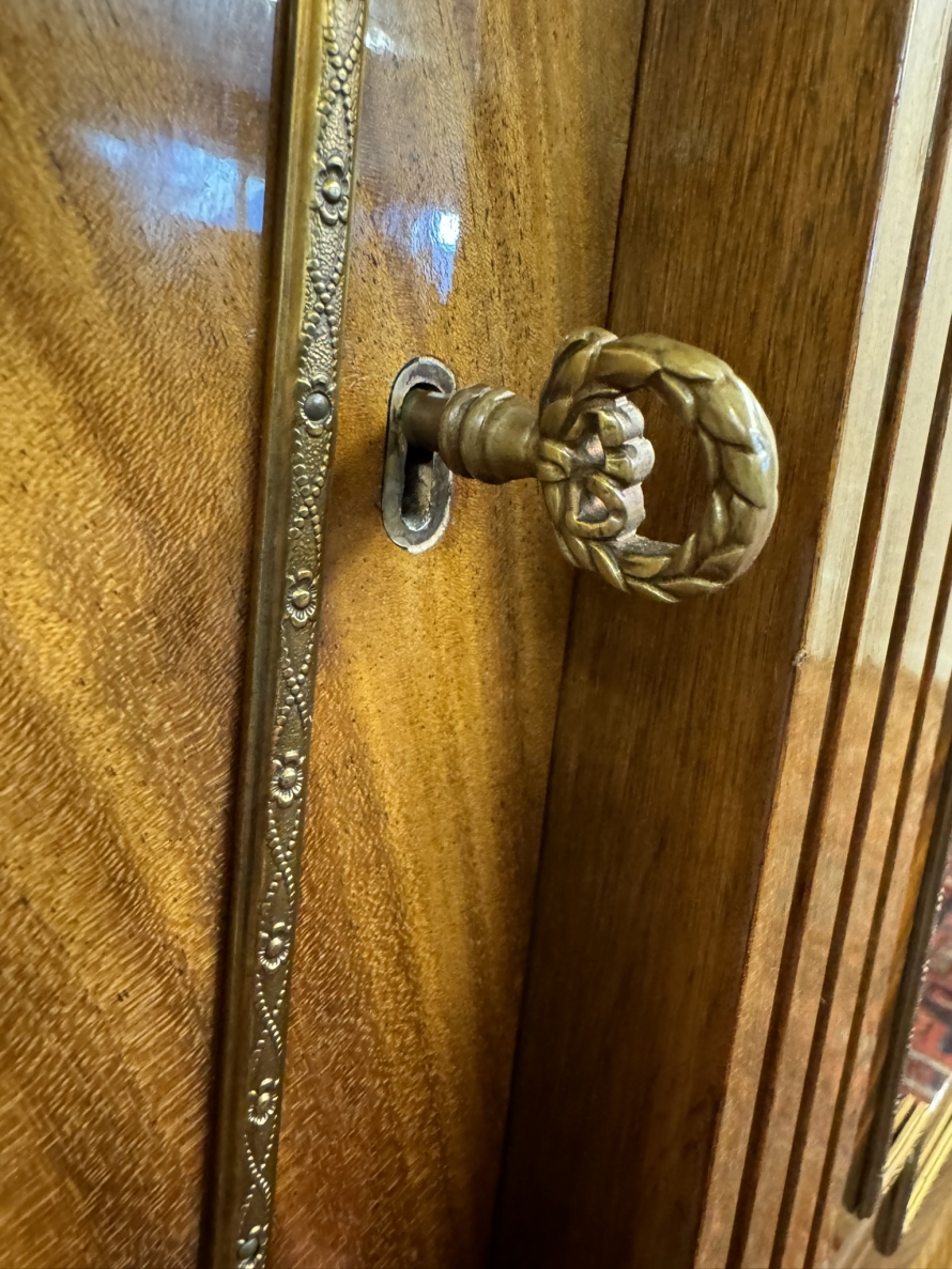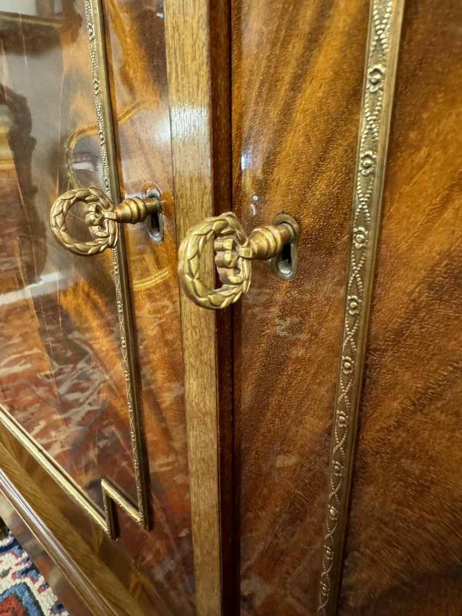 This exceptional quality French mahogany credenza has a fabulous shaped carrarra white marble top. Below are five cupboard doors the end doors are beautifully curved in shape. Each of the doors have gilt brass decoration. The left-hand curved door opens to reveal a curved shelf. The door next to the curved left side door opens to reveal four drawers, each drawer having an ornate carved handle. The central and right side front door open to reveal ample cupboard storage. The right-hand shaped door opens to reveal two mirrored shelves, the shelves having brass decoration to the front. All doors are lockable and have their own key. This outstanding quality credenza has a striking platina and stands on four turned legs with gilt brass feet.