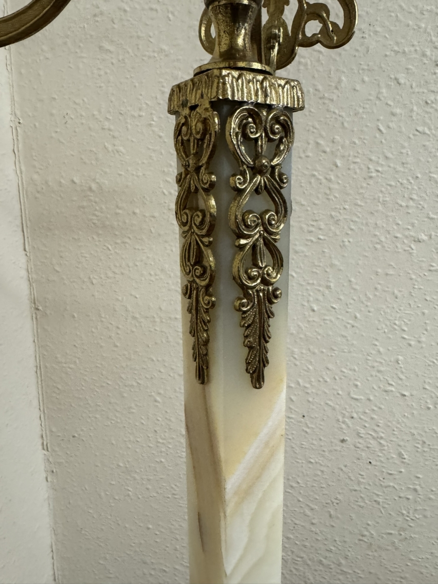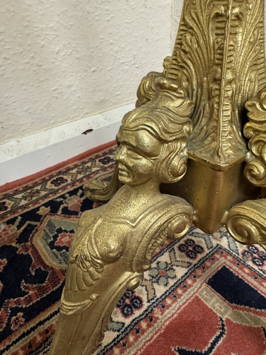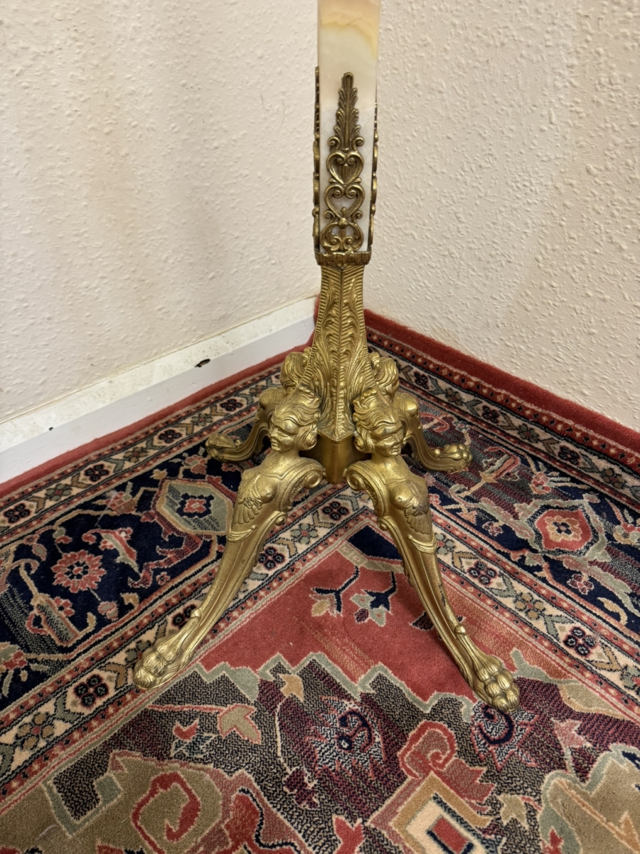 This fabulous French stand dates 1950. Ornate revolving brass top , onyx stem with ornate gilt mounts and standing on mermaid legs with paw feet.