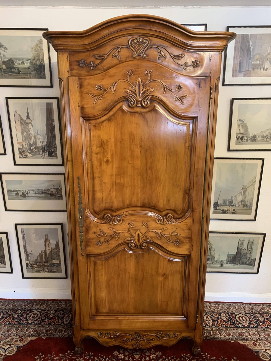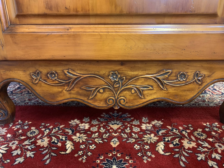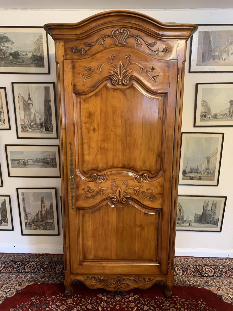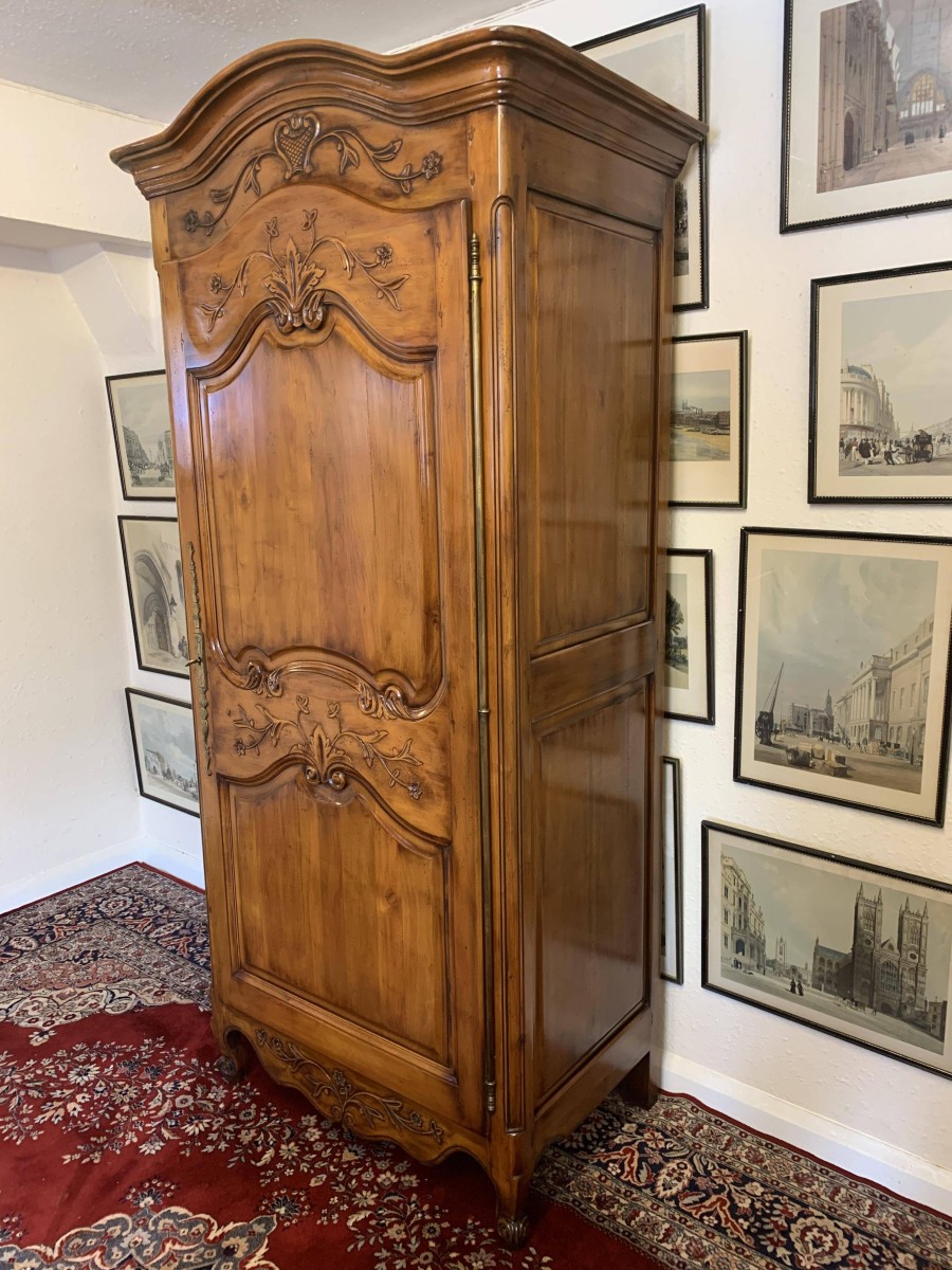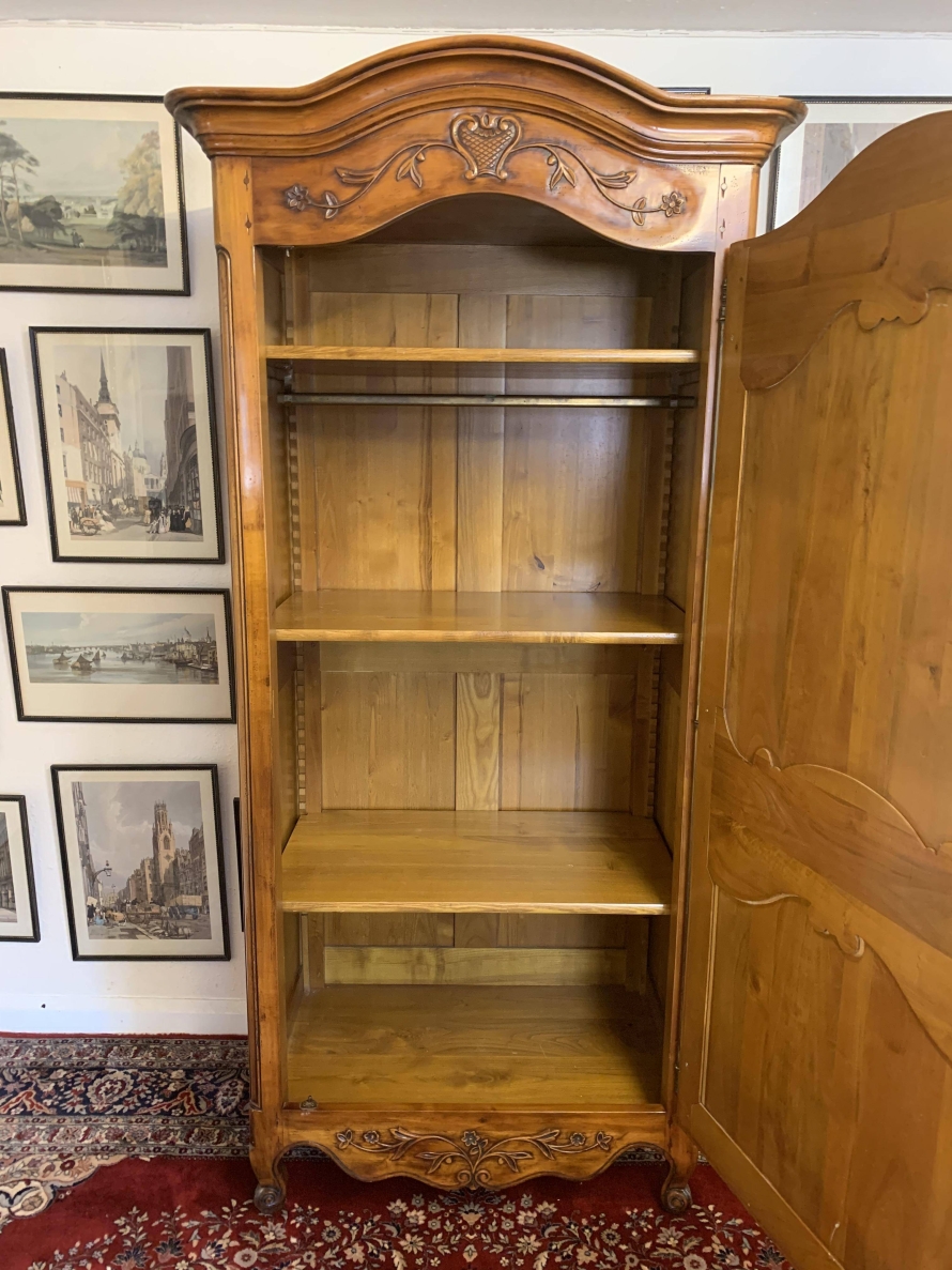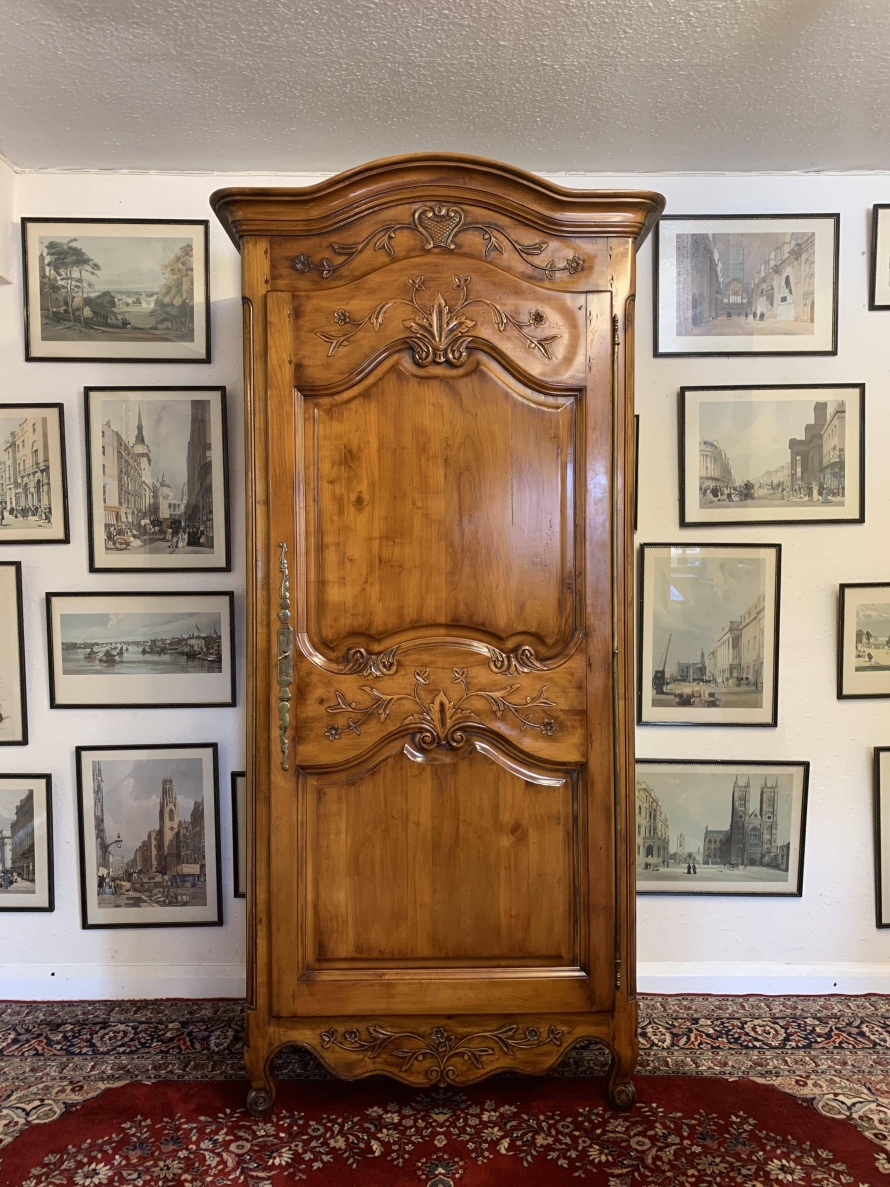 A fruitwood French Armoire oozing style and quality. The shaped oversailing top has a fine organic foliage carveing to the front. Below is a lockable recessed panelled door which also has fine carvings. The door opens to reveal three removable/adjustable shelves, the top shelf has a hanging rail below. Recessed panelled sides, shaped skirt with central ornate carving. This stunning French Armoire stands on two carved cabriole legs to the front.