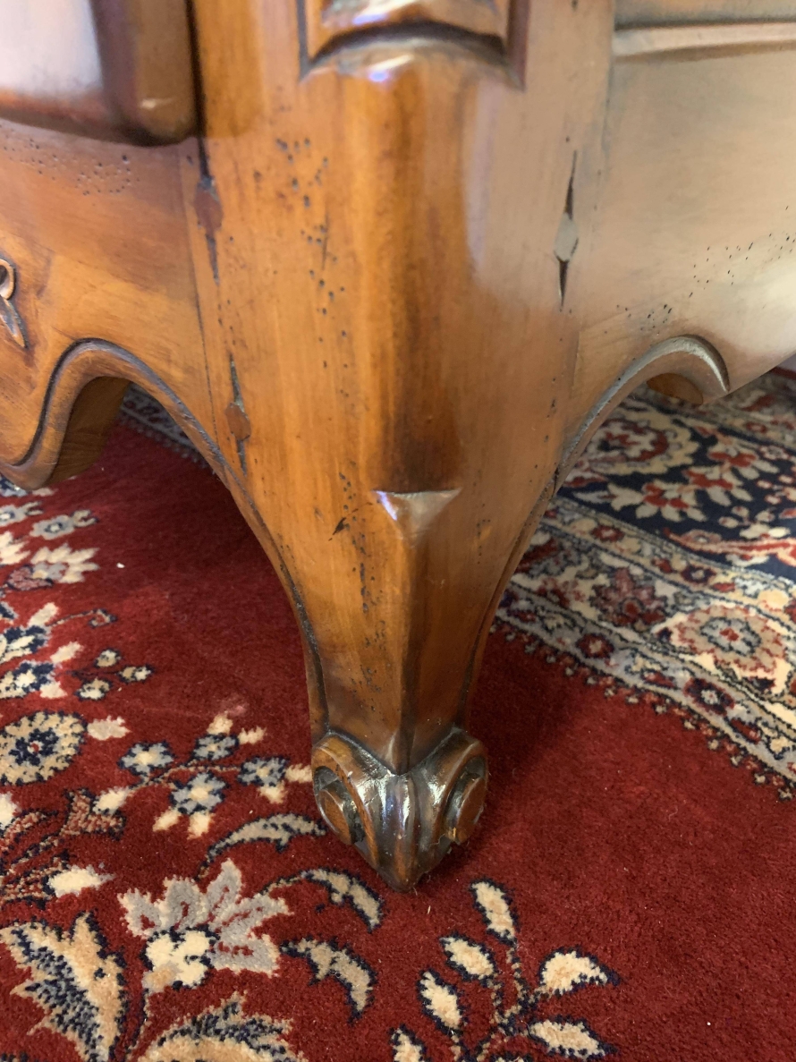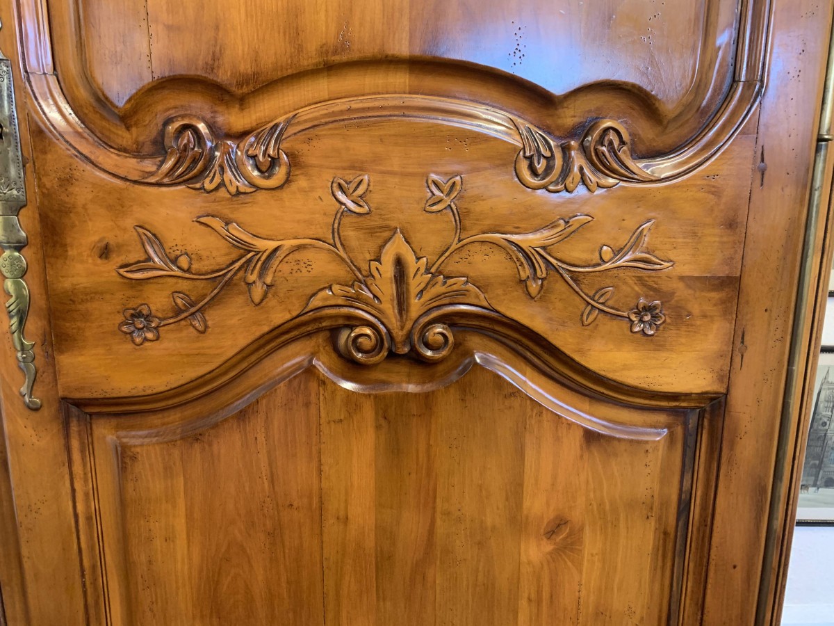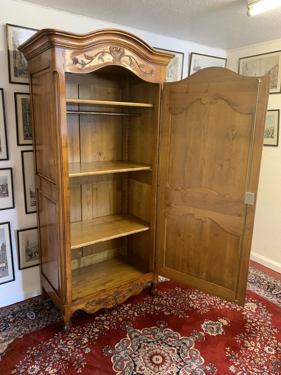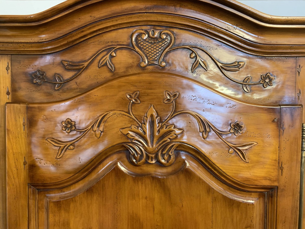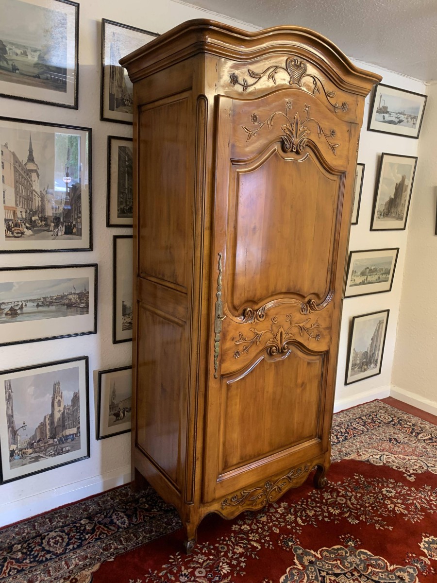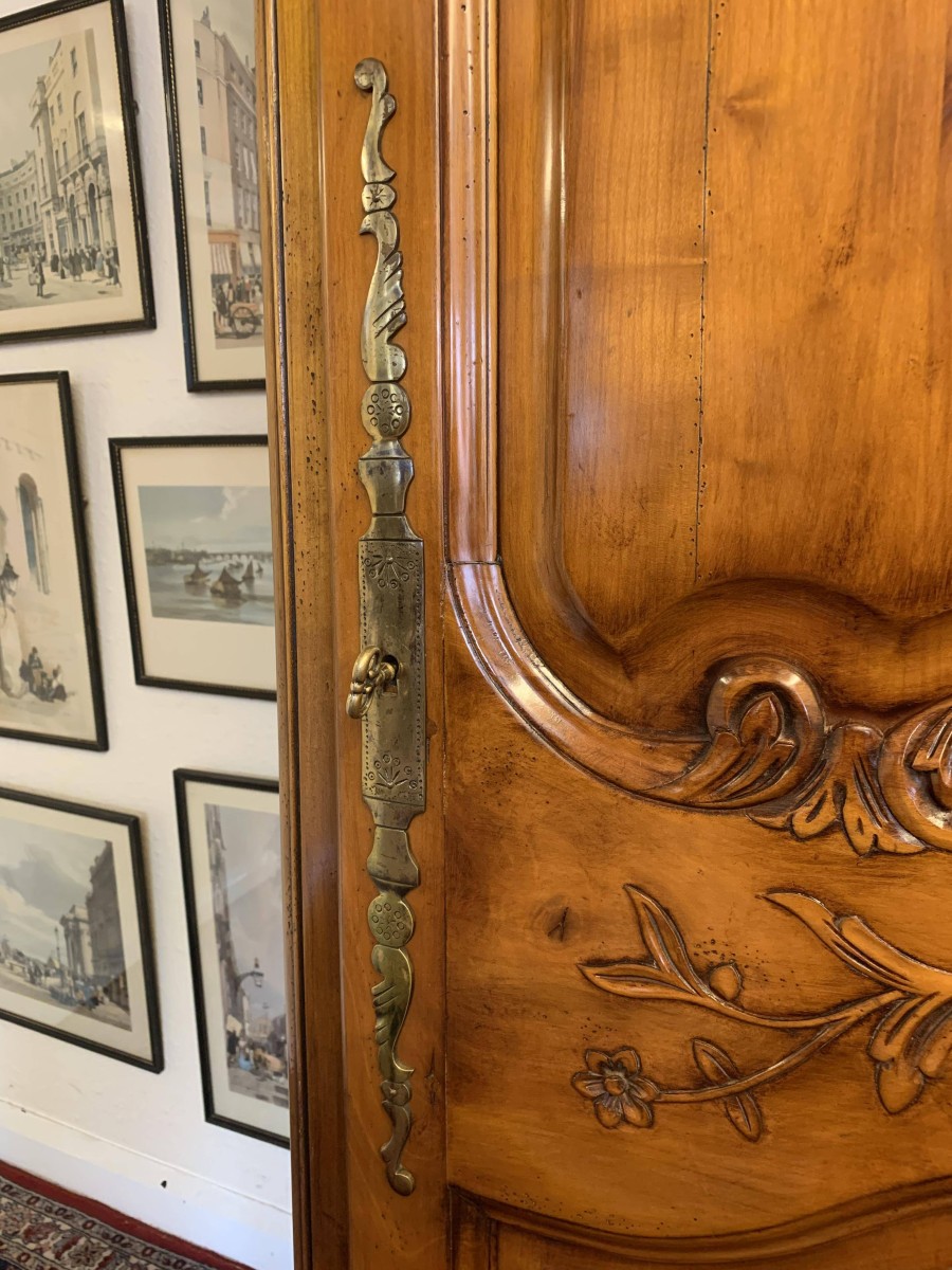 A fruitwood French Armoire oozing style and quality. The shaped oversailing top has a fine organic foliage carveing to the front. Below is a lockable recessed panelled door which also has fine carvings. The door opens to reveal three removable/adjustable shelves, the top shelf has a hanging rail below. Recessed panelled sides, shaped skirt with central ornate carving. This stunning French Armoire stands on two carved cabriole legs to the front.