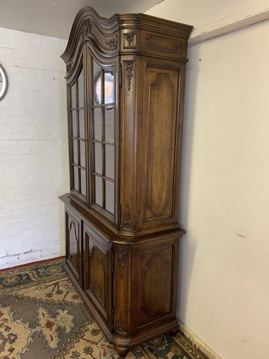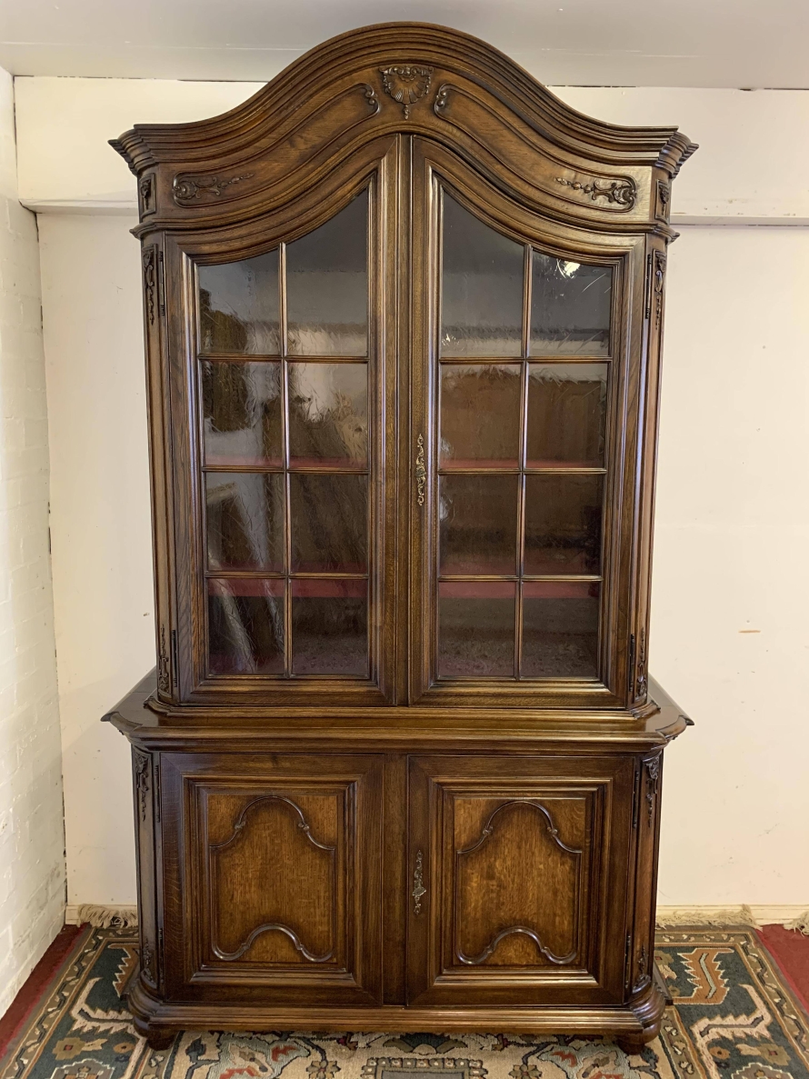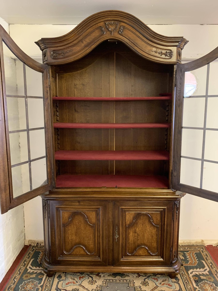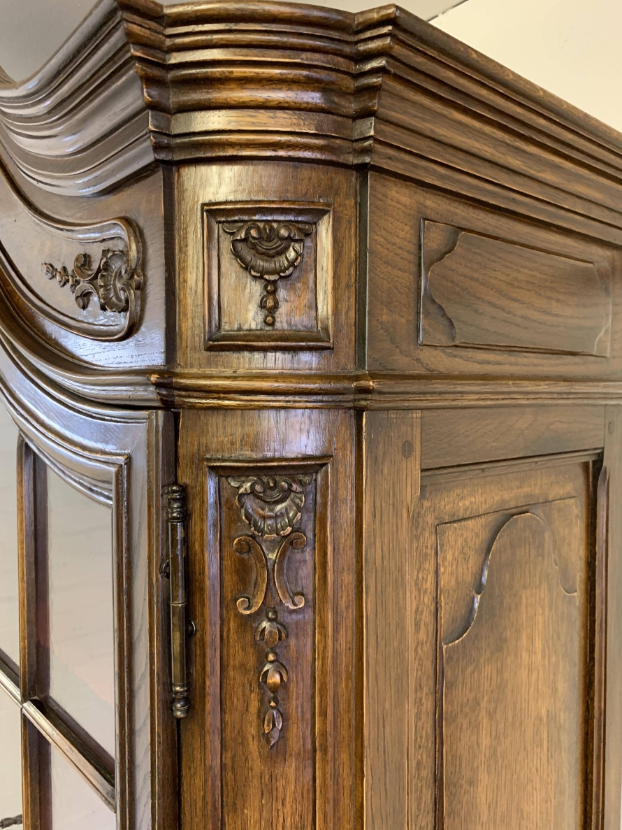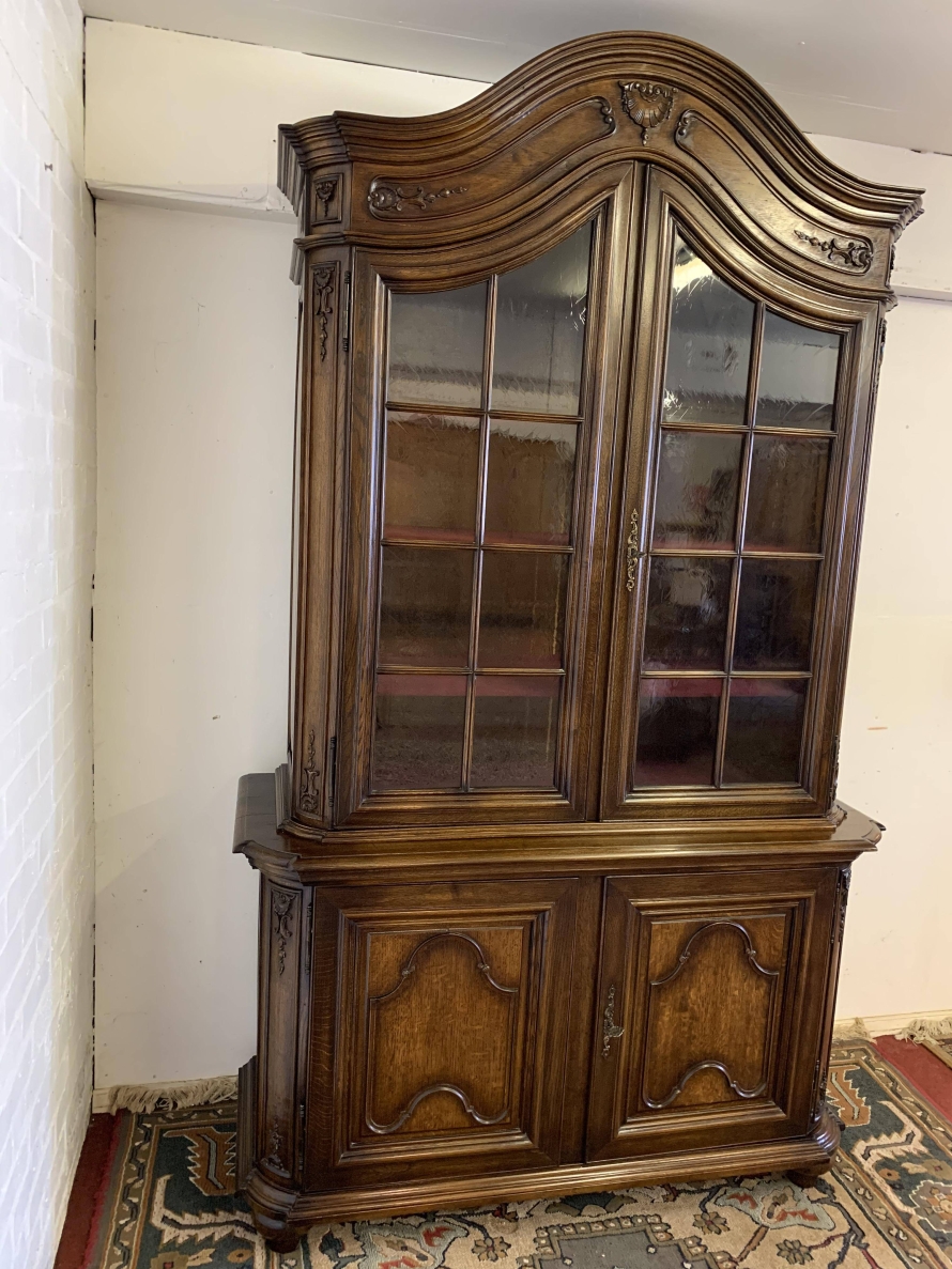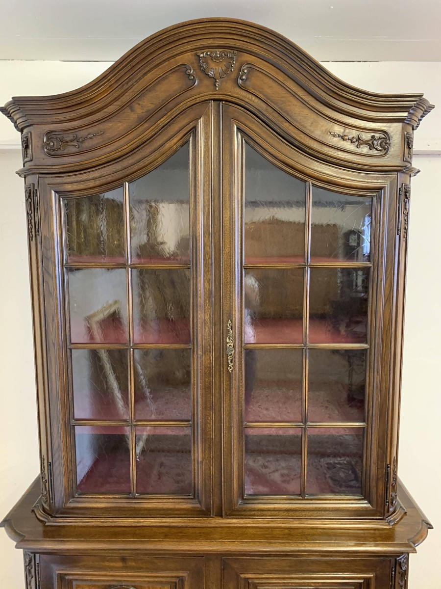 The arch shaped top has decorative carving to the front. Below are a pair of lockable shaped glazed doors, the doors open to reveal three adjustable and removable shelves. Carved and canted at the front with shaped recessed panels to the sides. The base has two shaped recessed panelled lockable doors, the doors open to reveal an adjustable shelf. The base section is also canted at the front with carvings and has shaped recessed panelled sides. This beautiful cabinet sits on two beautifully turned feet to the front. Please note this French cabinet is made entirely of solid oak.