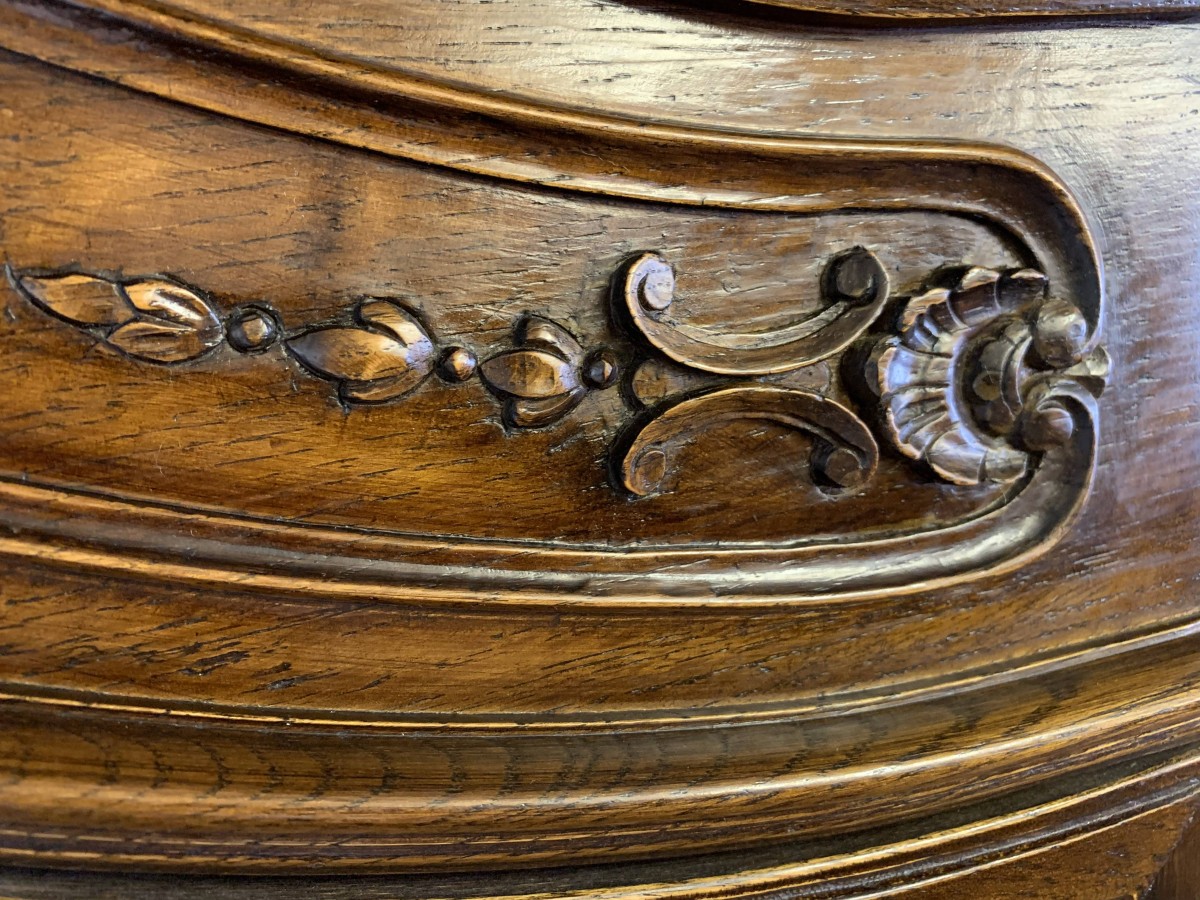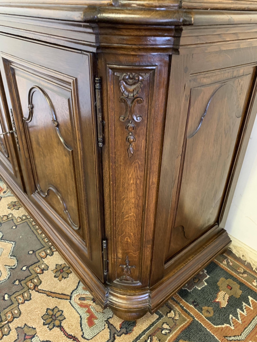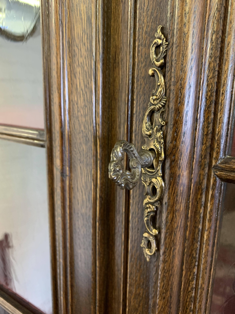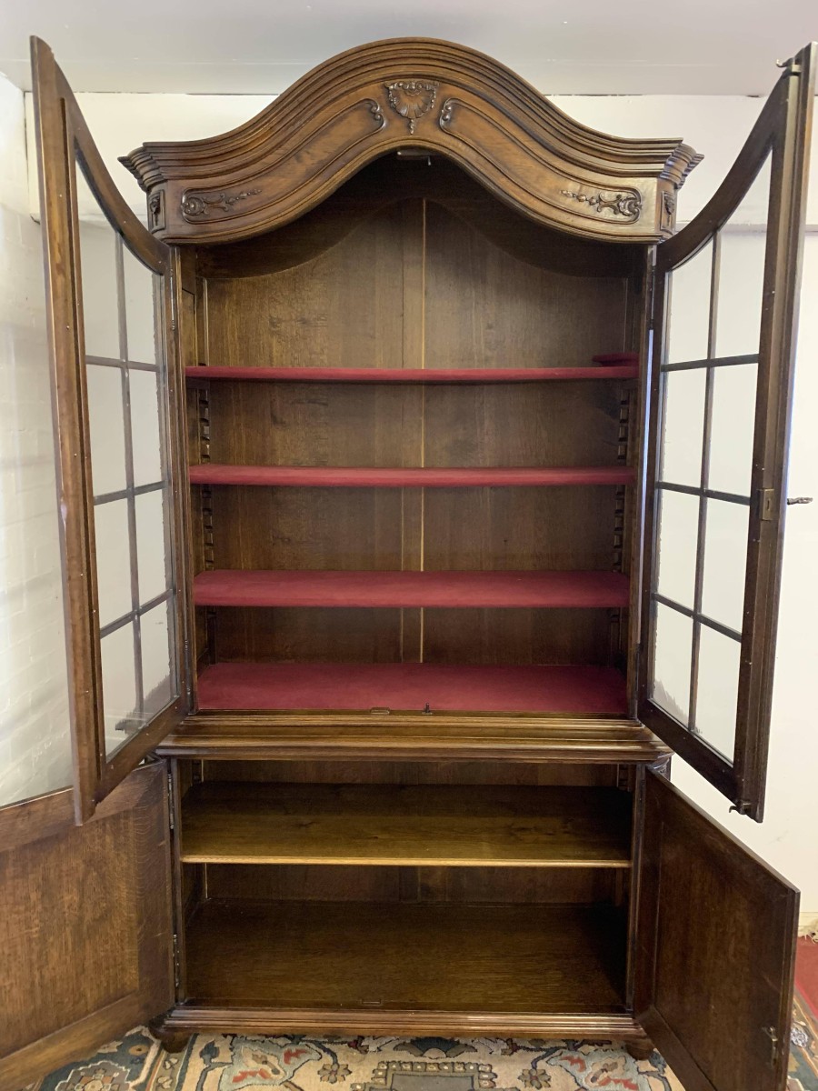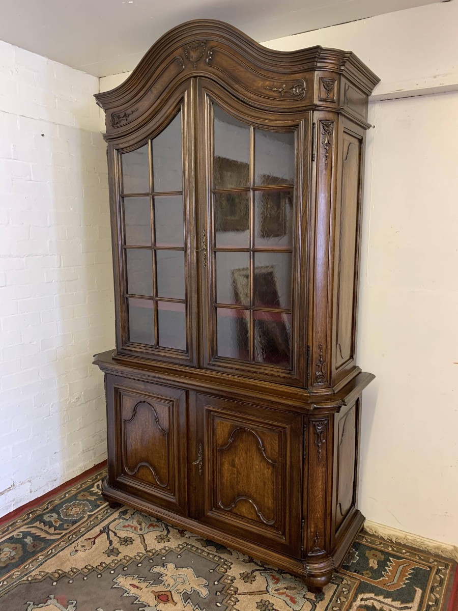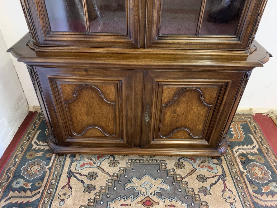 The arch shaped top has decorative carving to the front. Below are a pair of lockable shaped glazed doors, the doors open to reveal three adjustable and removable shelves. Carved and canted at the front with shaped recessed panels to the sides. The base has two shaped recessed panelled lockable doors, the doors open to reveal an adjustable shelf. The base section is also canted at the front with carvings and has shaped recessed panelled sides. This beautiful cabinet sits on two beautifully turned feet to the front. Please note this French cabinet is made entirely of solid oak.