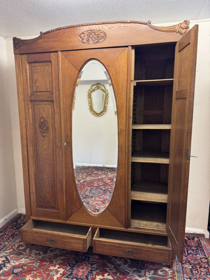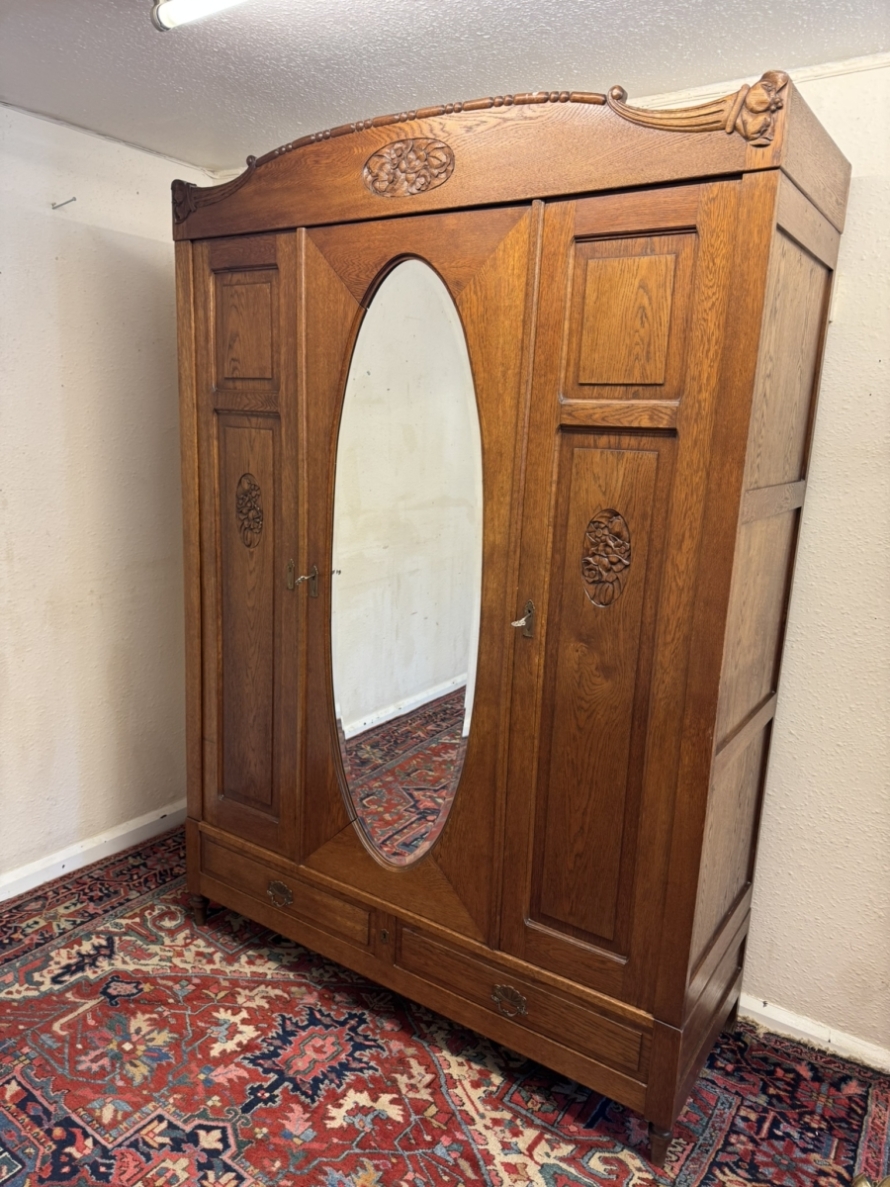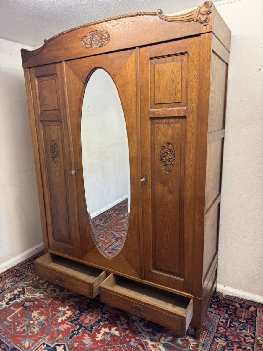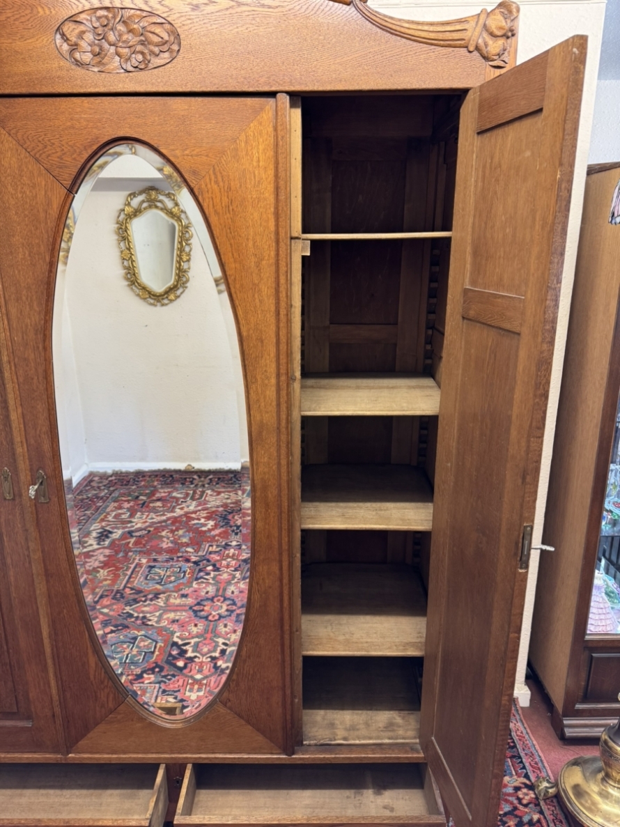 This fabulous wardrobe is in excellent condition and dates circa 1920. The over sailing carved top up sits above a central mirrored door which is flanked by a pair of carved doors. The left-hand door and central door open to reveal a hanging rail. The right-hand door opens to reveal four removable shelves. Two drawers below each with a brass handle. Recessed panelled sides and standing on turned feet to the front. Please note this armoire completely splits down for easy transportation and delivery into any home.