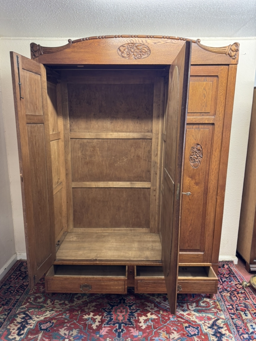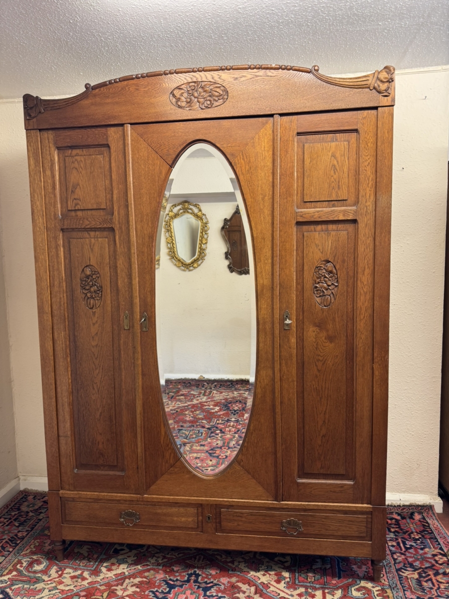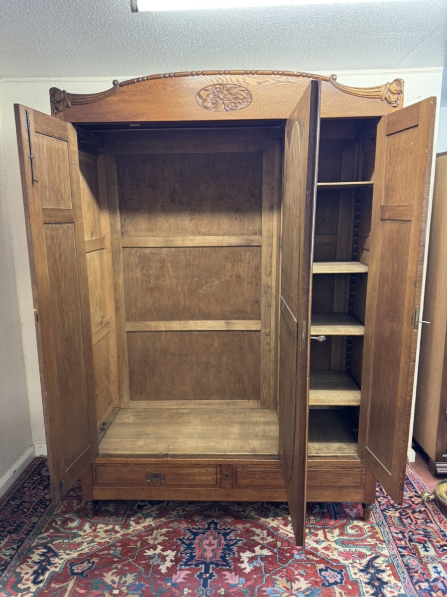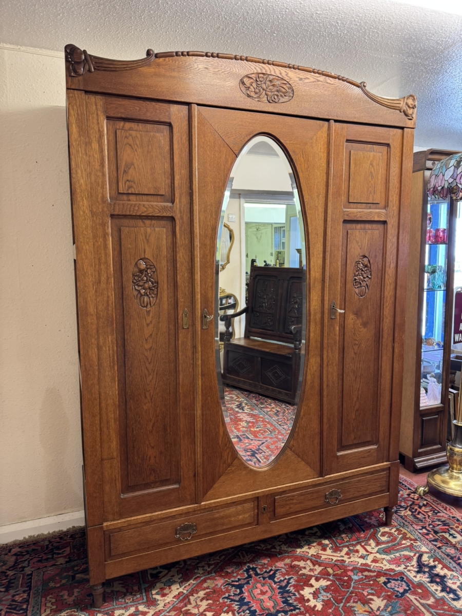 This fabulous wardrobe is in excellent condition and dates circa 1920. The over sailing carved top up sits above a central mirrored door which is flanked by a pair of carved doors. The left-hand door and central door open to reveal a hanging rail. The right-hand door opens to reveal four removable shelves. Two drawers below each with a brass handle. Recessed panelled sides and standing on turned feet to the front. Please note this armoire completely splits down for easy transportation and delivery into any home.