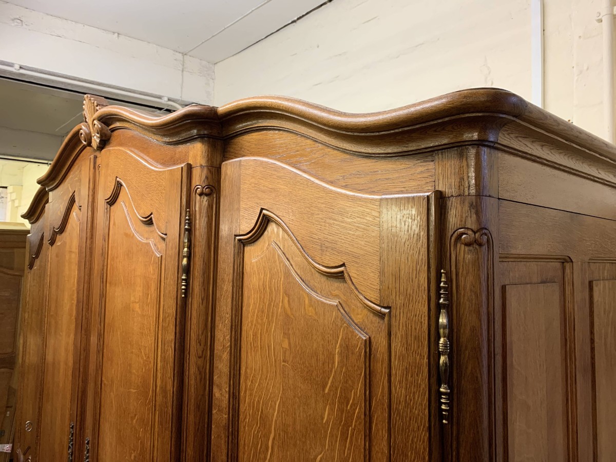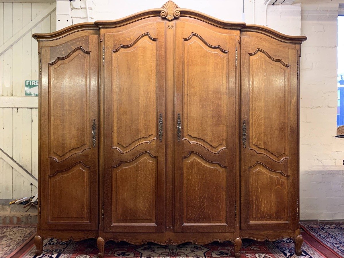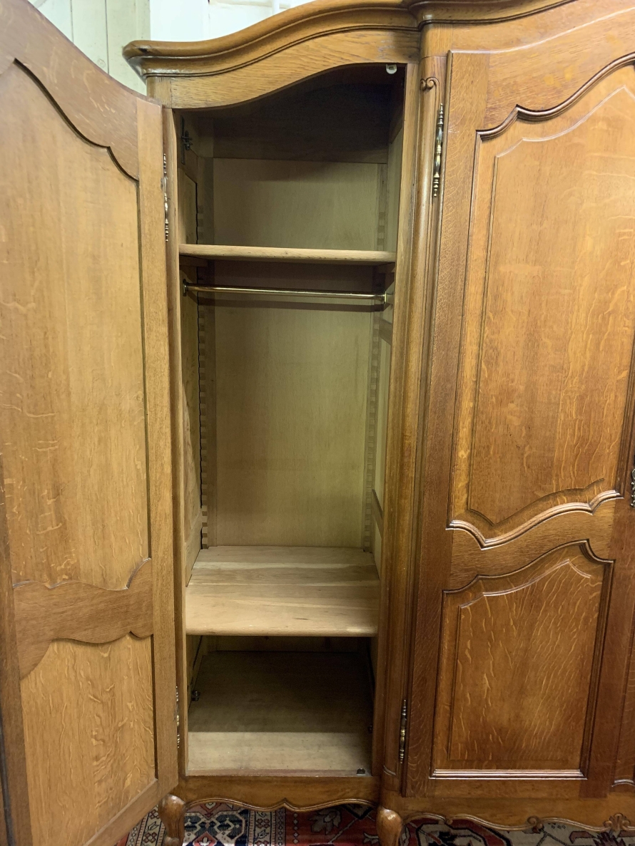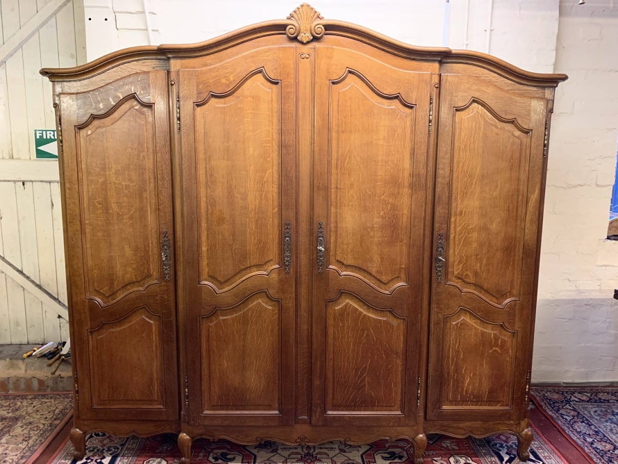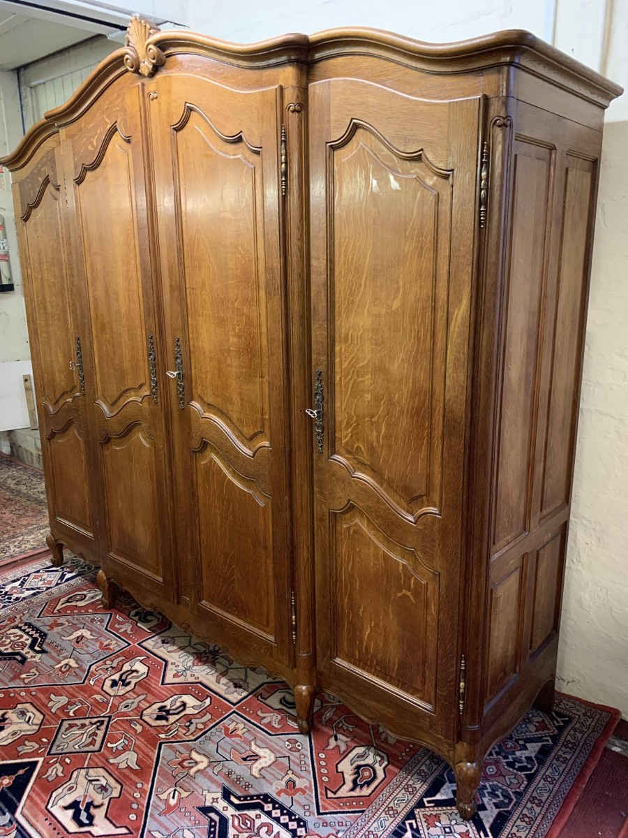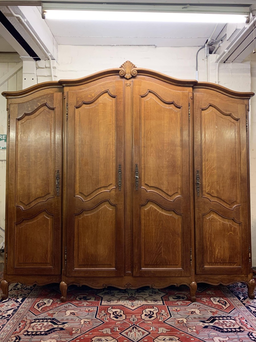 We are delighted to this fantastic four door armoire which is in excellent condition. The shaped over sailing top rises to a decorative central carving. Below are four recessed panelled lockable doors, the pair of central doors are brakefront. Each door has brass hinges and decorative brass escutcheons. The left-hand door opens to reveal a shelf above a brass hanging rail with another shelf below, both shelves are removable. The central pair of brakefront doors open to reveal a handy shelf above a brass hanging rail. The right-hand door opens to reveal three adjustable and removable shelves. Recessed panelled sides, shaped skirt with central decoration, this beautiful armoire stands proud on four shaped carved cabriole legs to the front. A fine armoire which offers ample storage with the added advantage of splitting down for easy transportation and delivery into any home.