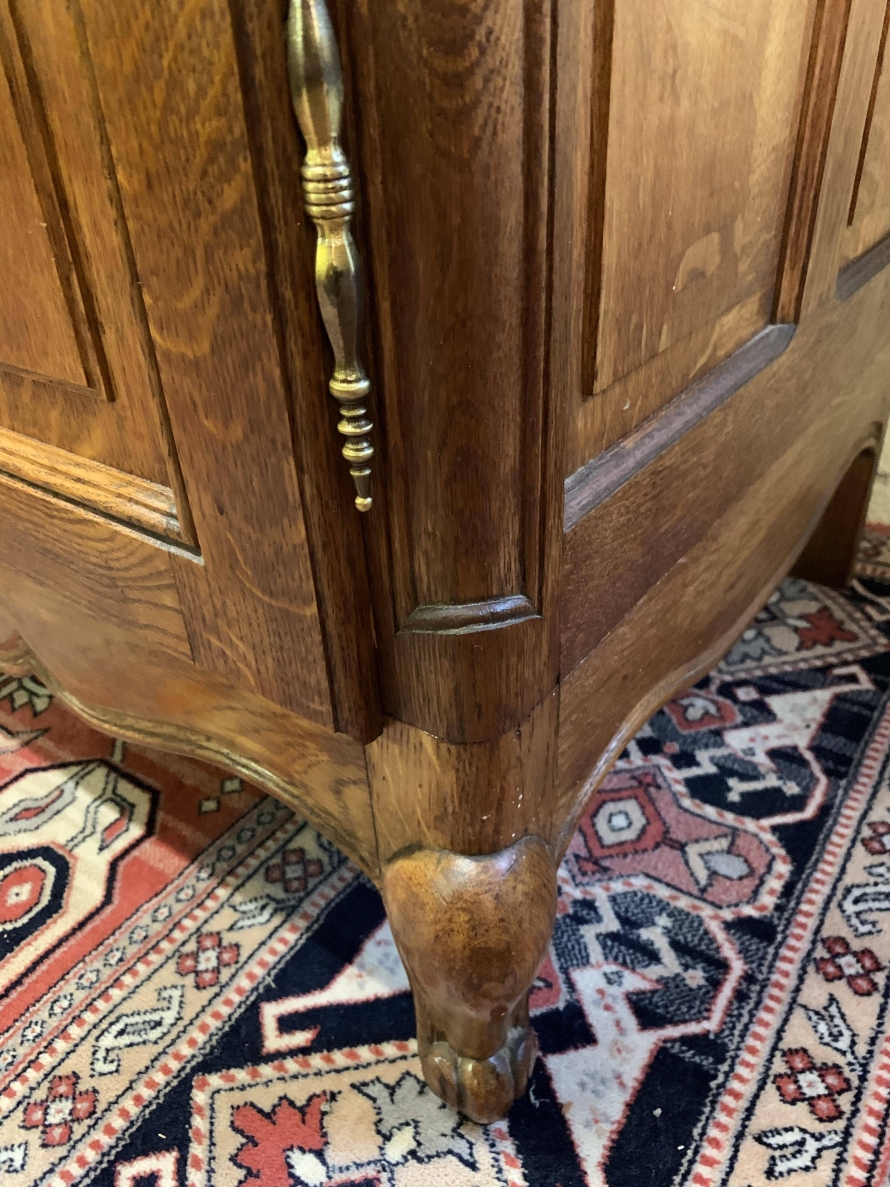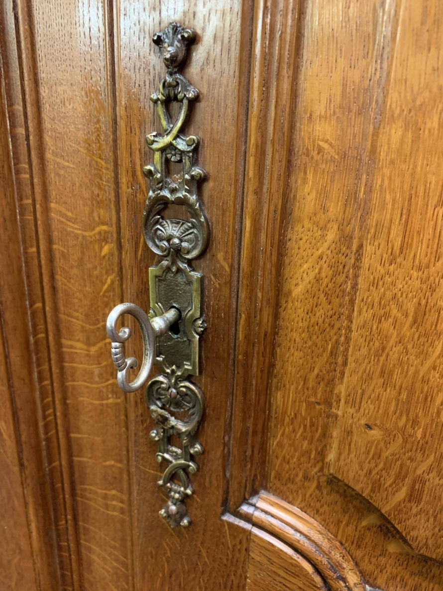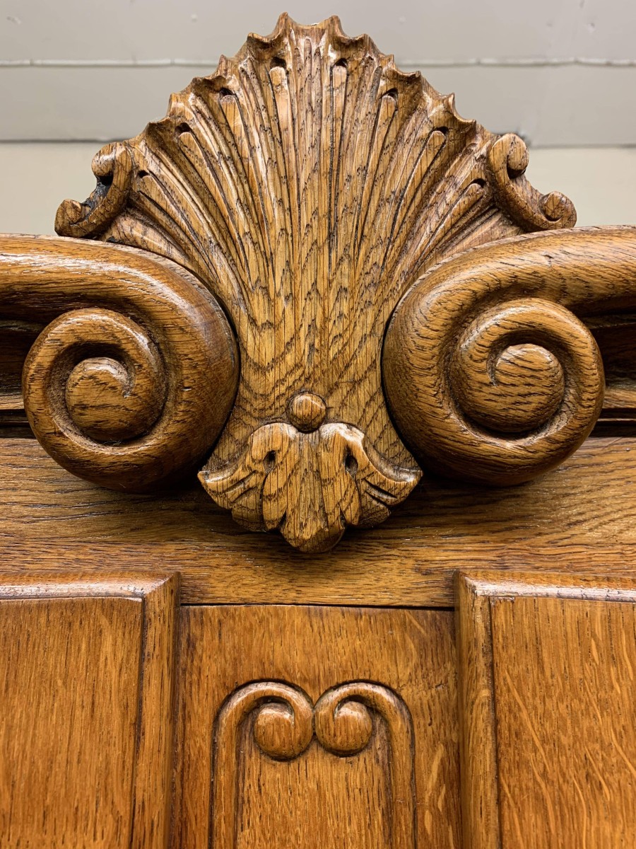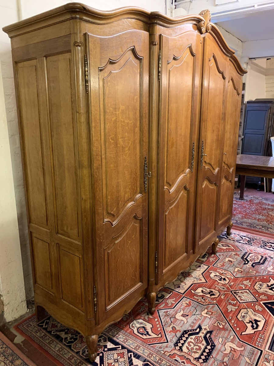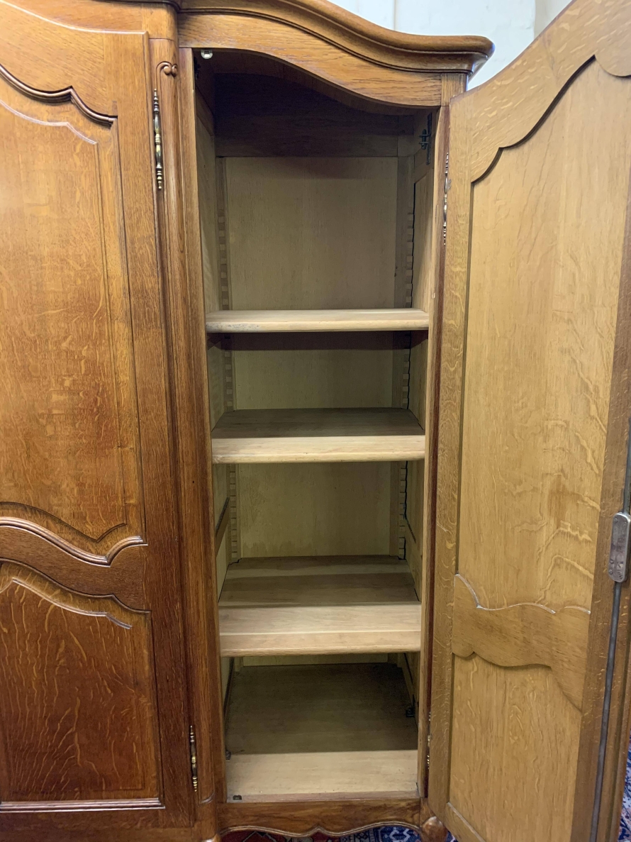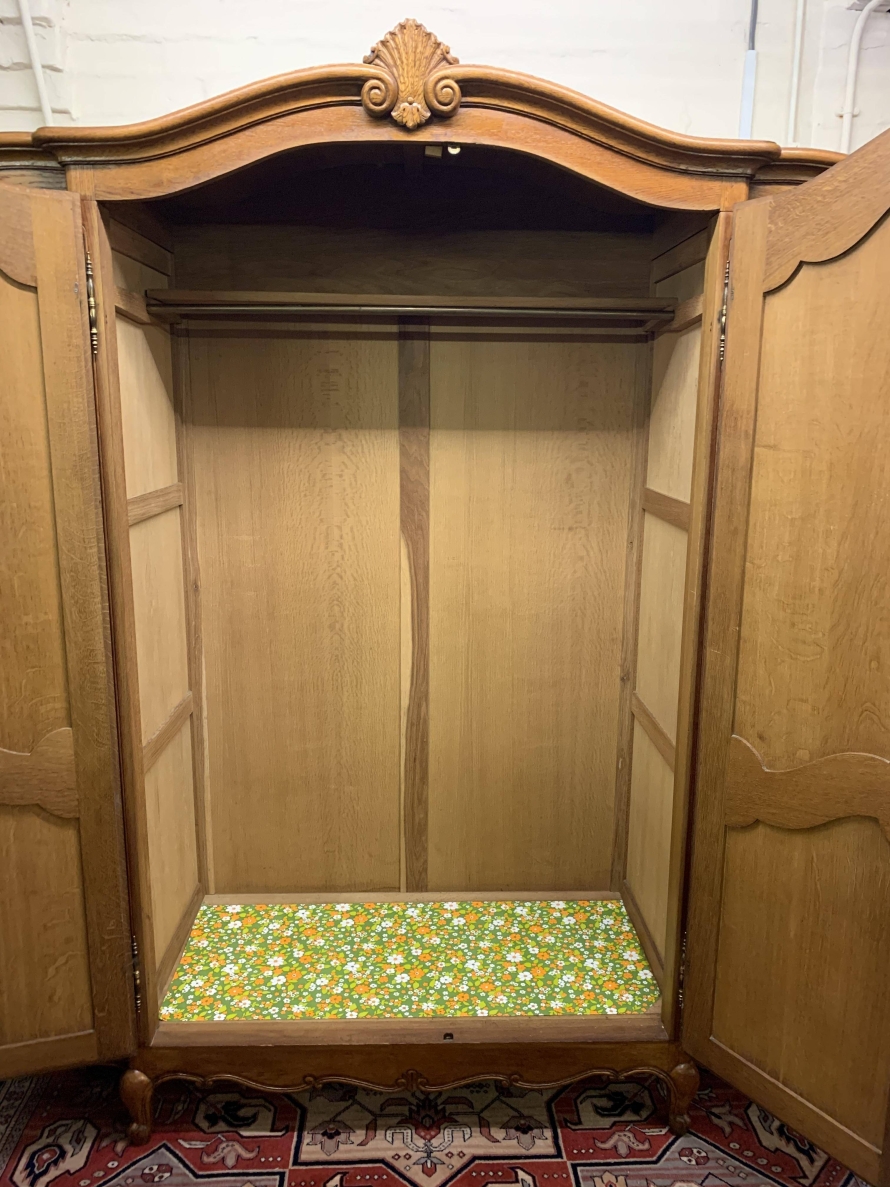 We are delighted to this fantastic four door armoire which is in excellent condition. The shaped over sailing top rises to a decorative central carving. Below are four recessed panelled lockable doors, the pair of central doors are brakefront. Each door has brass hinges and decorative brass escutcheons. The left-hand door opens to reveal a shelf above a brass hanging rail with another shelf below, both shelves are removable. The central pair of brakefront doors open to reveal a handy shelf above a brass hanging rail. The right-hand door opens to reveal three adjustable and removable shelves. Recessed panelled sides, shaped skirt with central decoration, this beautiful armoire stands proud on four shaped carved cabriole legs to the front. A fine armoire which offers ample storage with the added advantage of splitting down for easy transportation and delivery into any home.