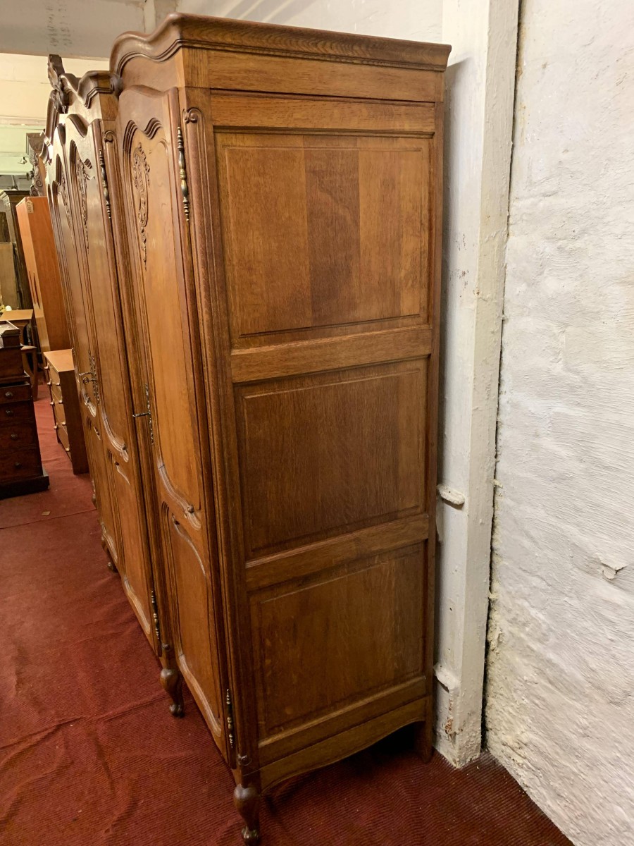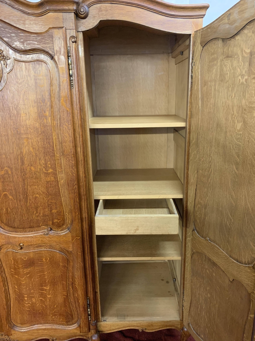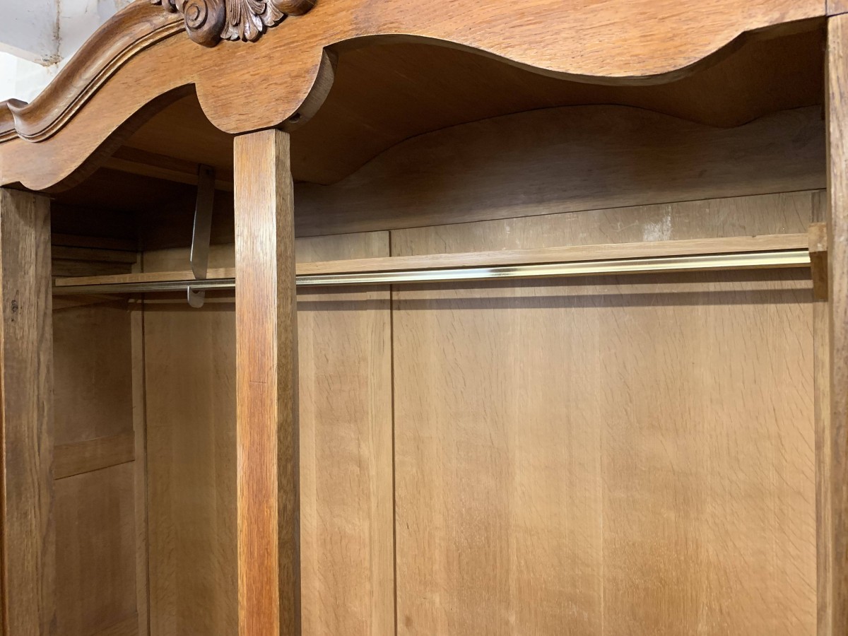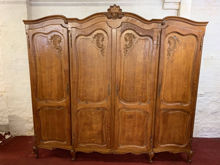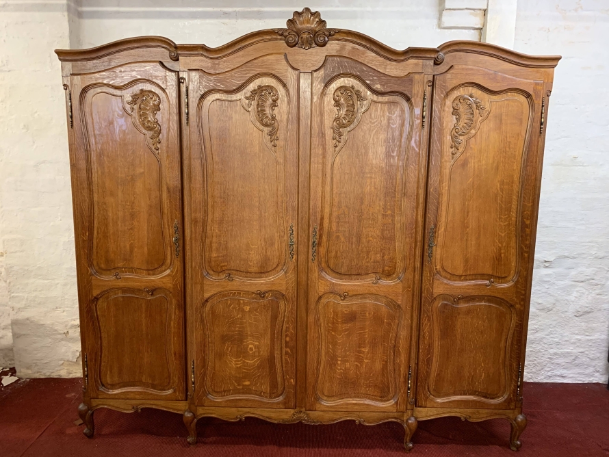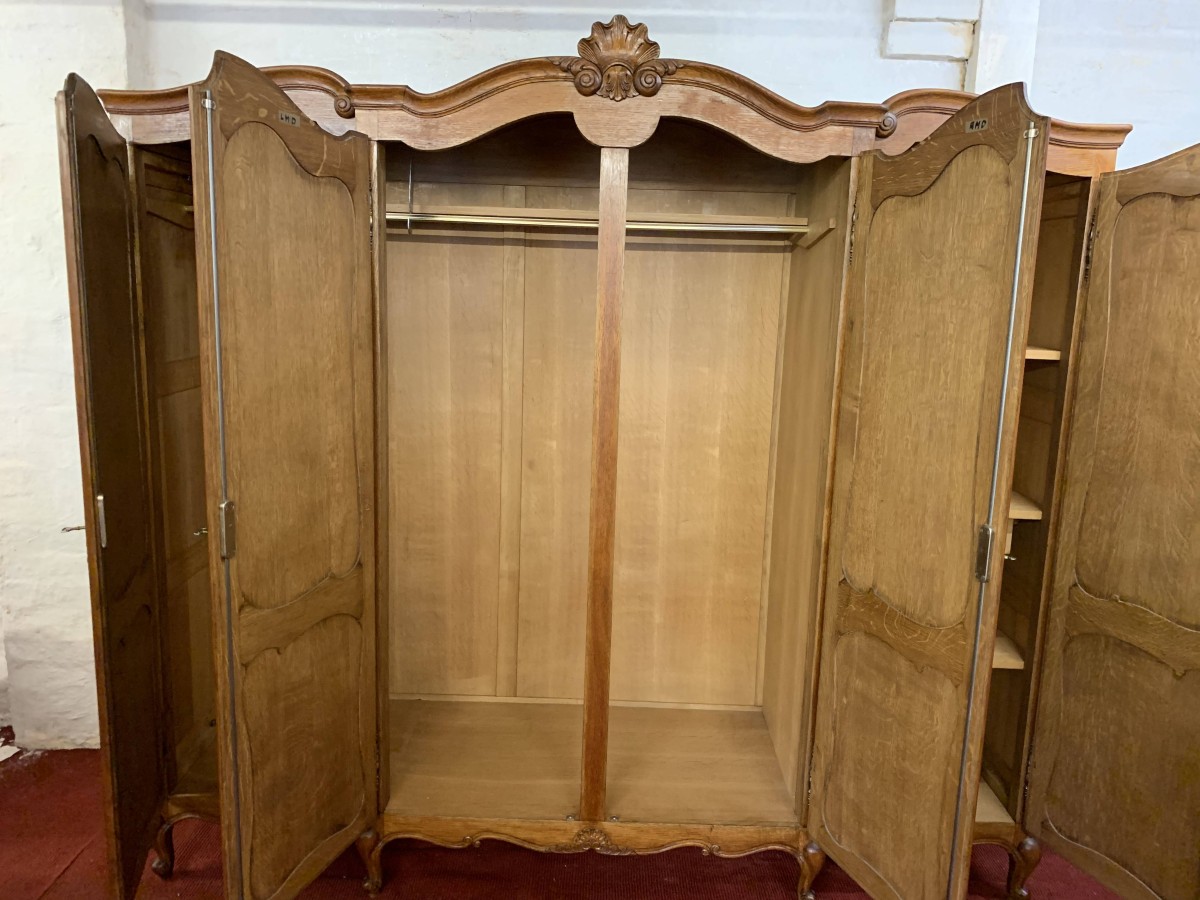 The stylish shaped top rises to ornate central carving. Below are four carved recessed panelled oak lockable doors,the pair of central doors being breakfront. Each door has brass hinges, escutcheon and key. The left hand door and pair of central brakefront doors open to reveal a wooden shelf above a brass hanging rail. The right-hand door opens to reveal three removable shelves, there is a drawer below the middle shelf. Recessed panelled sides, shaped skirt with central ornate carving. This fantastic wardrobe sits on four carved cabriole legs to the front. Please note the wardrobe splits down for easy transportation and delivery.
